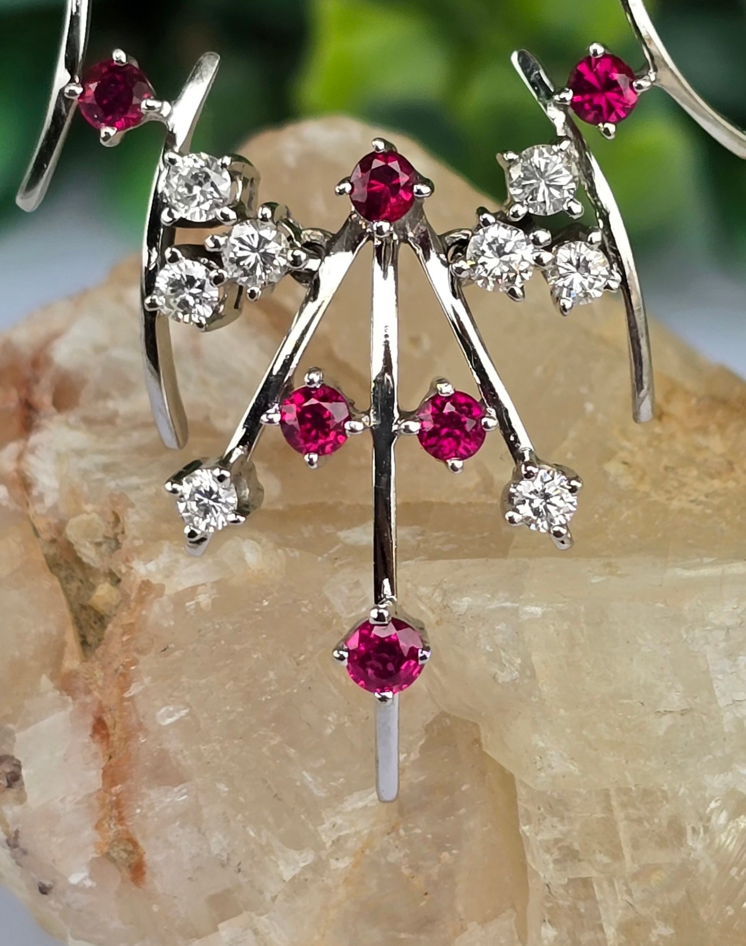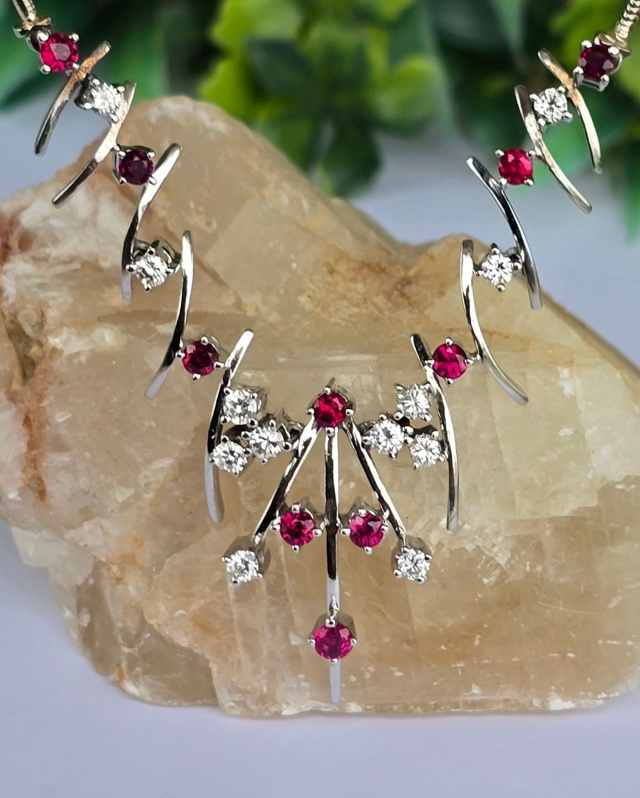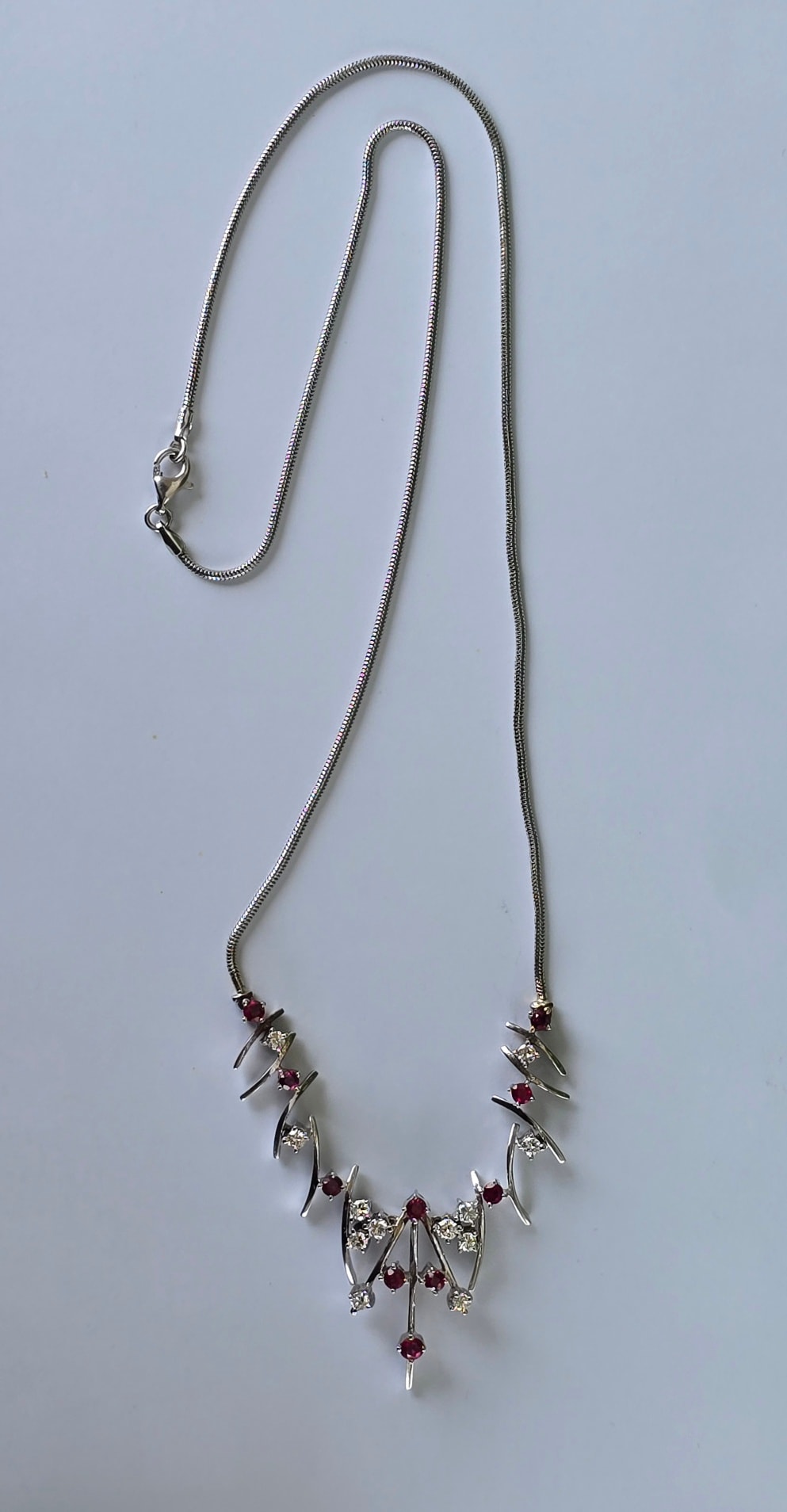 Colier vechi spectaculos, din aur de 14K, cu 10 rubine și 12 diamante (0.75ct) naturale de calitate superioară.