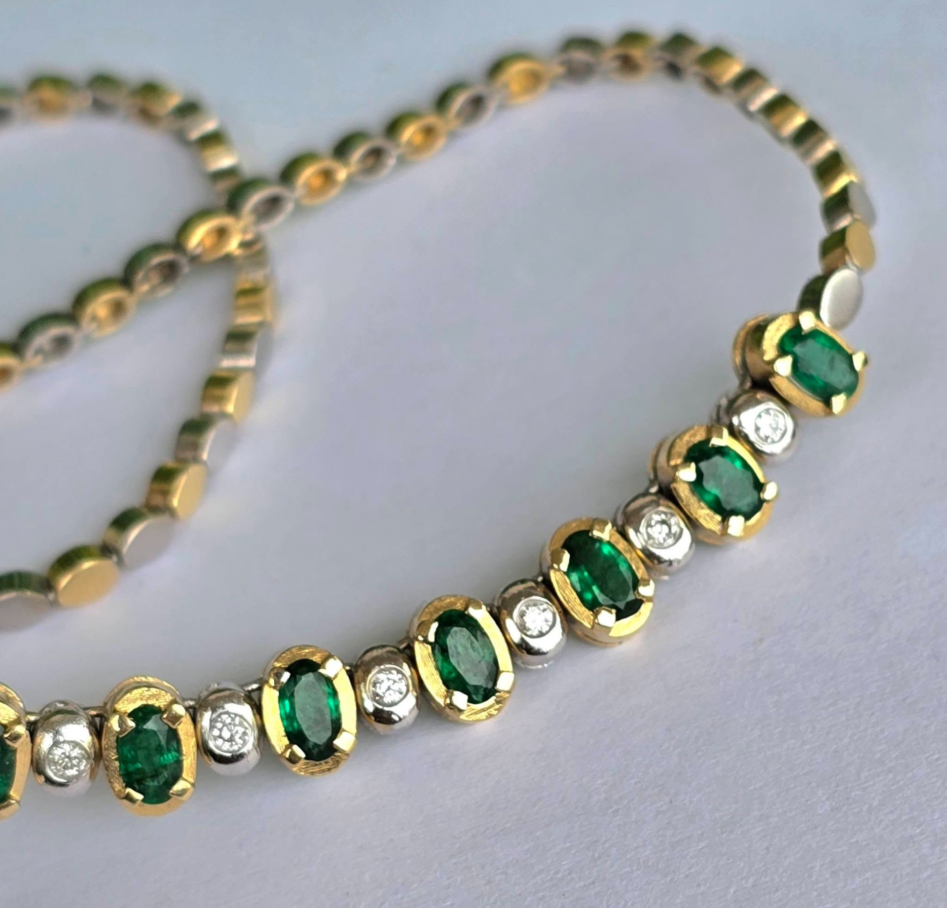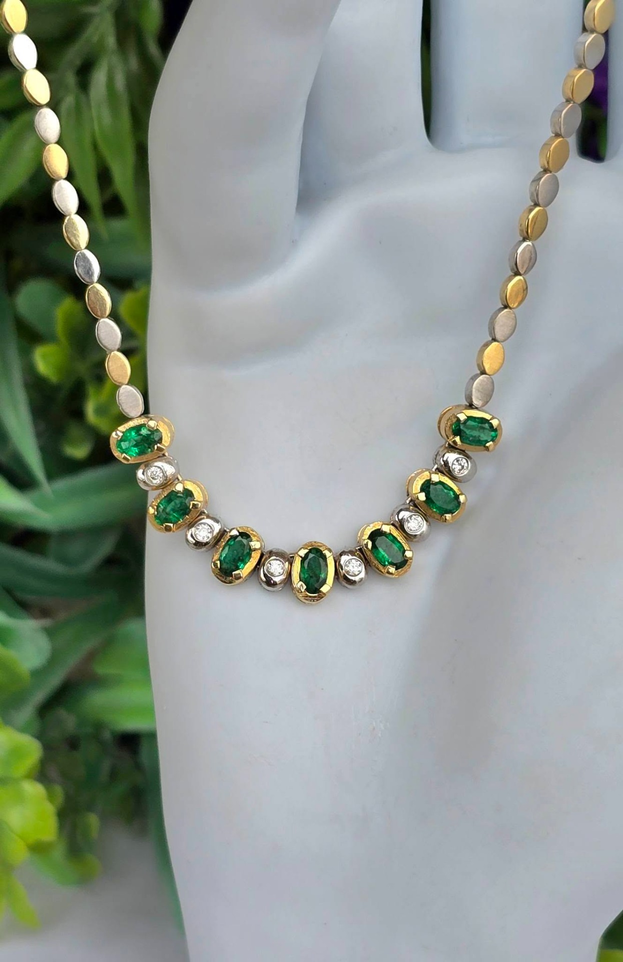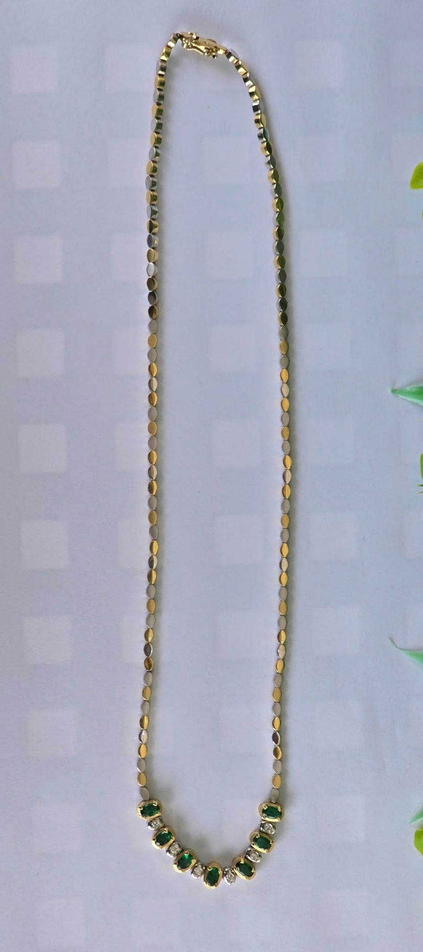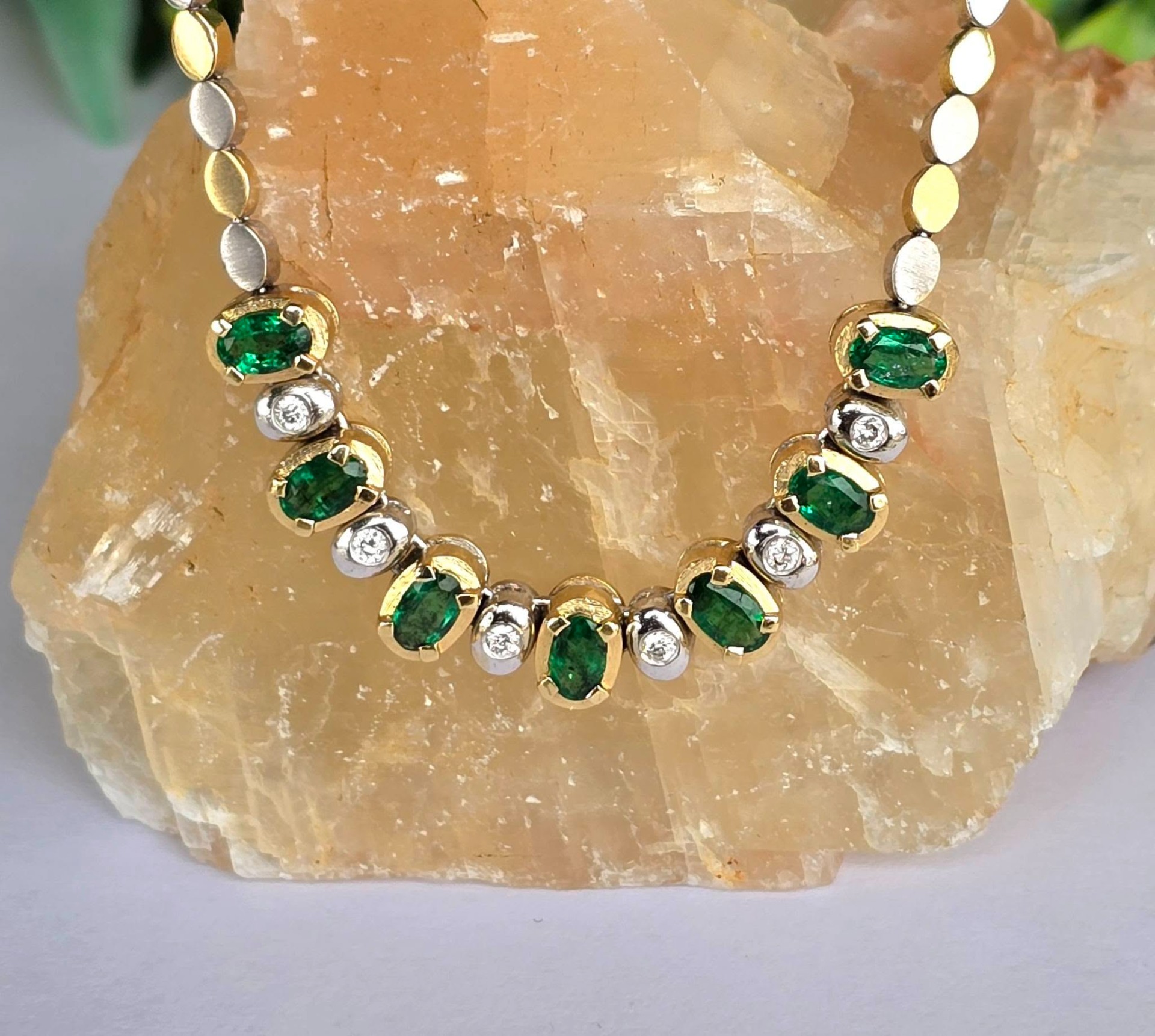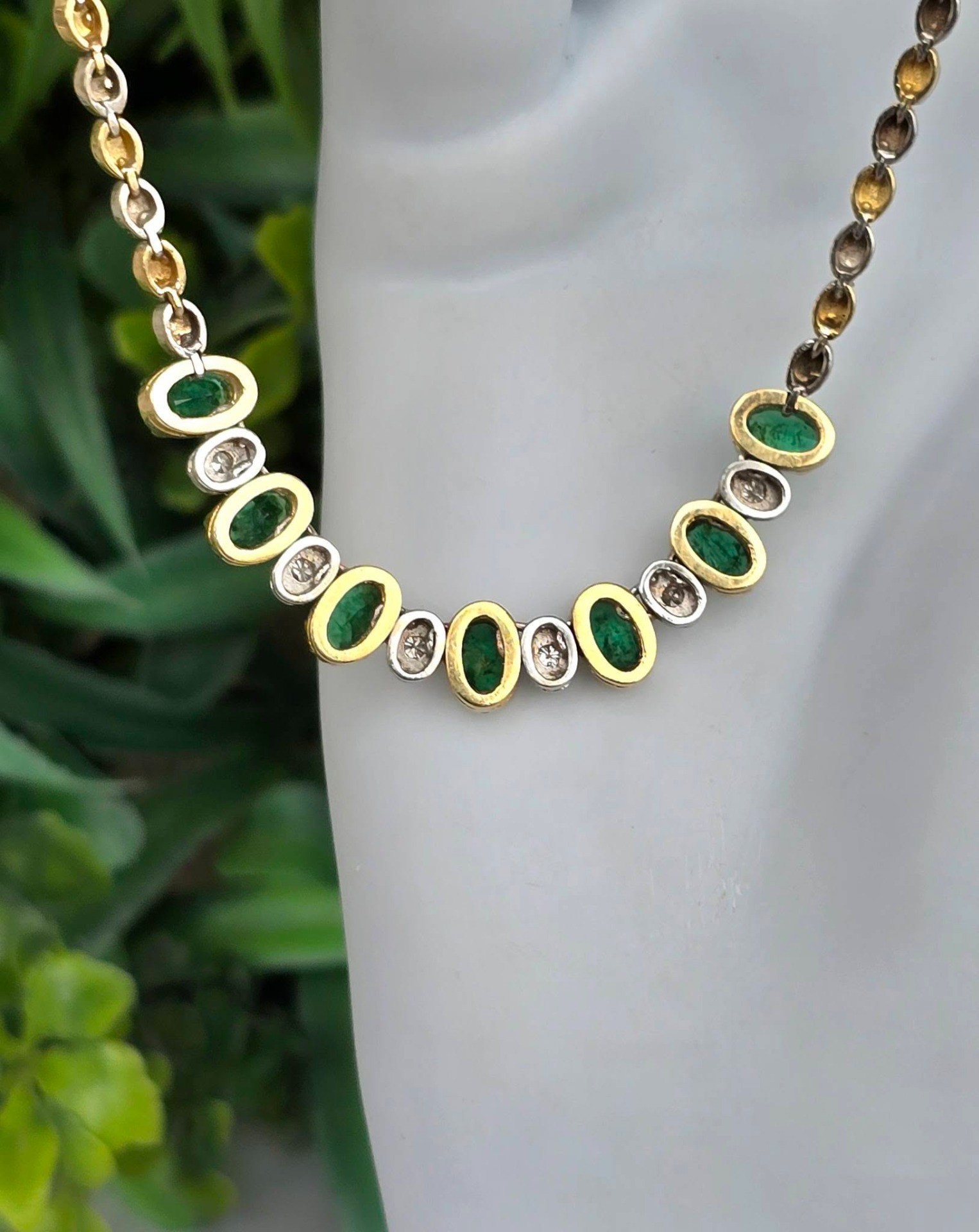 Colier vechi spectaculos, din aur de 14K, cu 6 diamante și 7 smaralde naturale, manufactură deosebită.