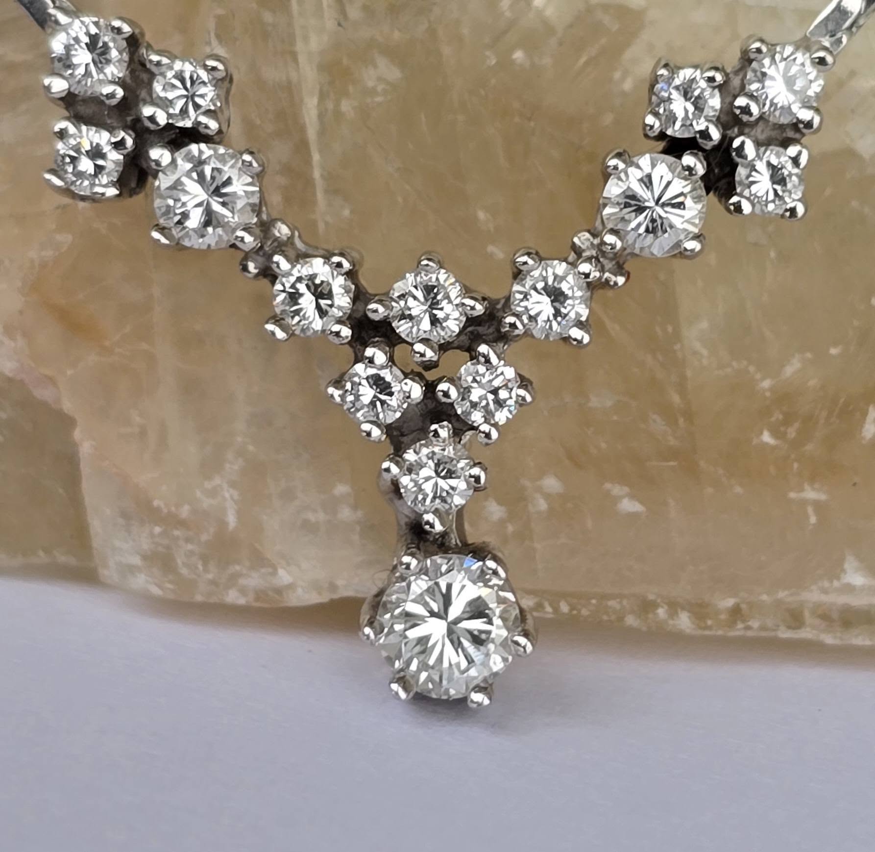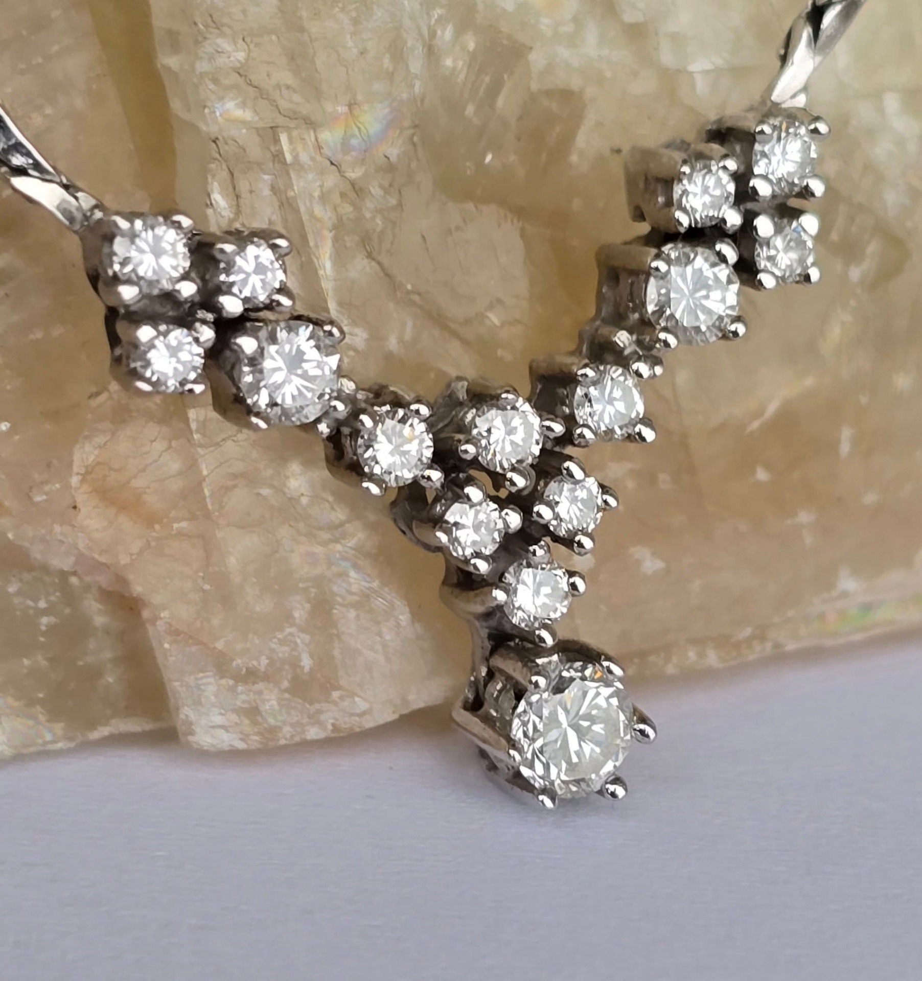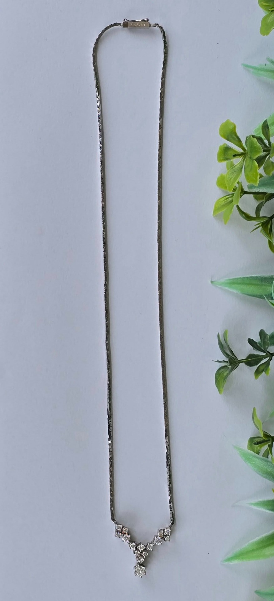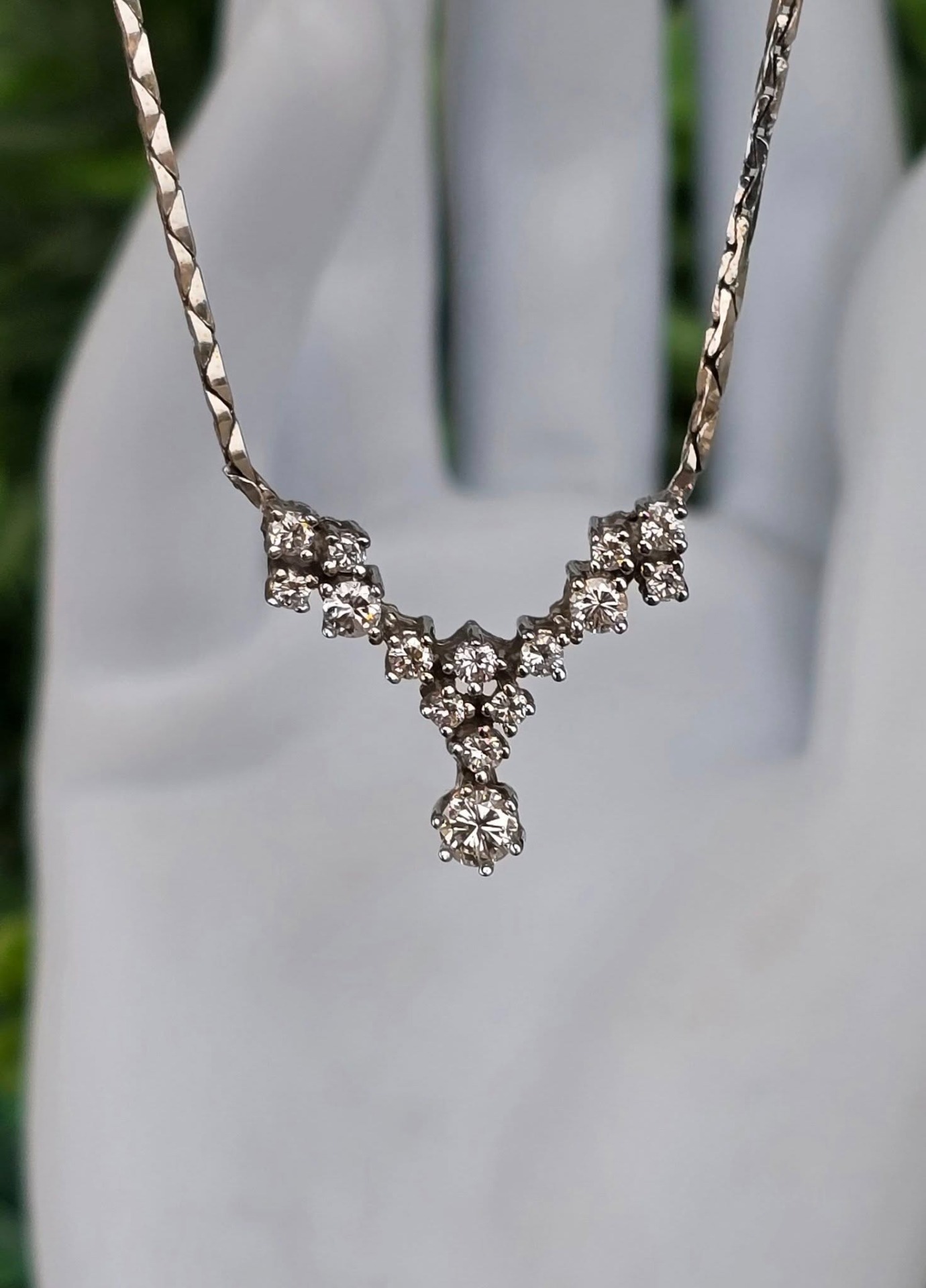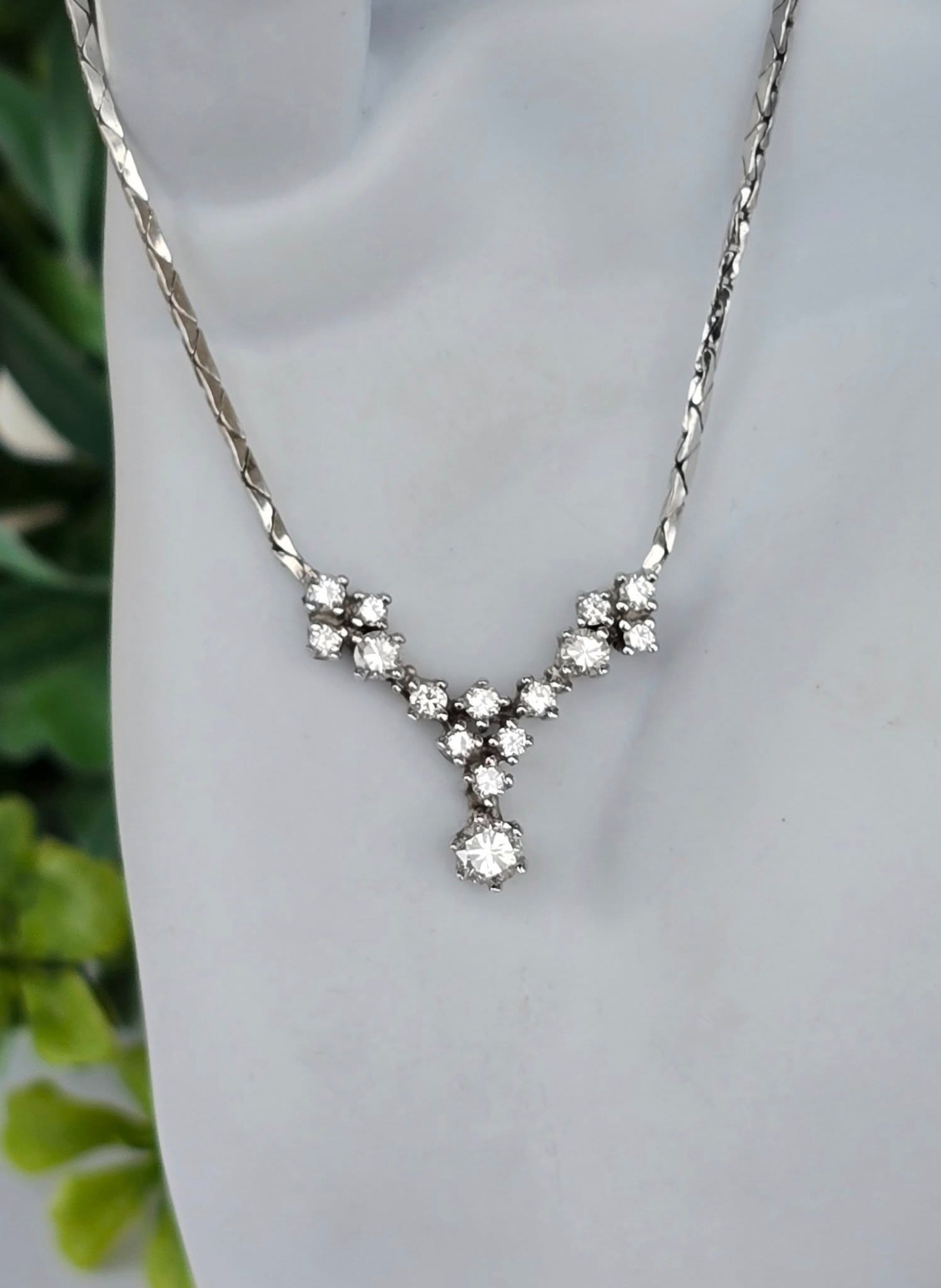 Colier vechi strălucitor, spectaculos, din aur alb de 14K, cu 15 superbe diamante naturale (0.76ct) de calitate superioară, design de tip "lavallière" (Y-drop)