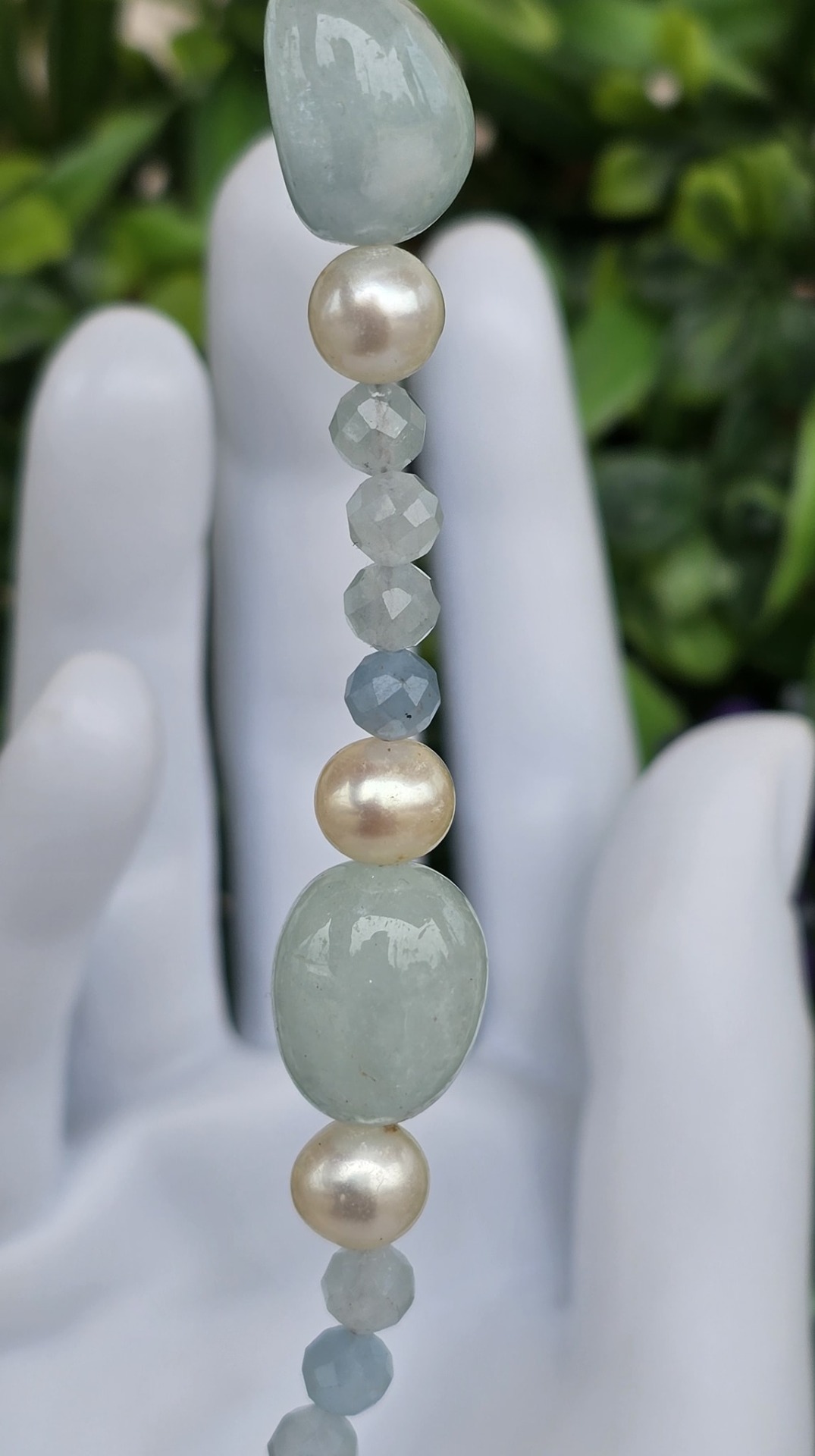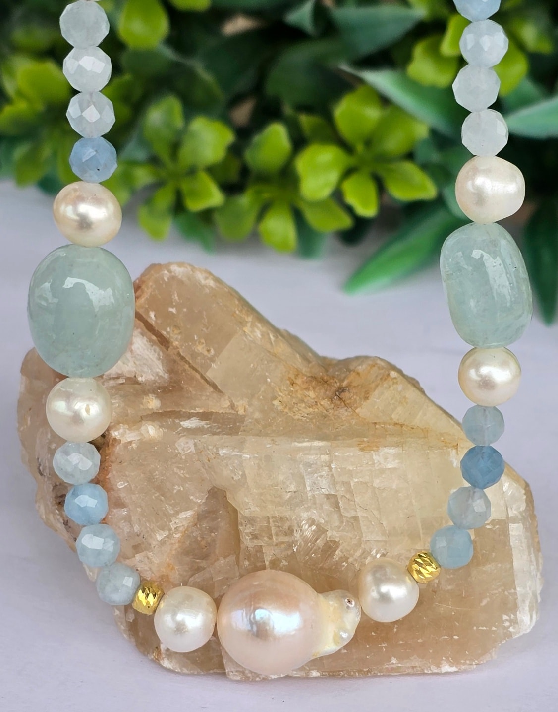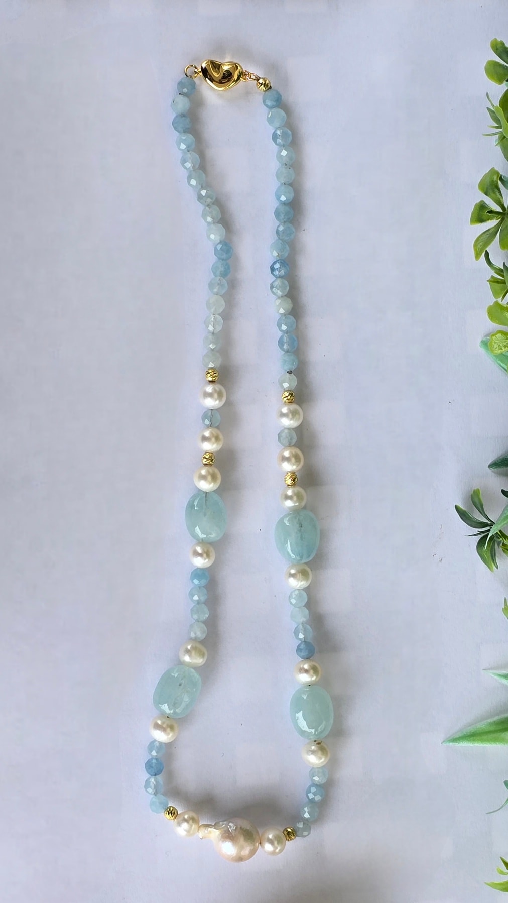 Colier vechi superb, cu aquamarine naturale, perle naturale de cultură și închizătoare din argint aurit.