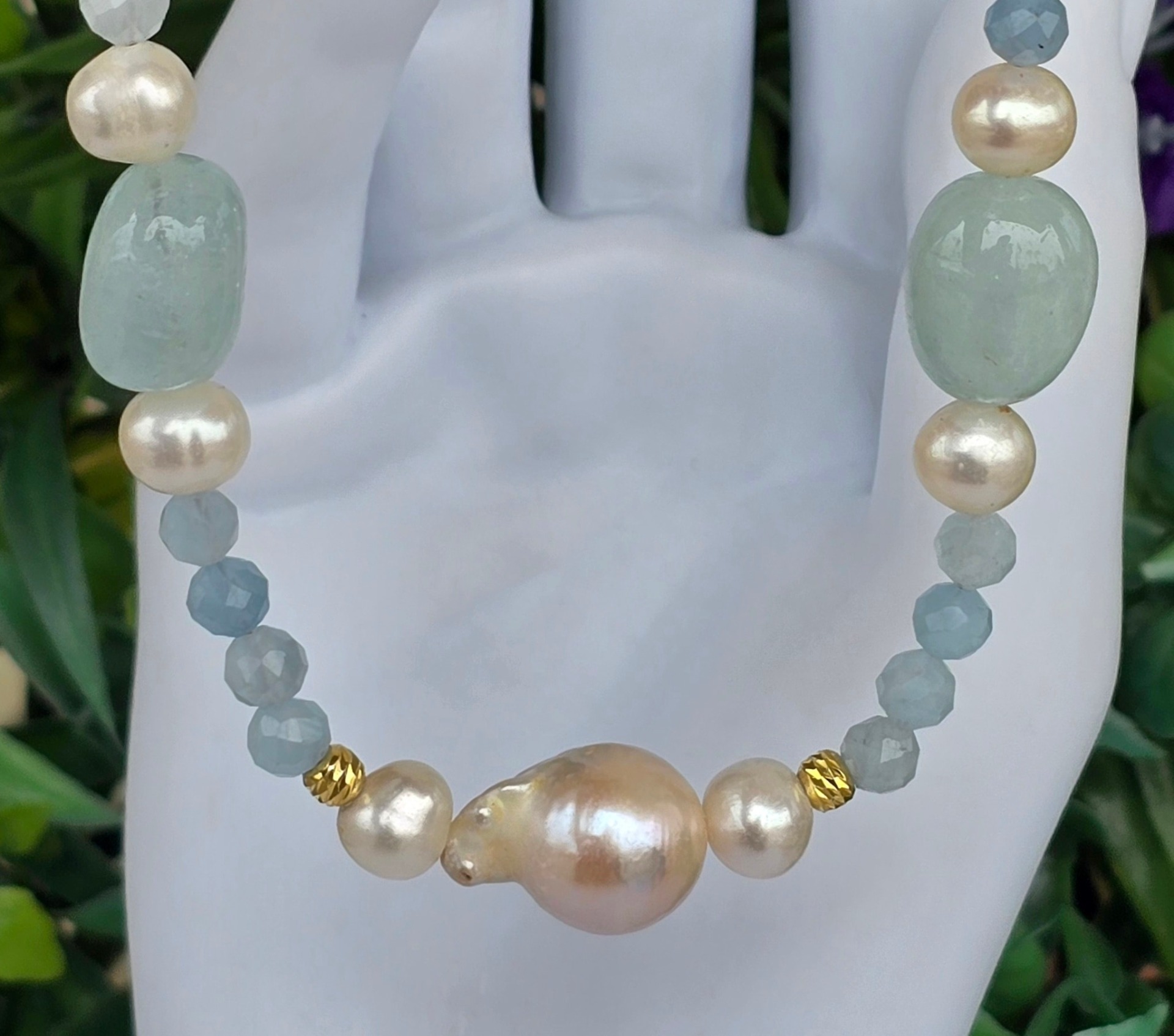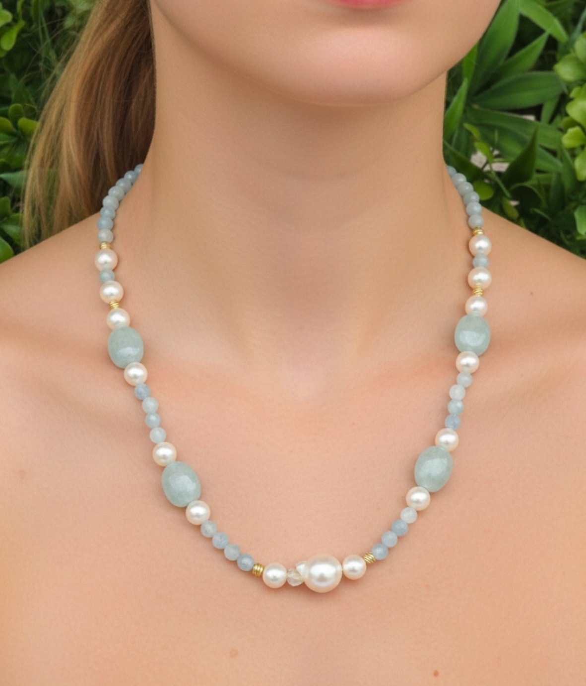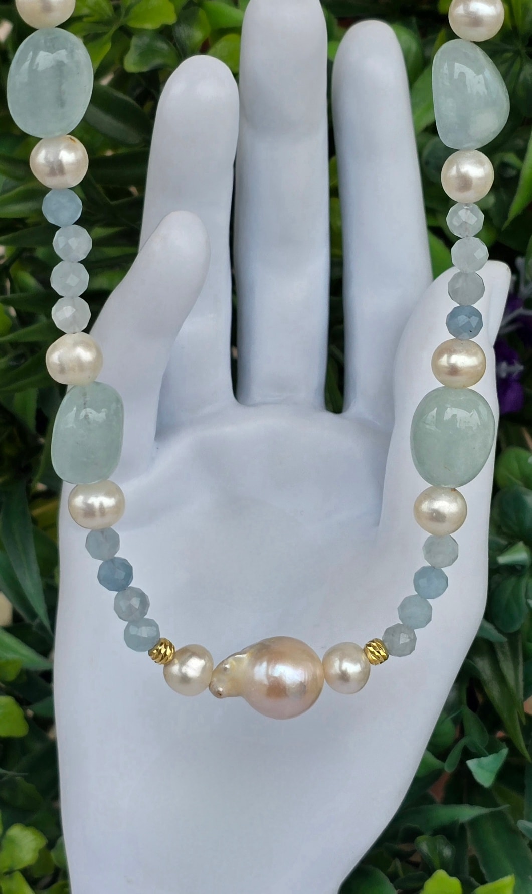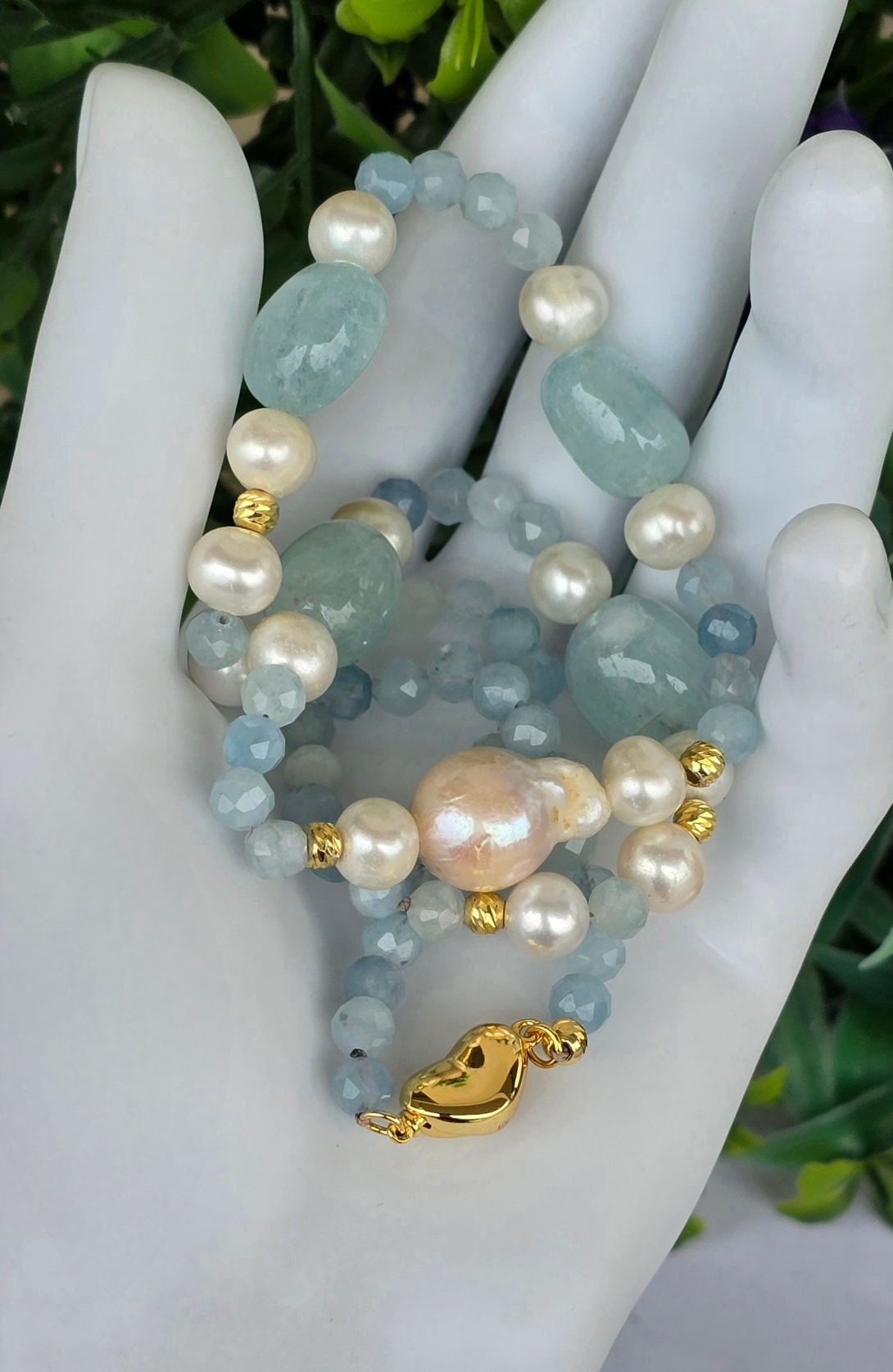 Colier vechi superb, cu aquamarine naturale, perle naturale de cultură și închizătoare din argint aurit.