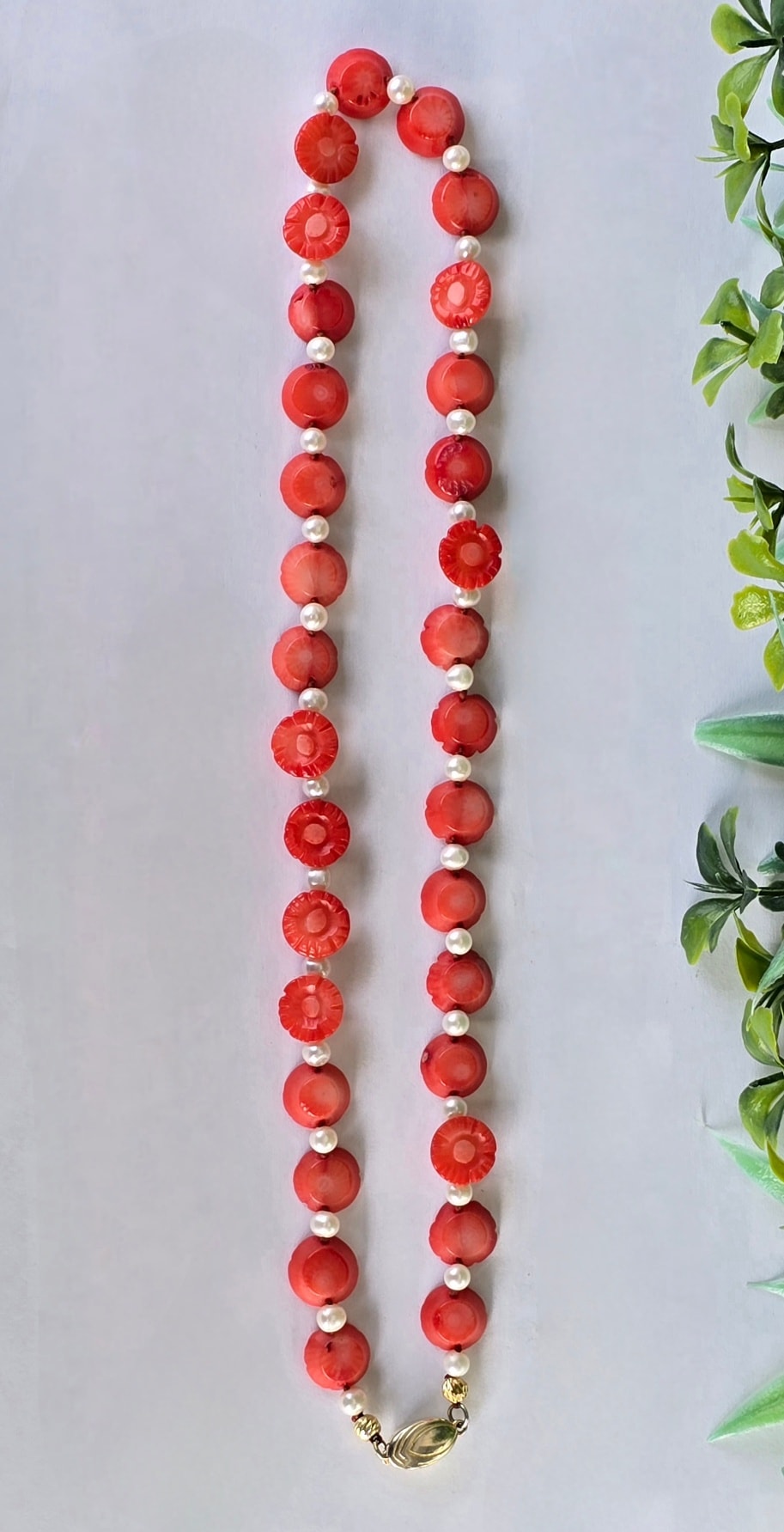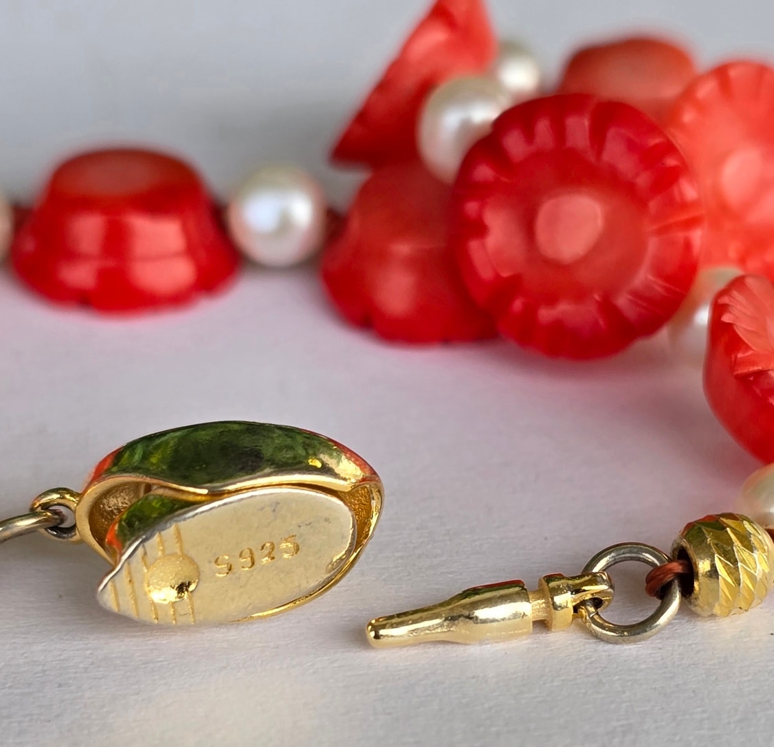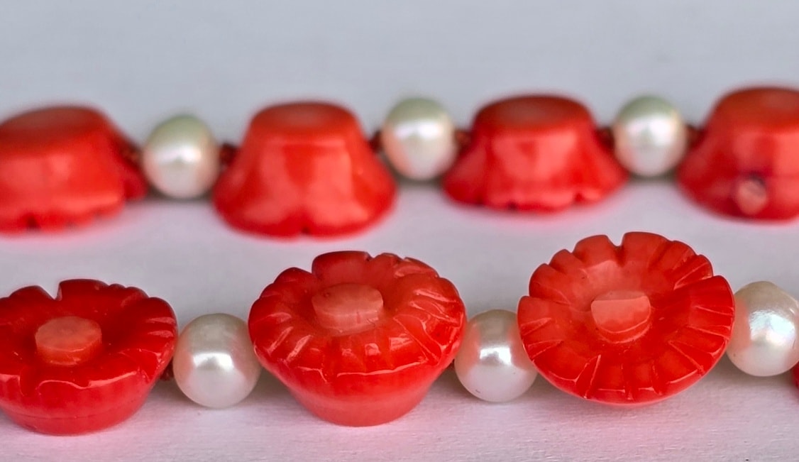 Colier vechi superb, cu coral mediteraneean sculptat, perle naturale de cultură și închizătoare din argint aurit.