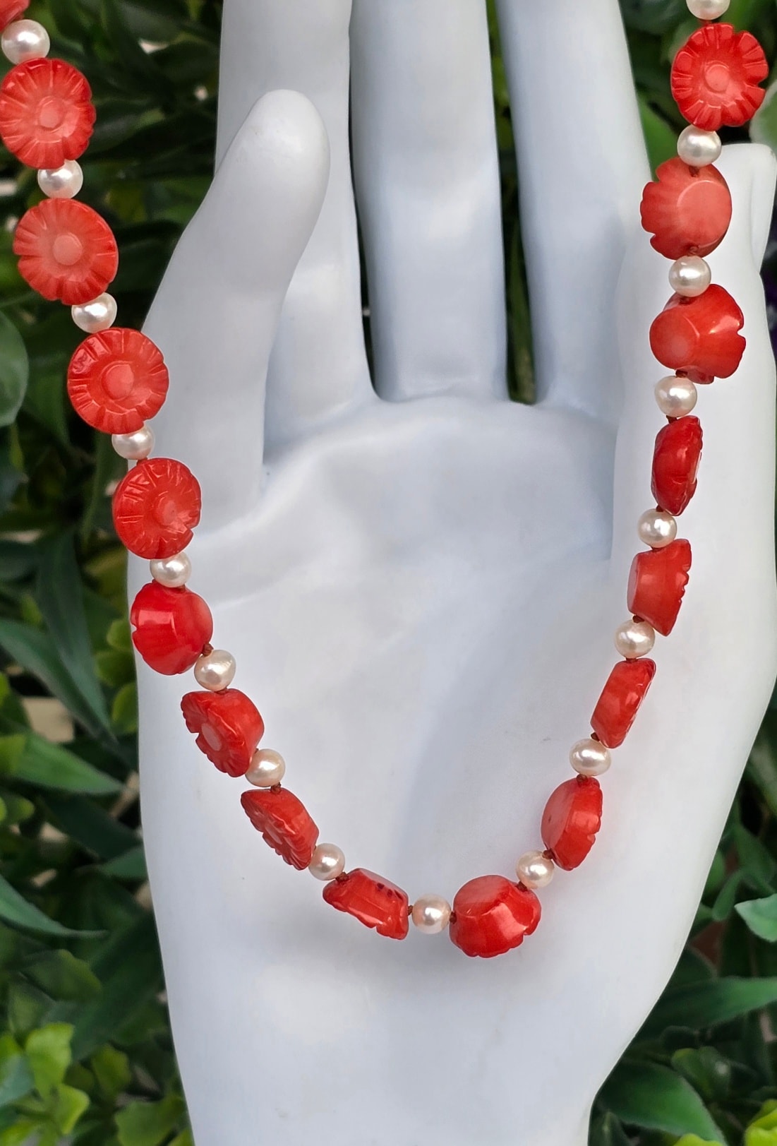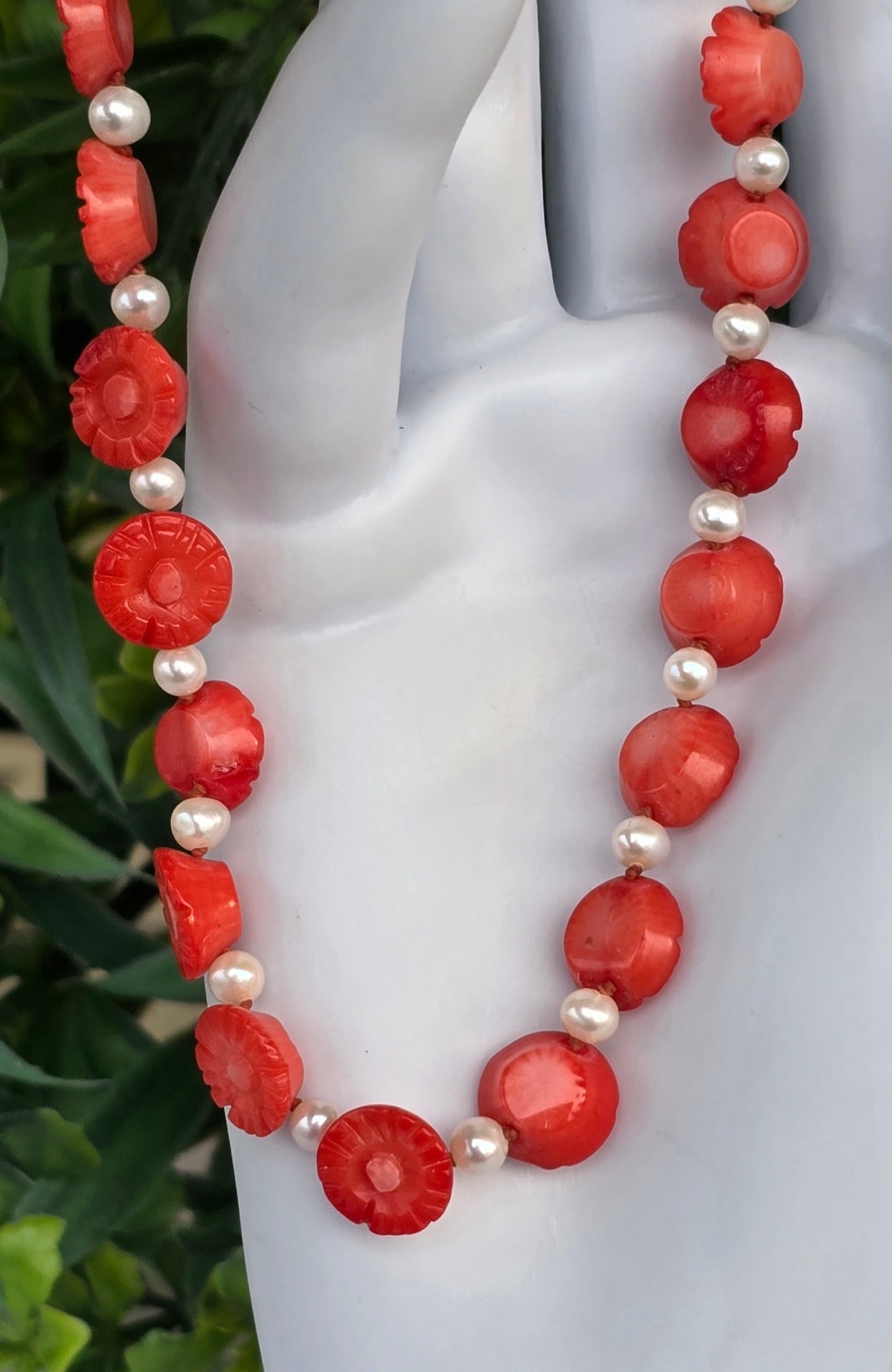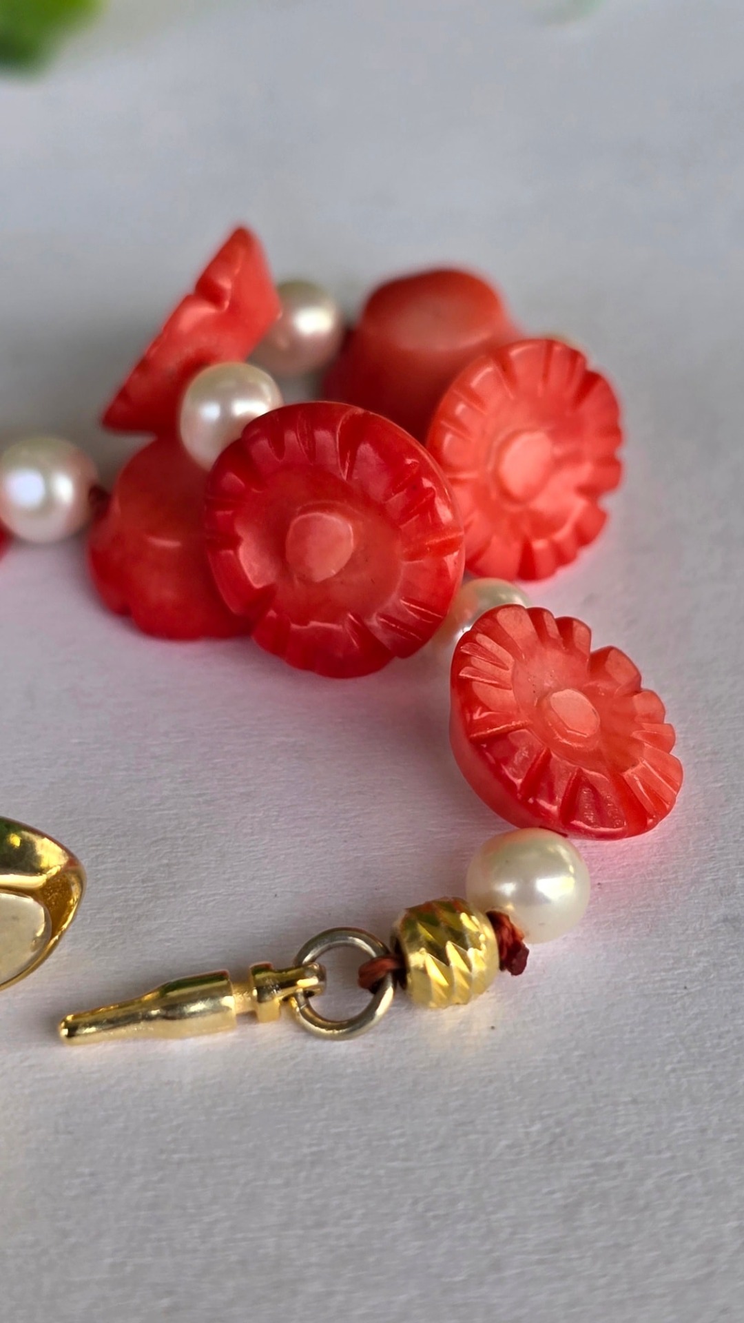 Colier vechi superb, cu coral mediteraneean sculptat, perle naturale de cultură și închizătoare din argint aurit.