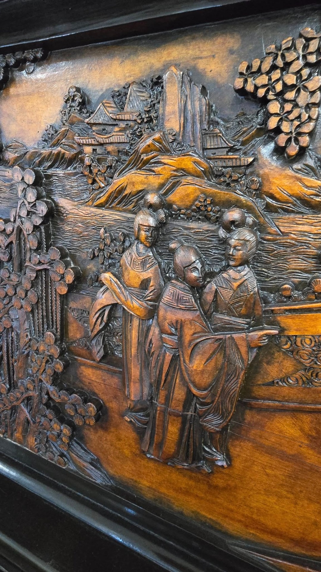 Întreaga piesă este decorată cu panouri din lemn sculptate manual în altorelief. Scenele detaliate prezintă personaje în robe tradiționale, arhitectură orientală (pagode), peisaje montane și vegetație luxuriantă.