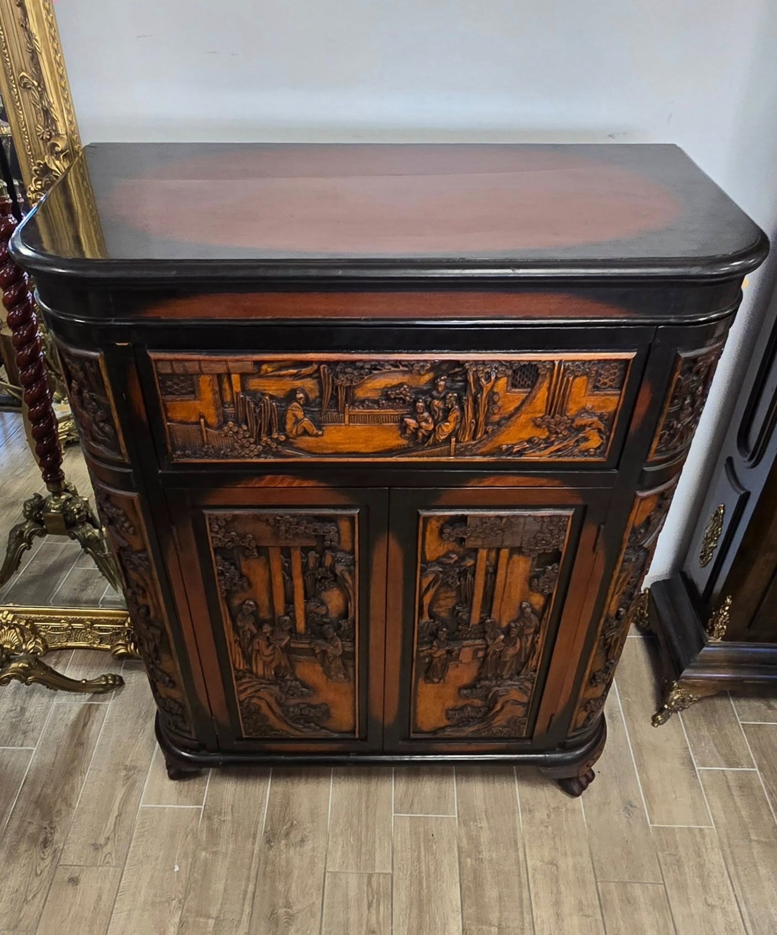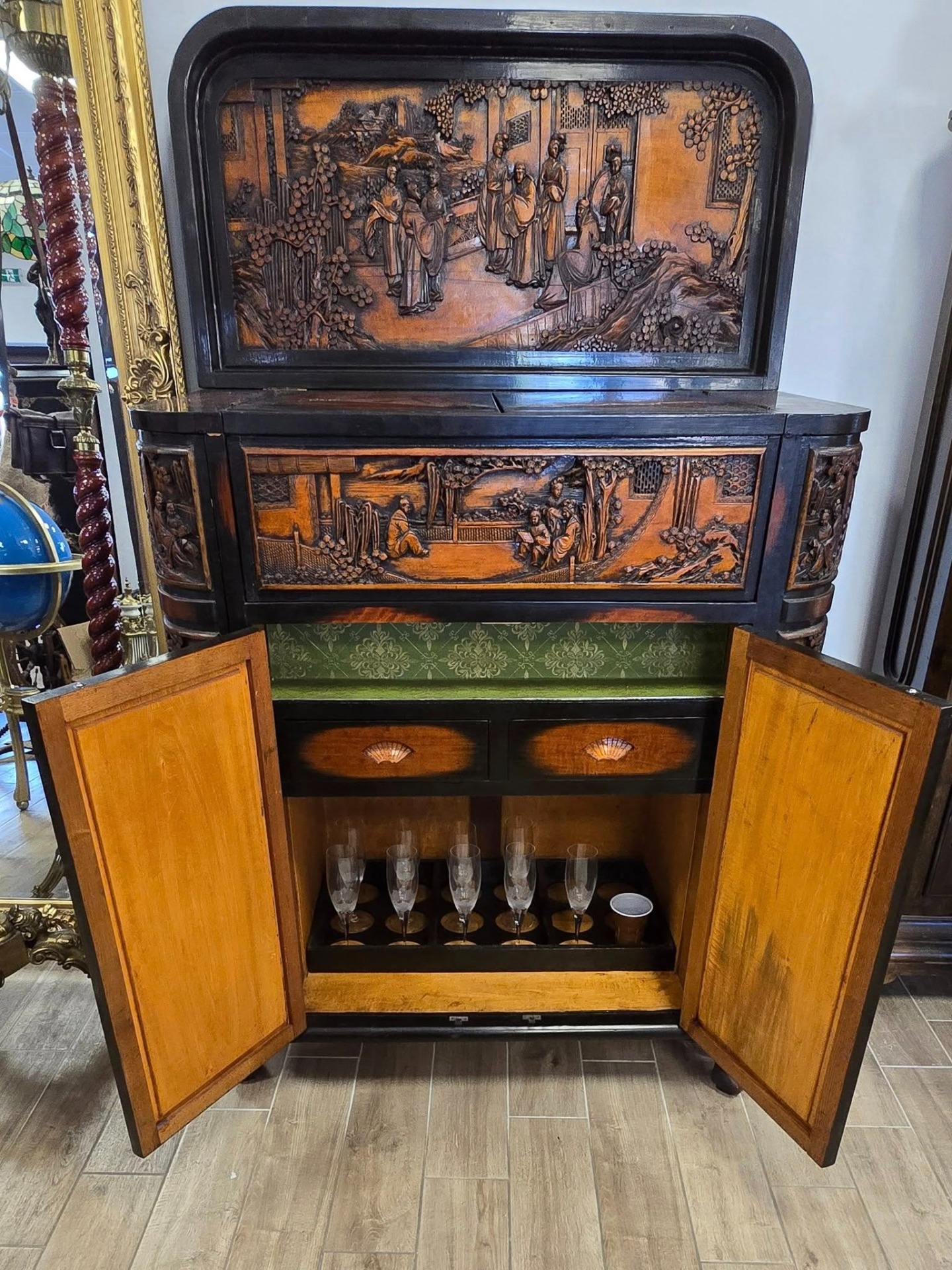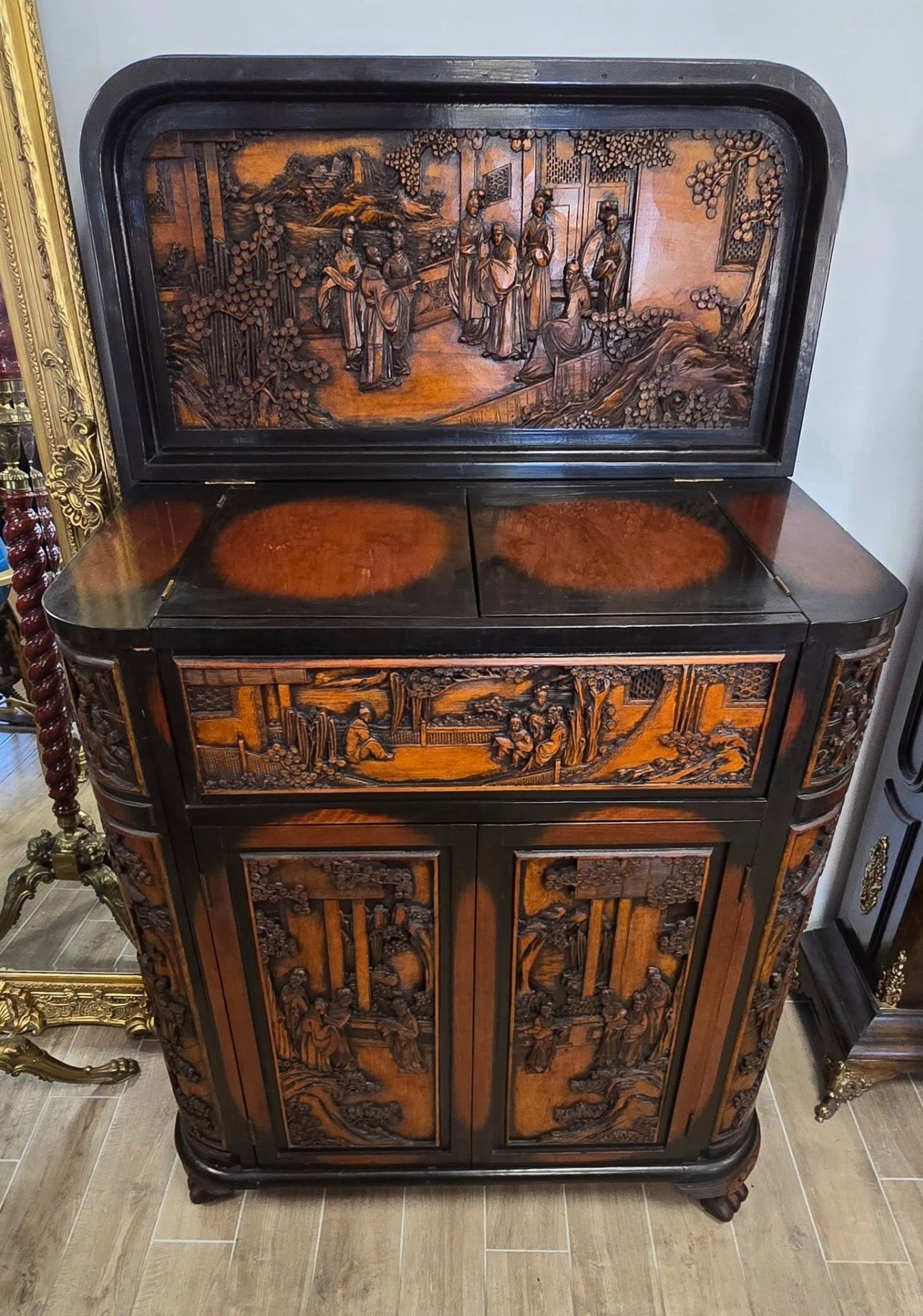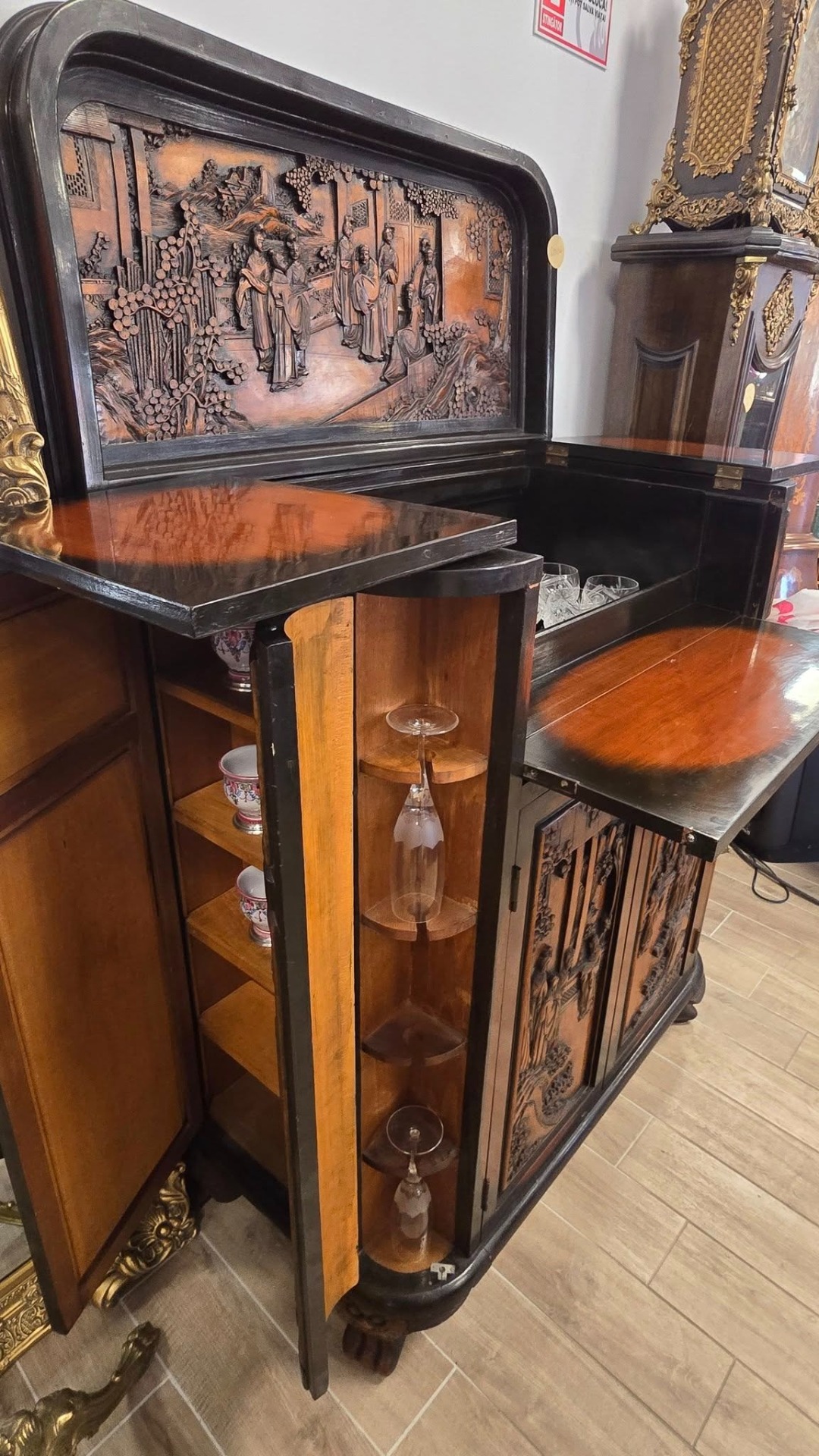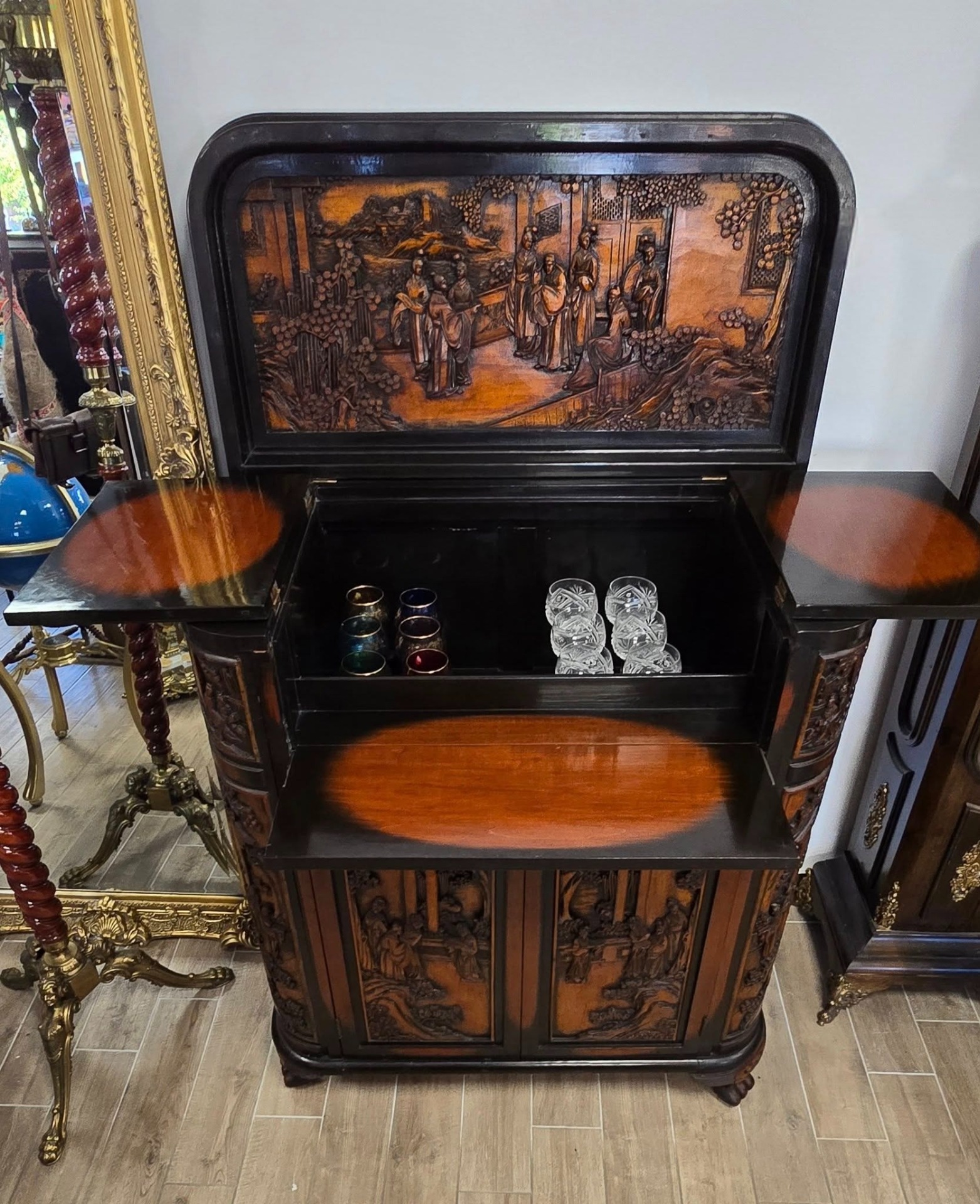 Comodă-bar asiatică, sculptată manual, adevărată operă de artă, piesă de mobilier excepțională, care este pe lângă loc de depozitare și un util și funcțional