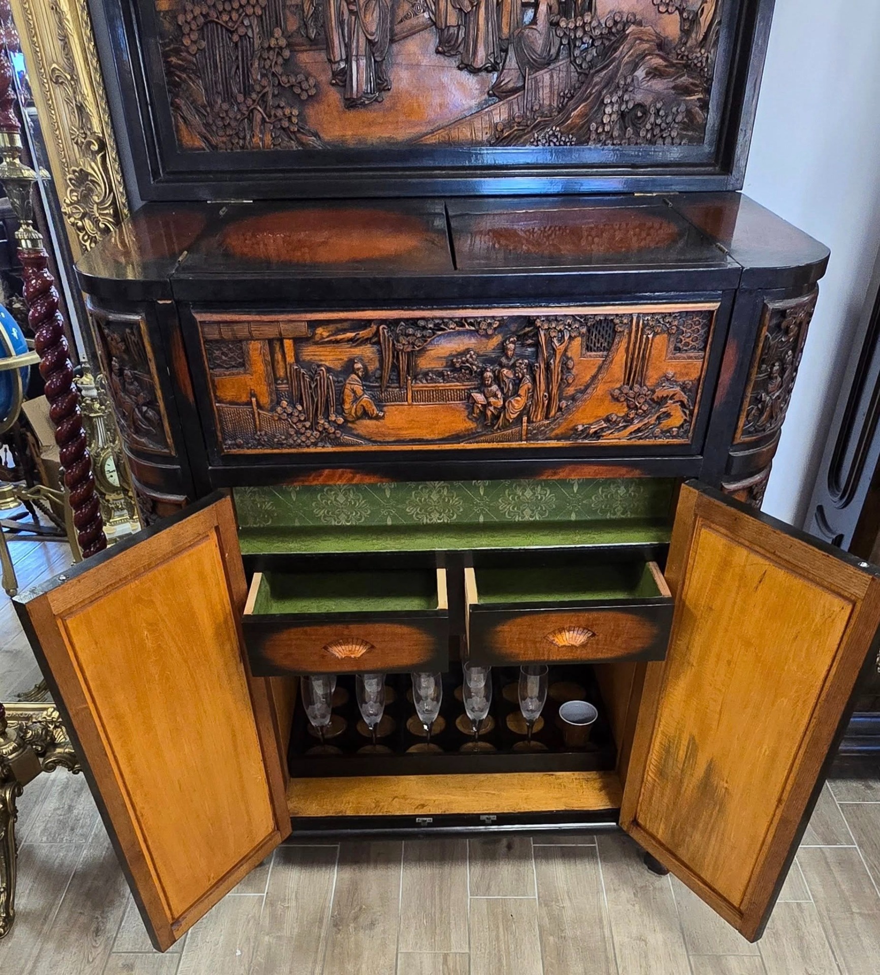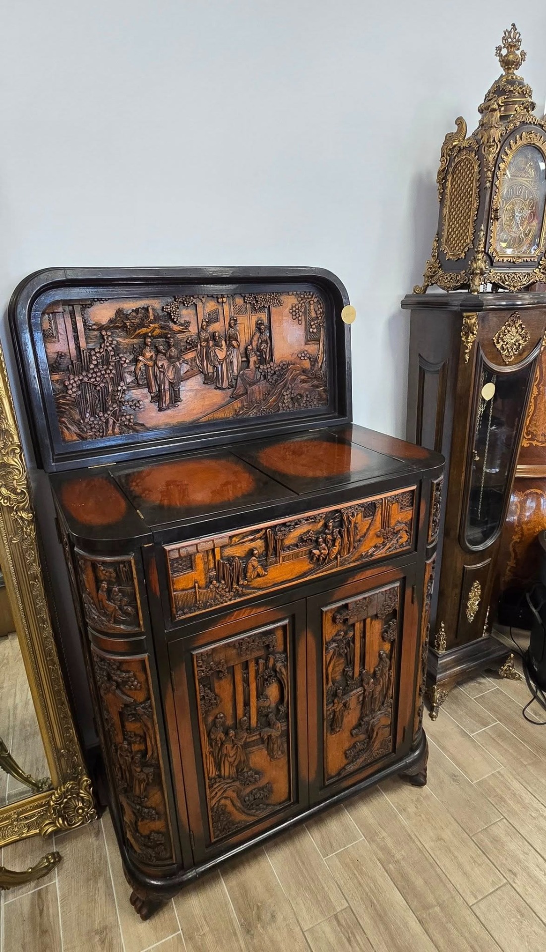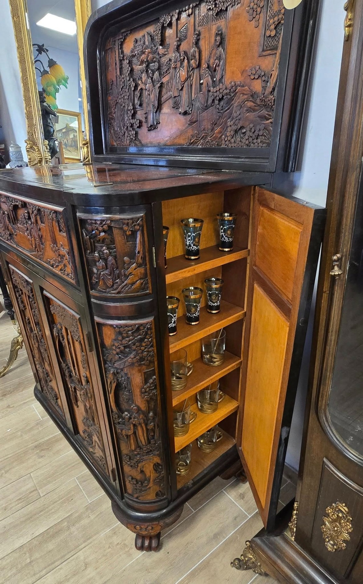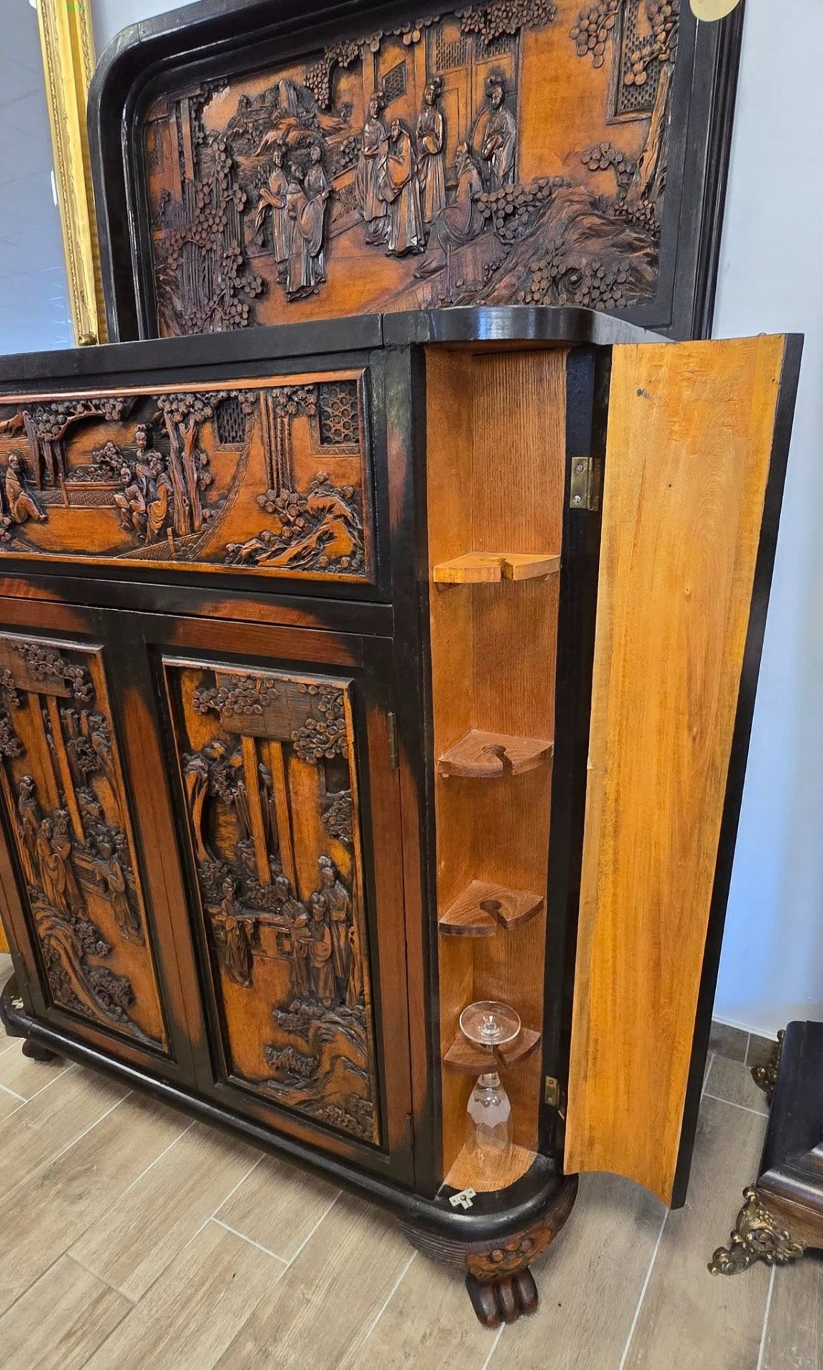 Comodă-bar asiatică, sculptată manual, adevărată operă de artă, piesă de mobilier excepțională, care este pe lângă loc de depozitare și un util și funcțional