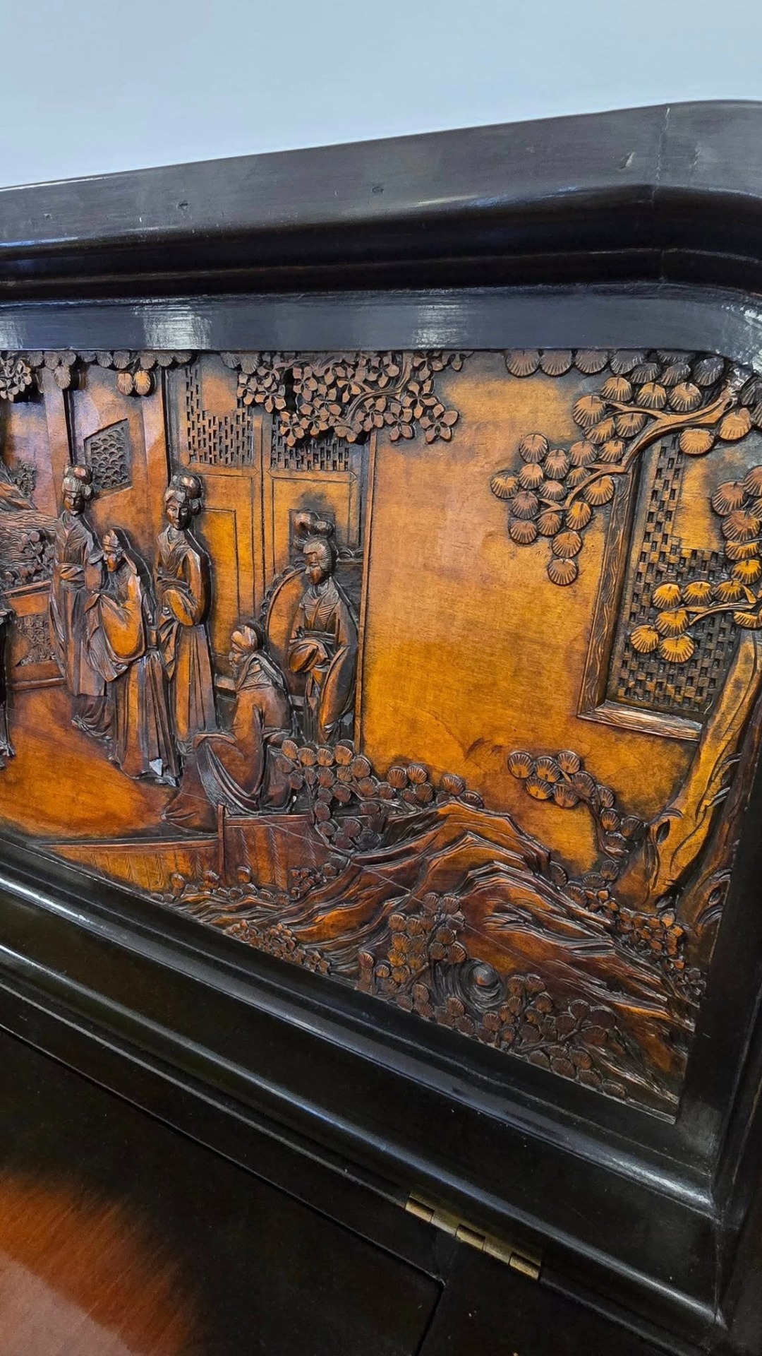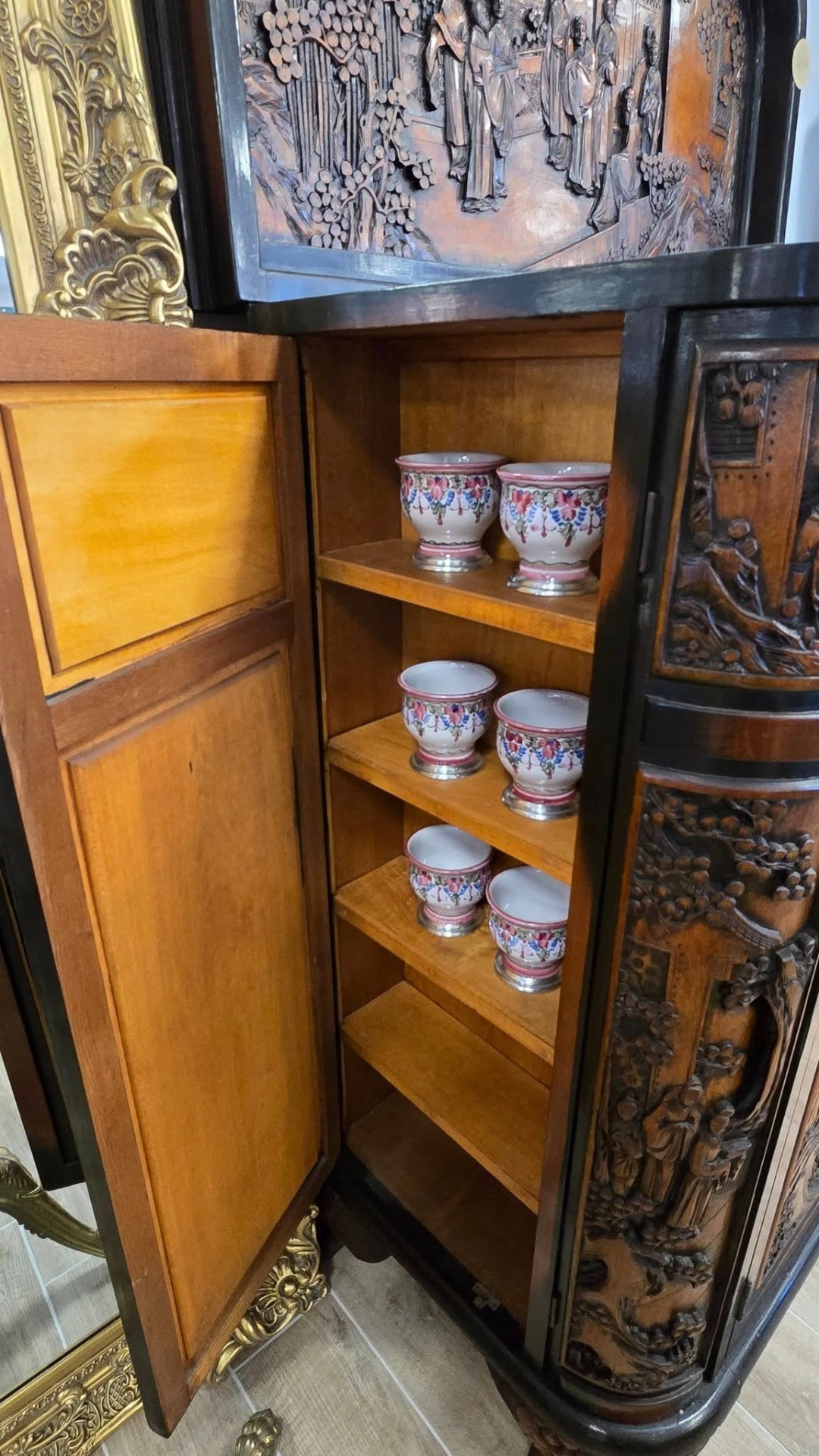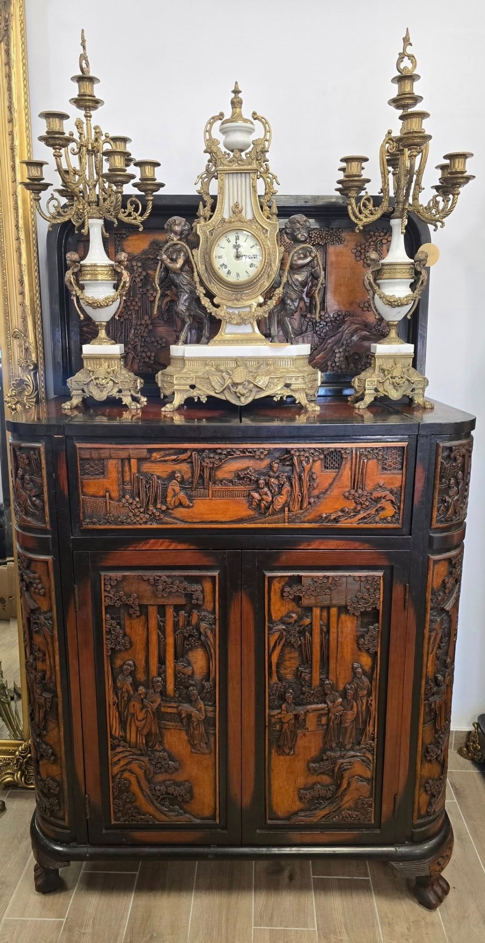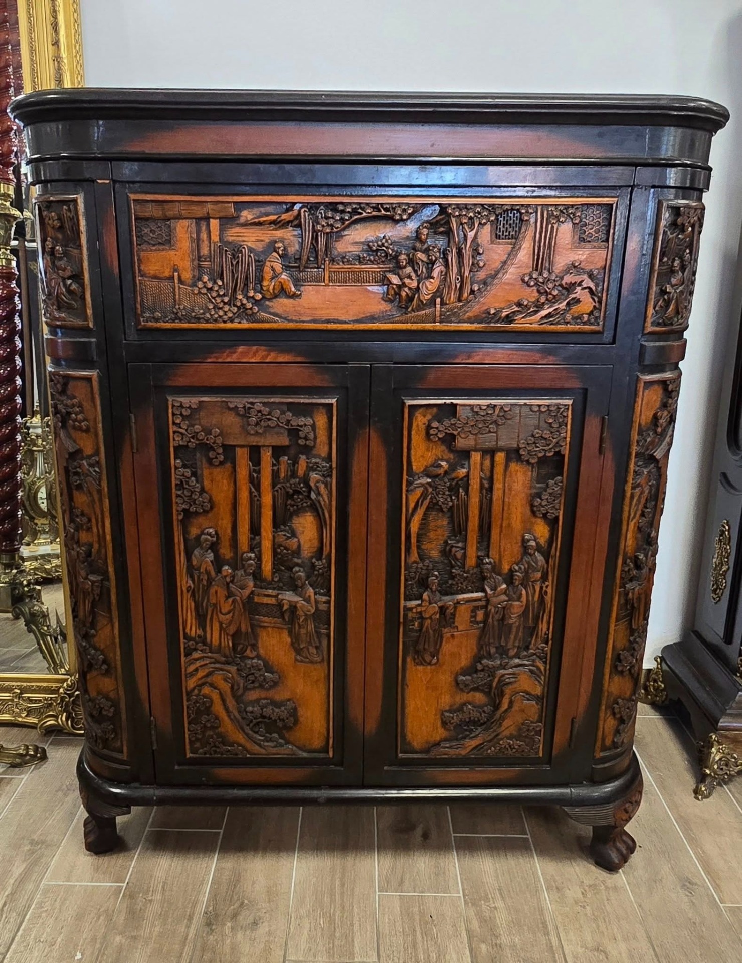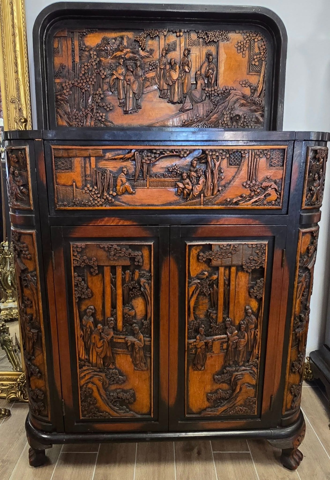 Comodă-bar asiatică, sculptată manual, adevărată operă de artă, piesă de mobilier excepțională, care este pe lângă loc de depozitare și un util și funcțional