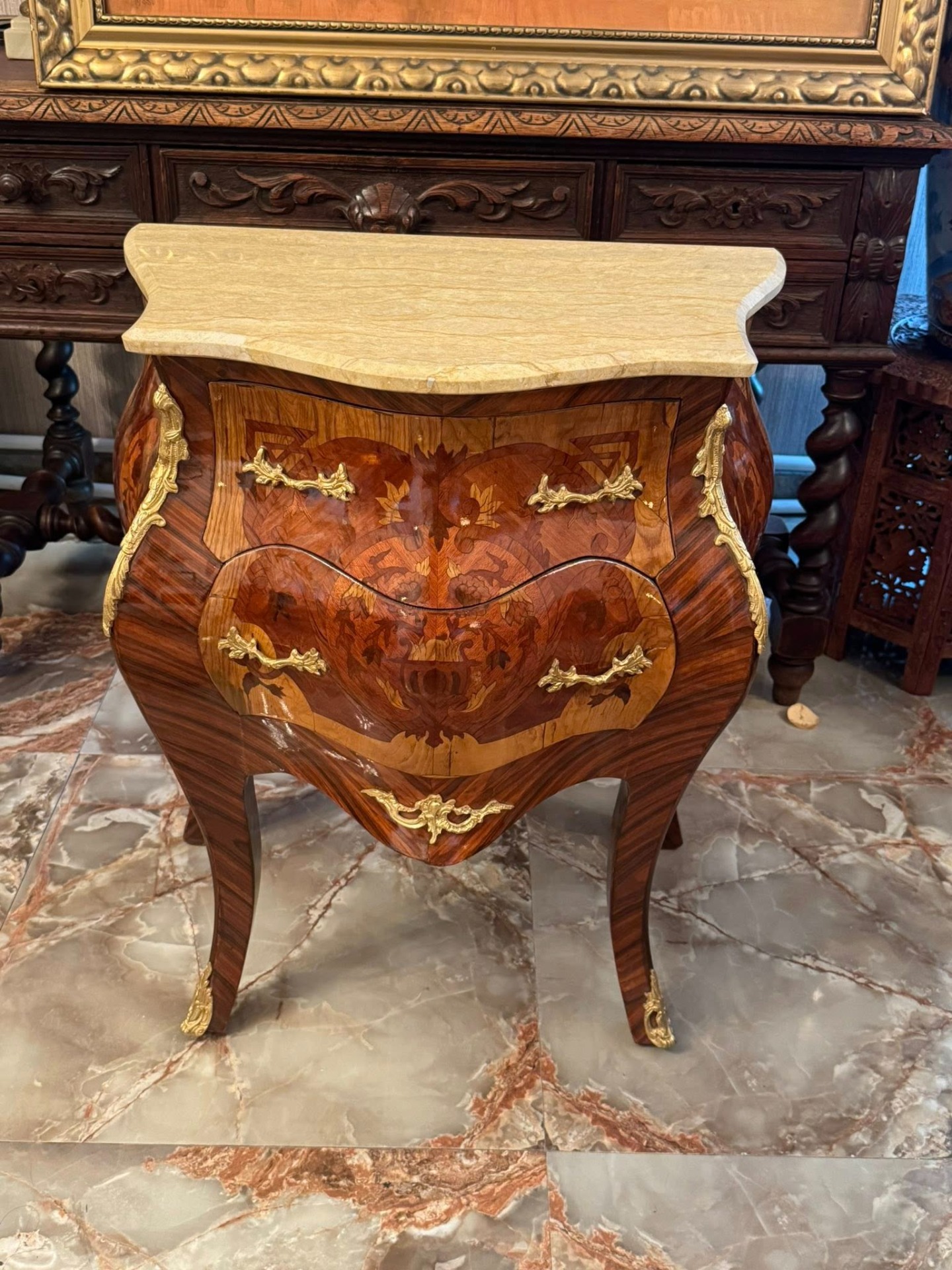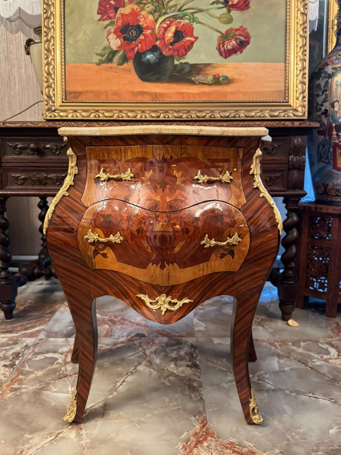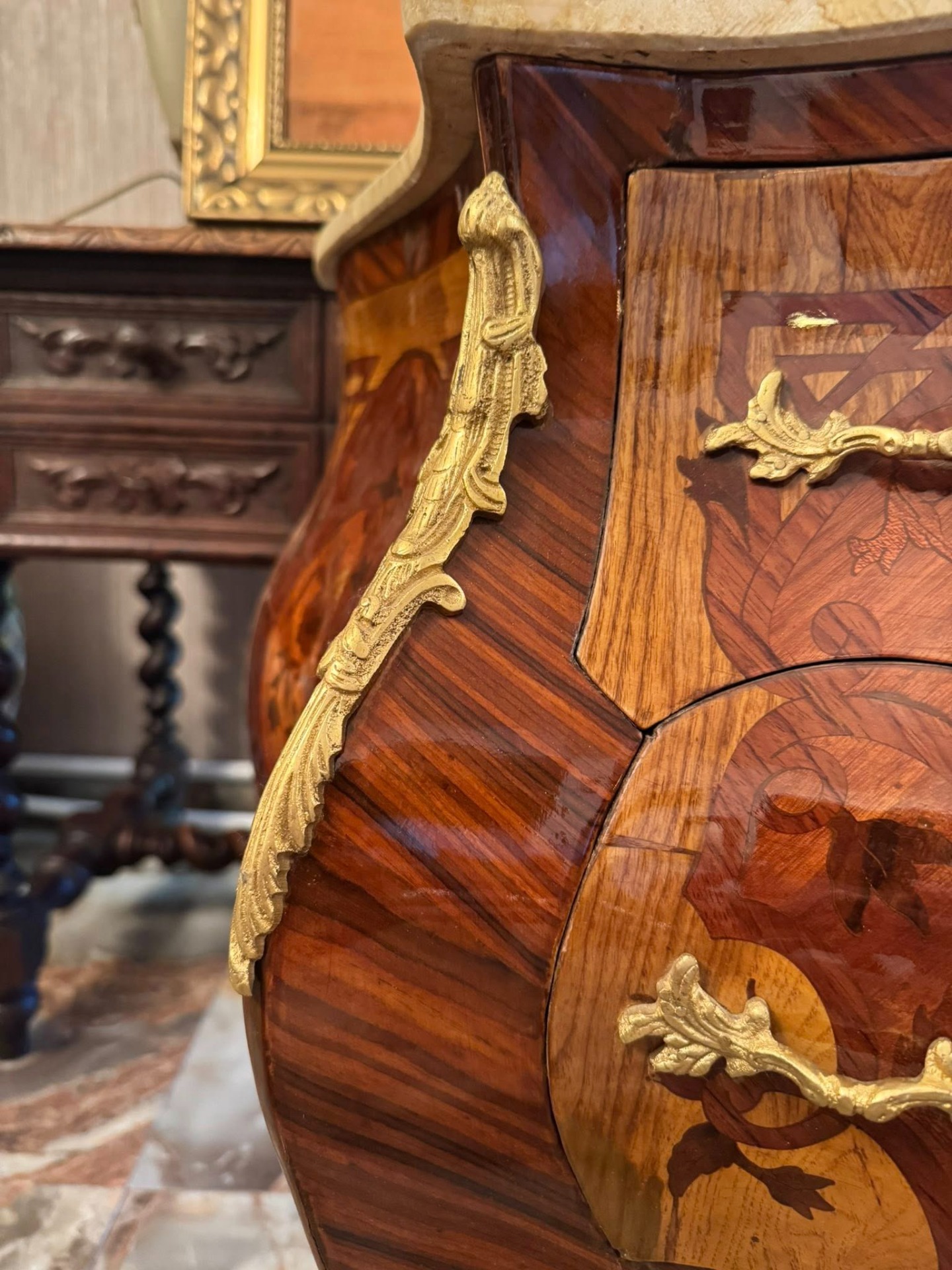 Comodă din lemn masiv și blat de marmură, decorată cu intarsie și ornamente din bronz, aparținând stilului Ludovic al XV-lea.