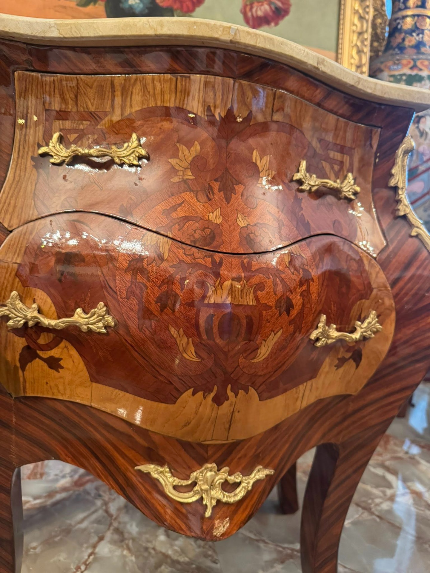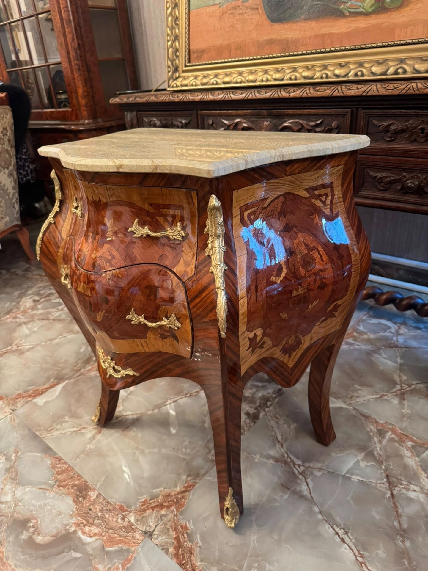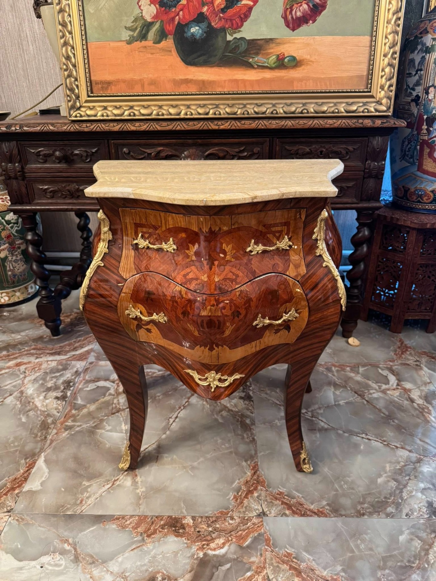 Comodă din lemn masiv și blat de marmură, decorată cu intarsie și ornamente din bronz, aparținând stilului Ludovic al XV-lea.