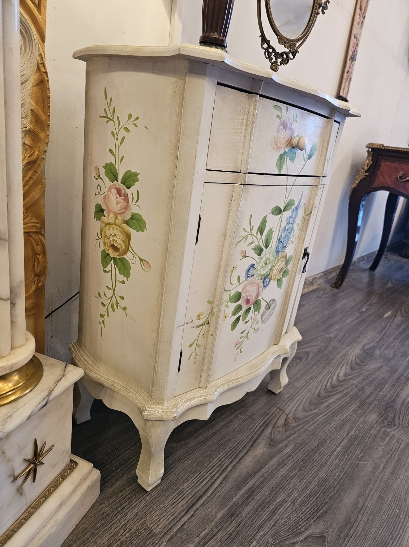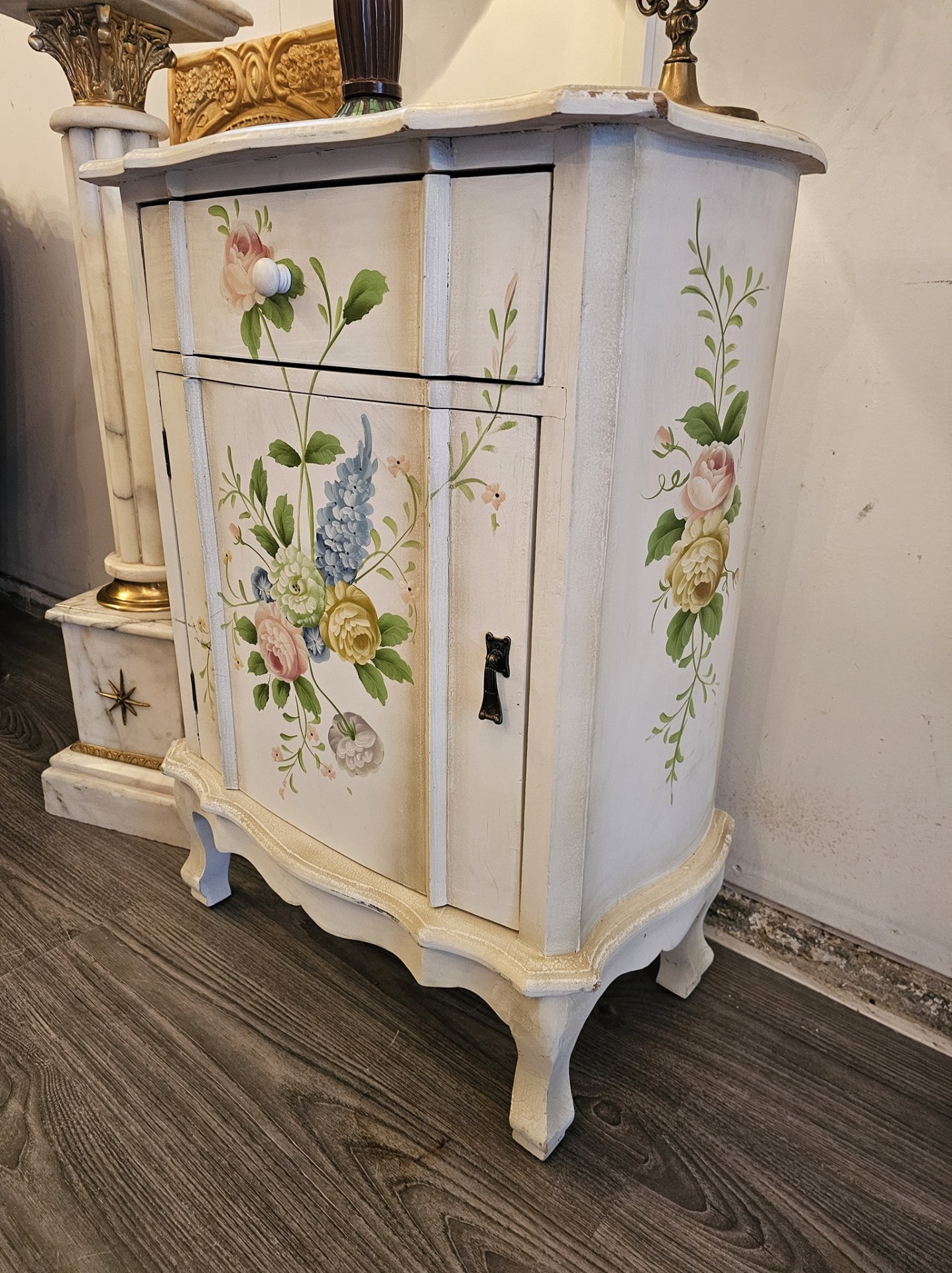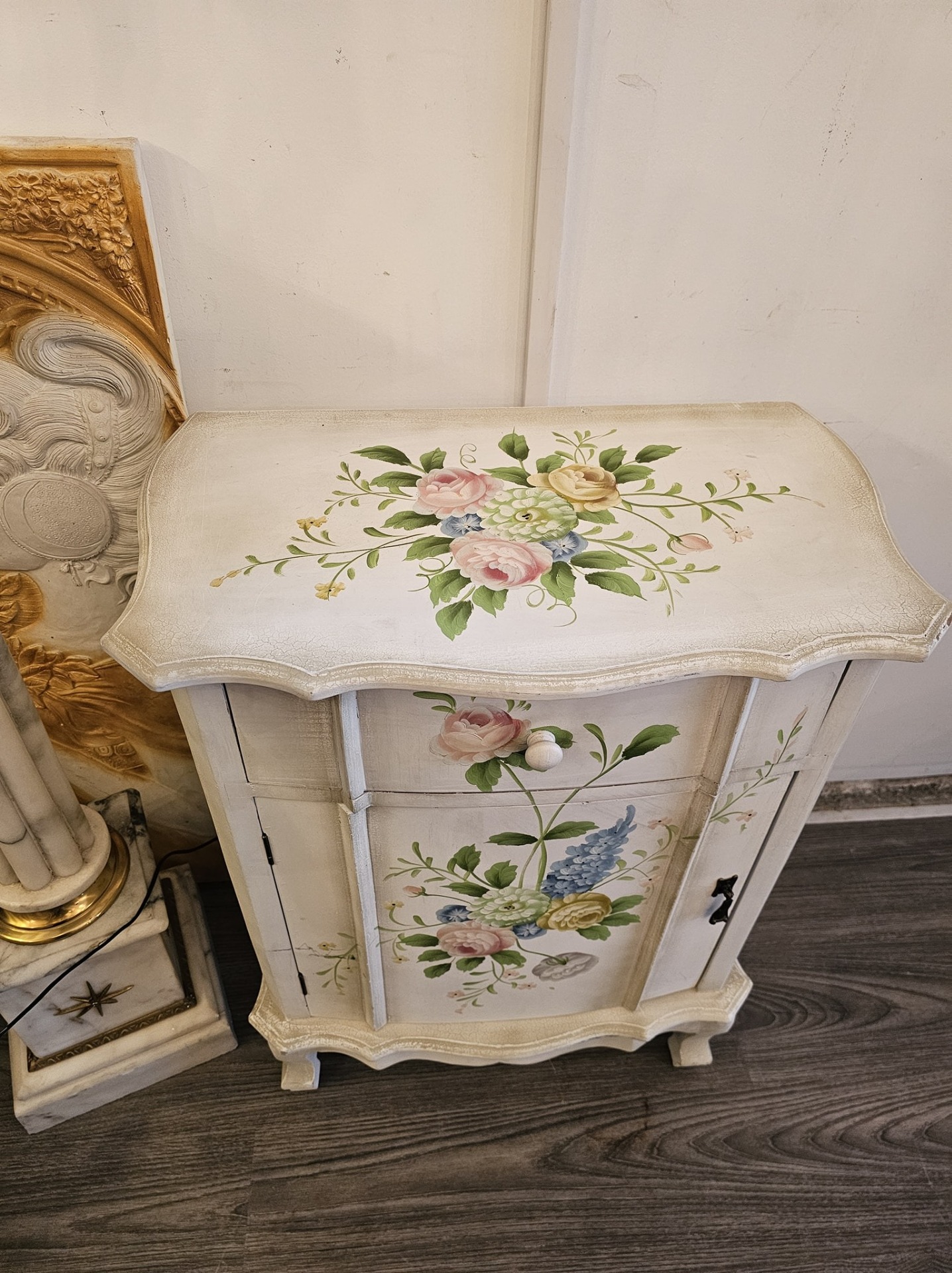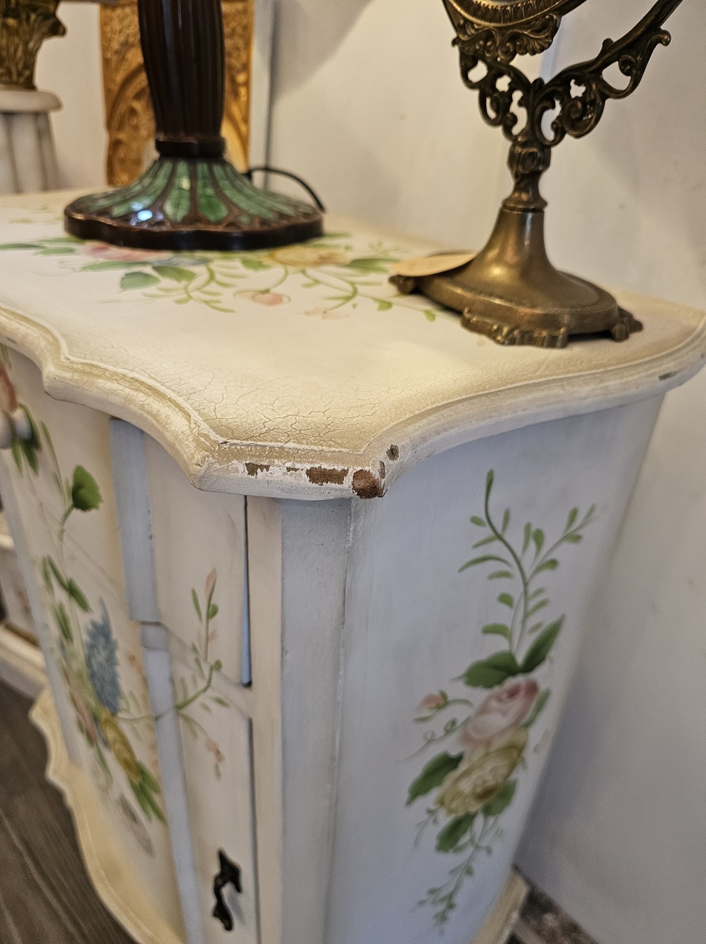 Comodă vintage pictată manual, cu un design romantic și elegant, perfectă pentru decorarea unui interior shabby chic, clasic sau rustic. Piesa este din lemn