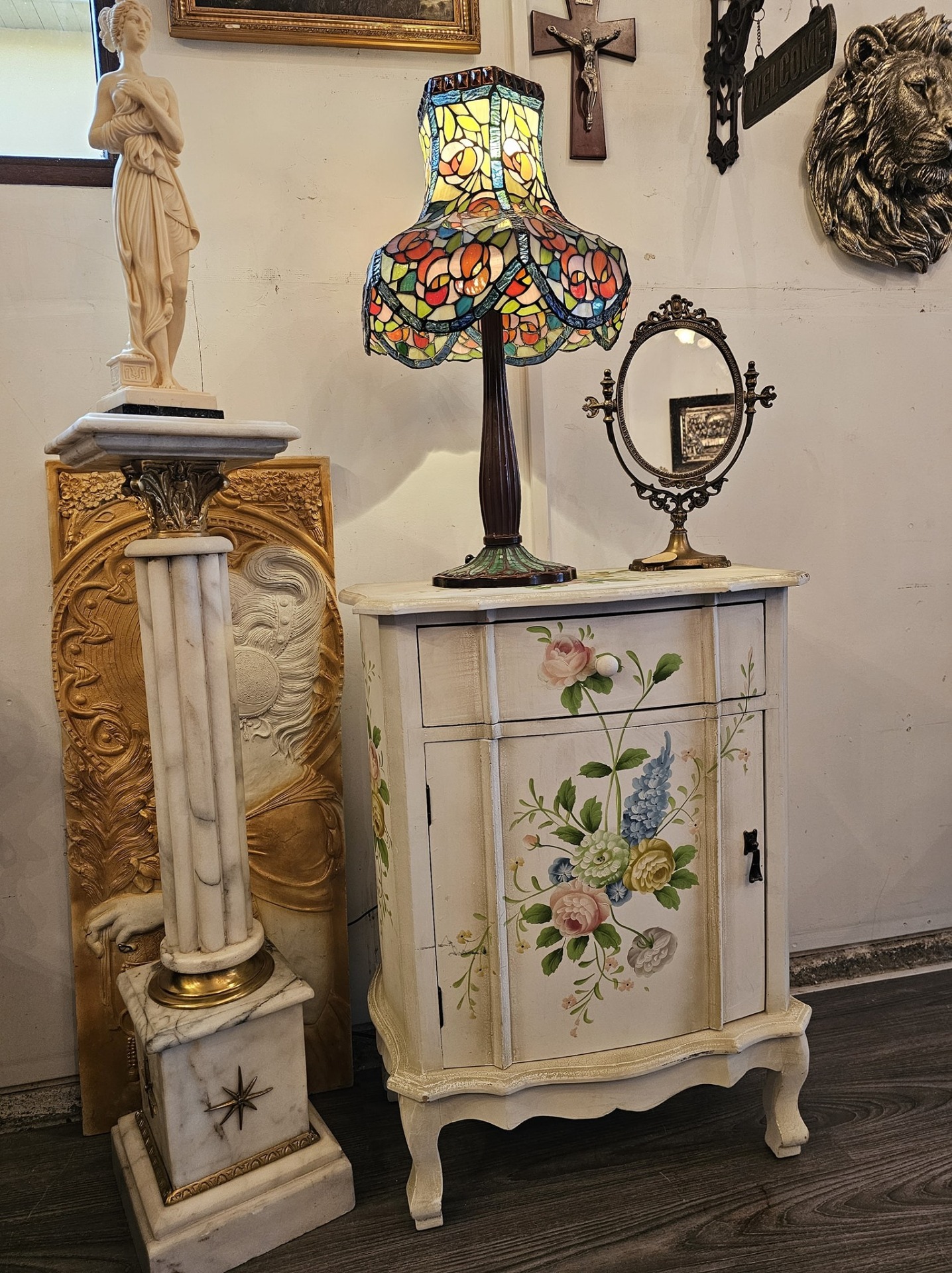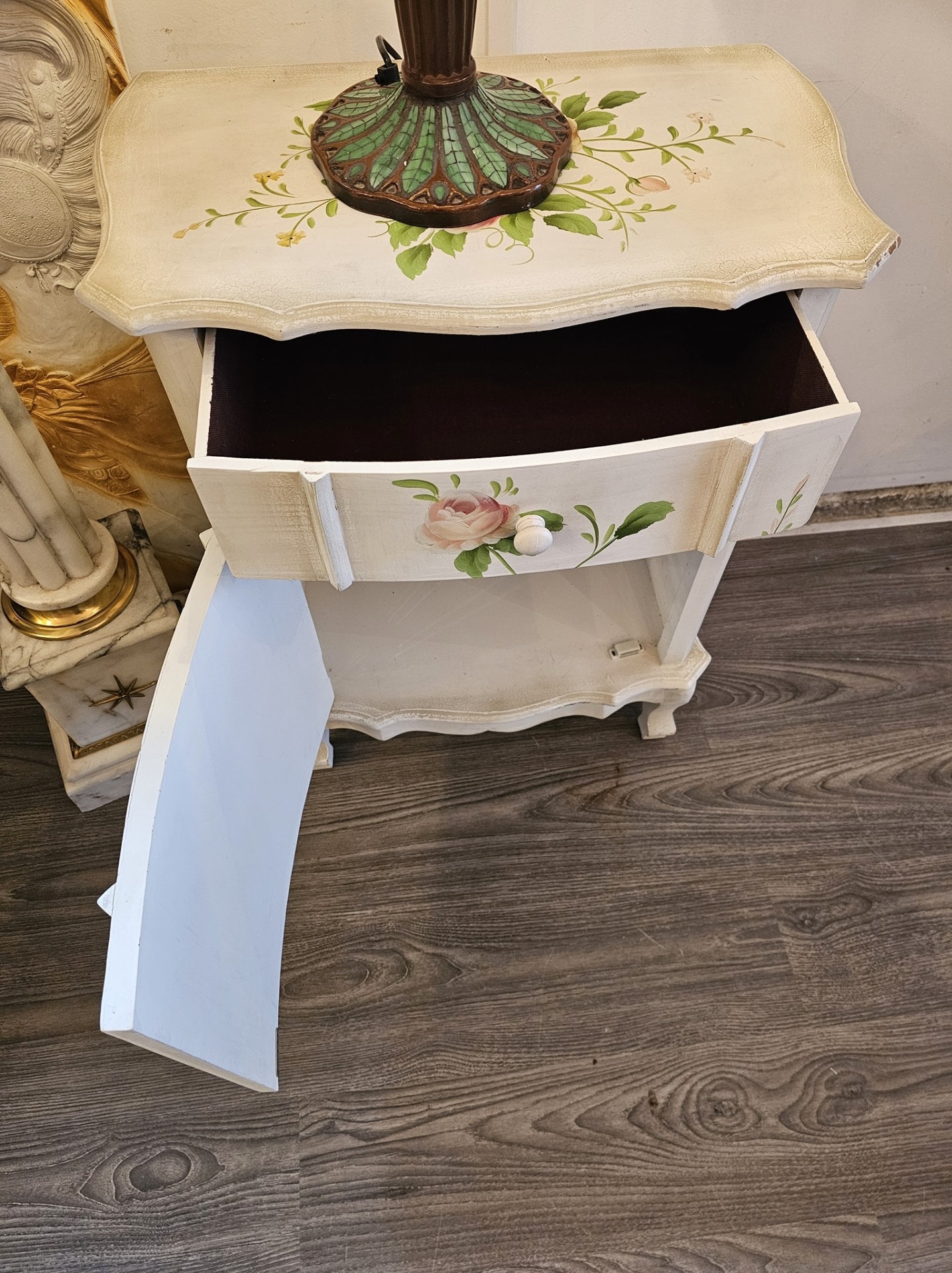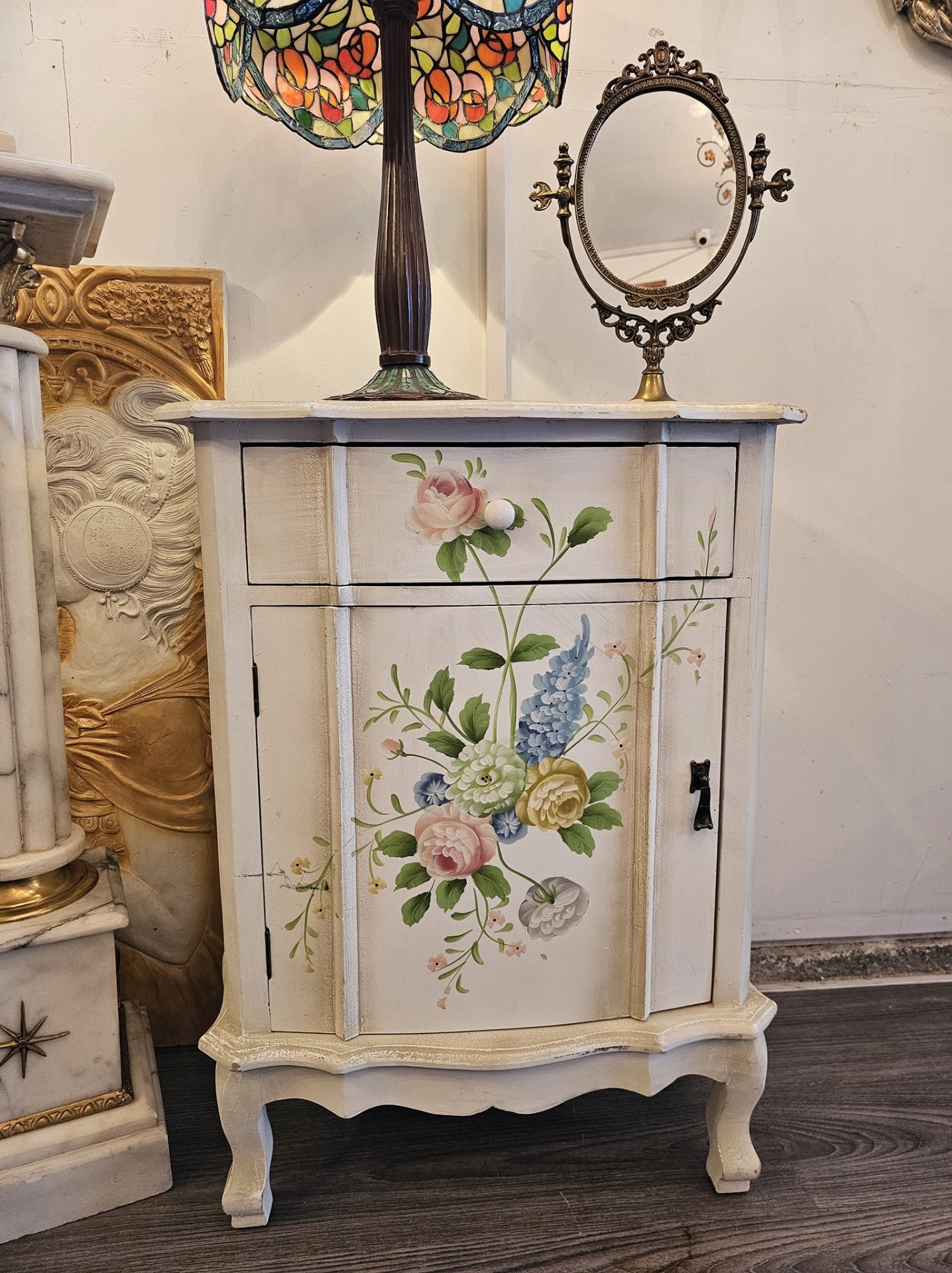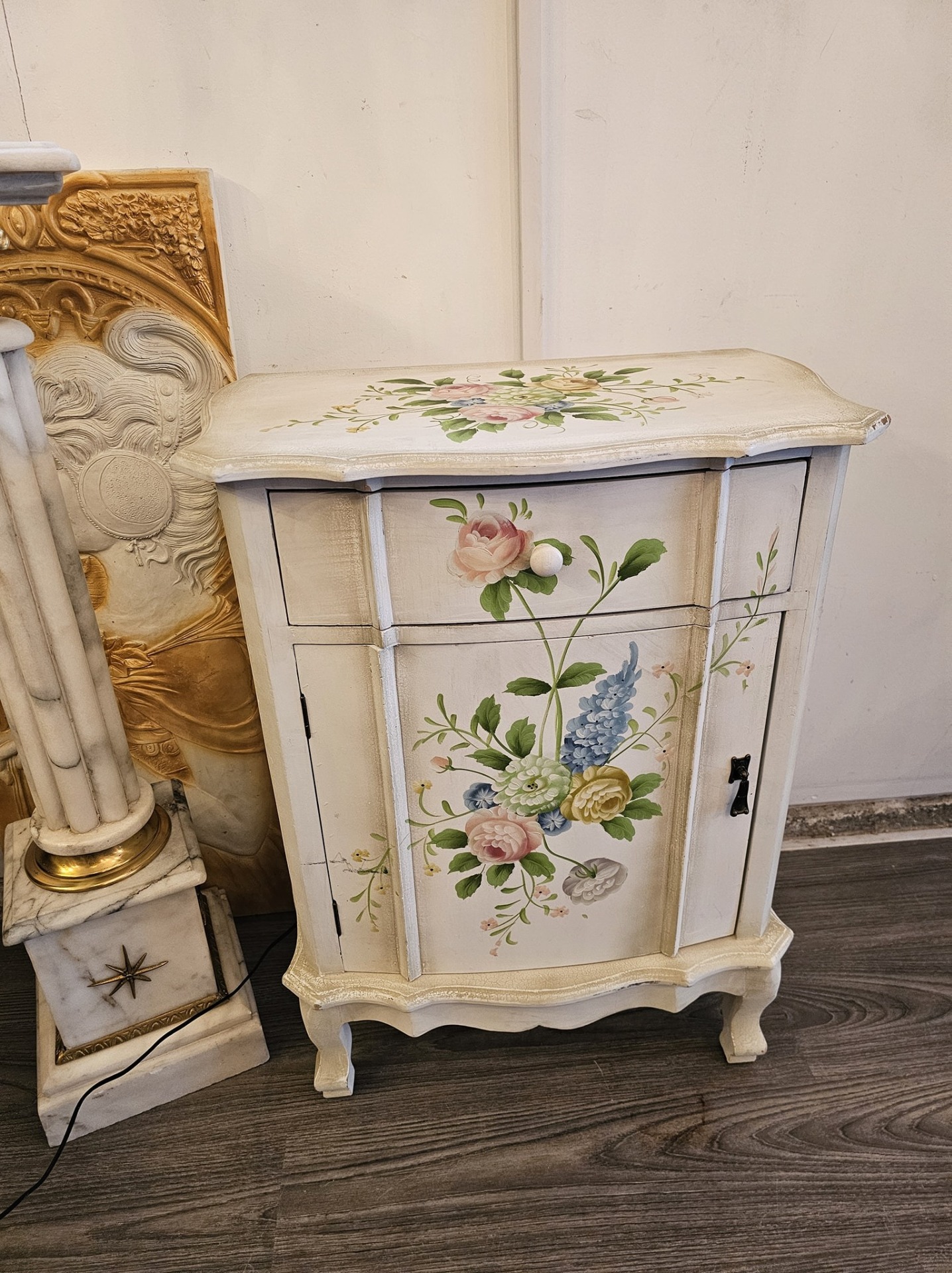 Comodă vintage pictată manual, cu un design romantic și elegant, perfectă pentru decorarea unui interior shabby chic, clasic sau rustic. Piesa este din lemn