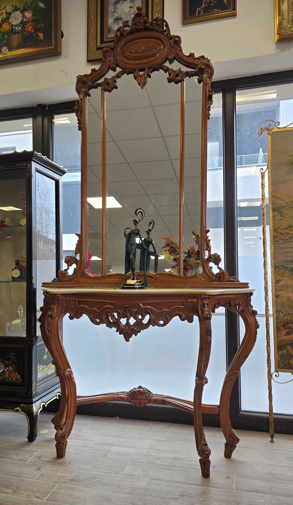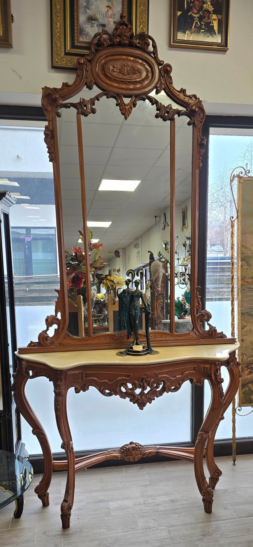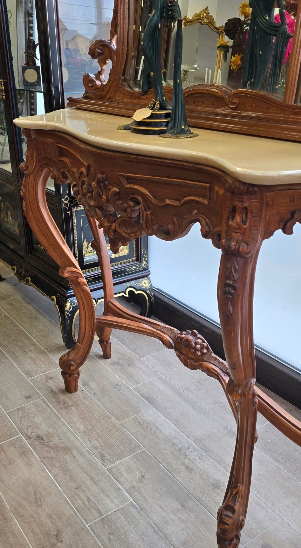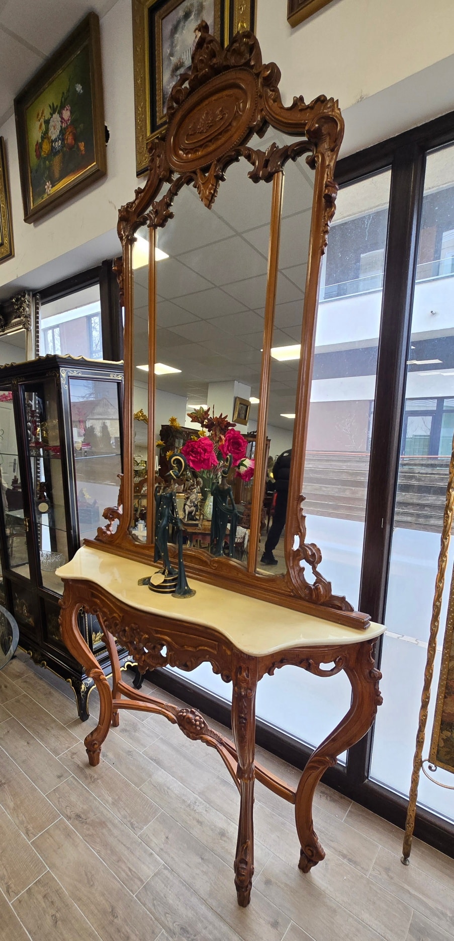Consolă cu oglindă, în stil Neobaroc cu influențe Rococoo, din lemn sculptat, cu linii curbe elegante și detalii sculptate manual, cu picioare înalte tip "cabriole" și elemente florale, cu blat din marmură naturală de culoare crem, decupată pe forma șerpuită a consolei, în stare impecabilă, oglindă înaltă, divizată în trei secțiuni, cu un fronton bogat ornamentat și medalion central.
