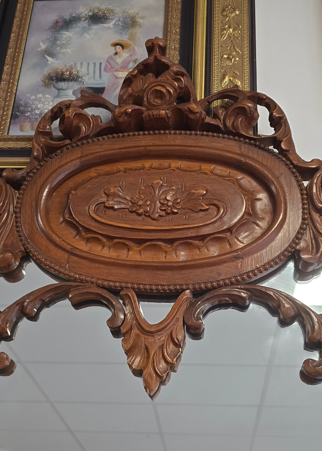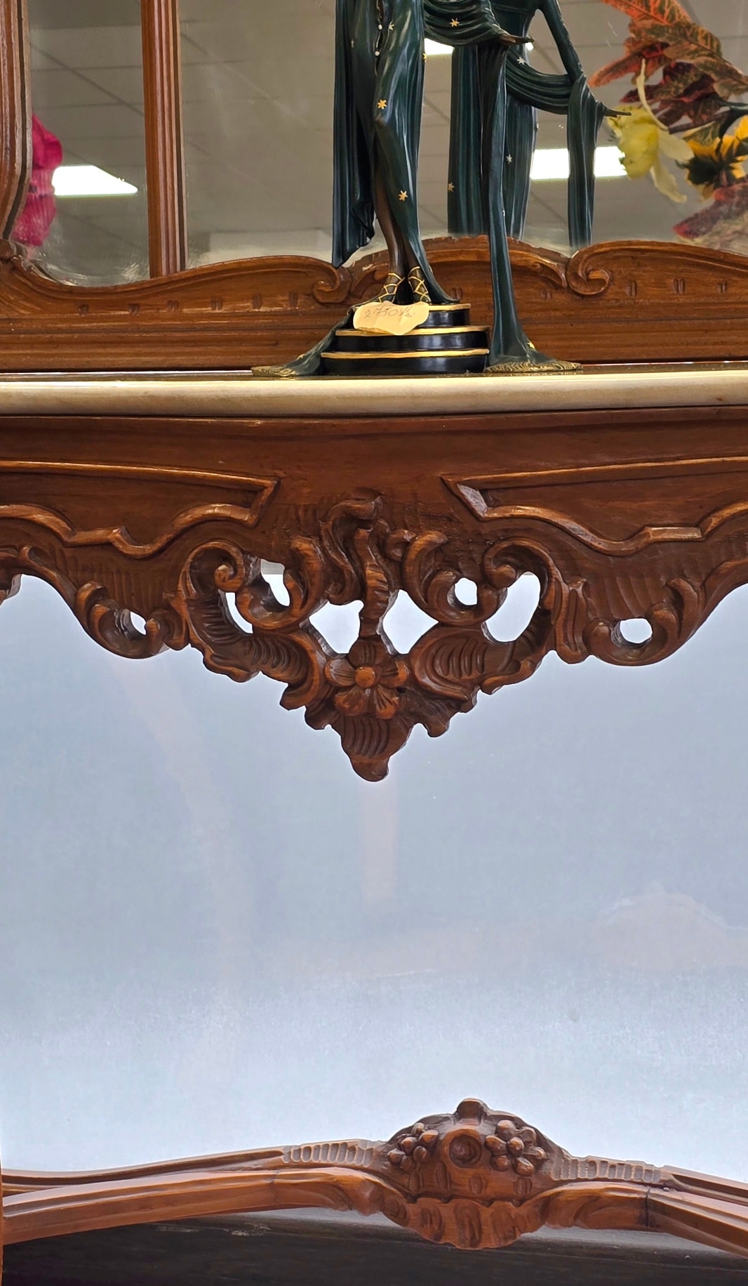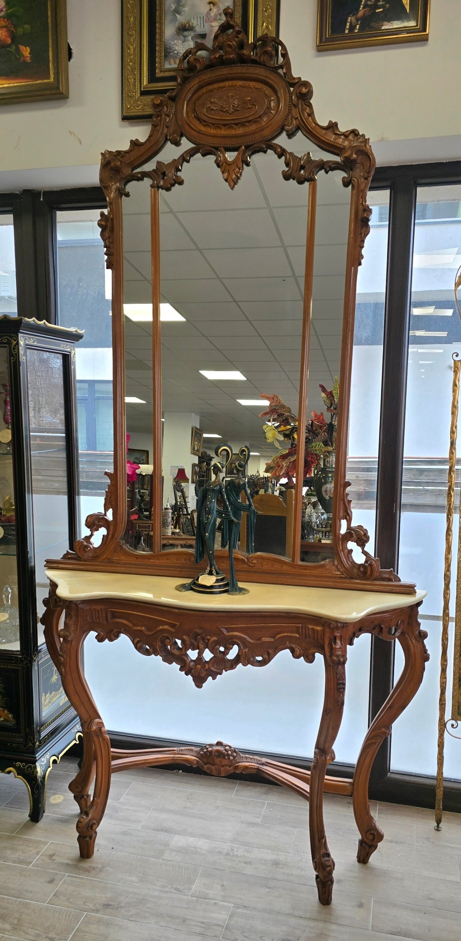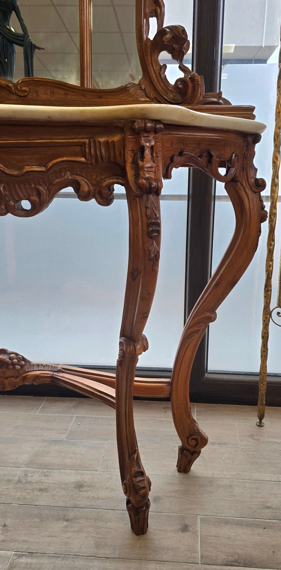 Consolă cu oglindă, în stil Neobaroc cu influențe Rococoo, din lemn sculptat, cu linii curbe elegante și detalii sculptate manual, cu picioare înalte tip "cabriole" și elemente florale, cu blat din marmură naturală de culoare crem, decupată pe forma șerpuită a consolei, în stare impecabilă, oglindă înaltă, divizată în trei secțiuni, cu un fronton bogat ornamentat și medalion central.