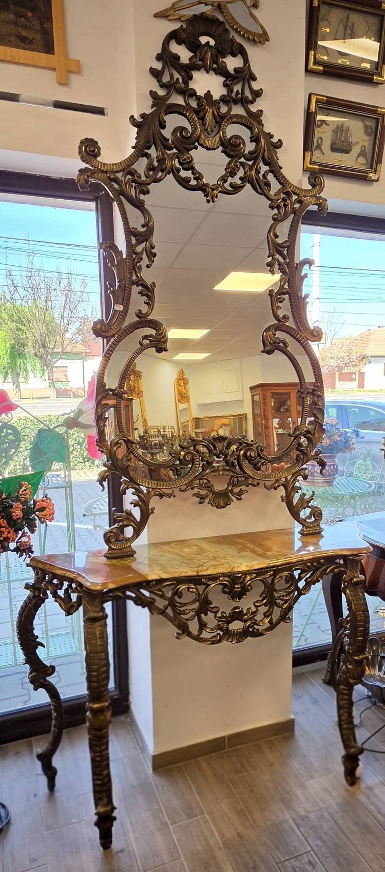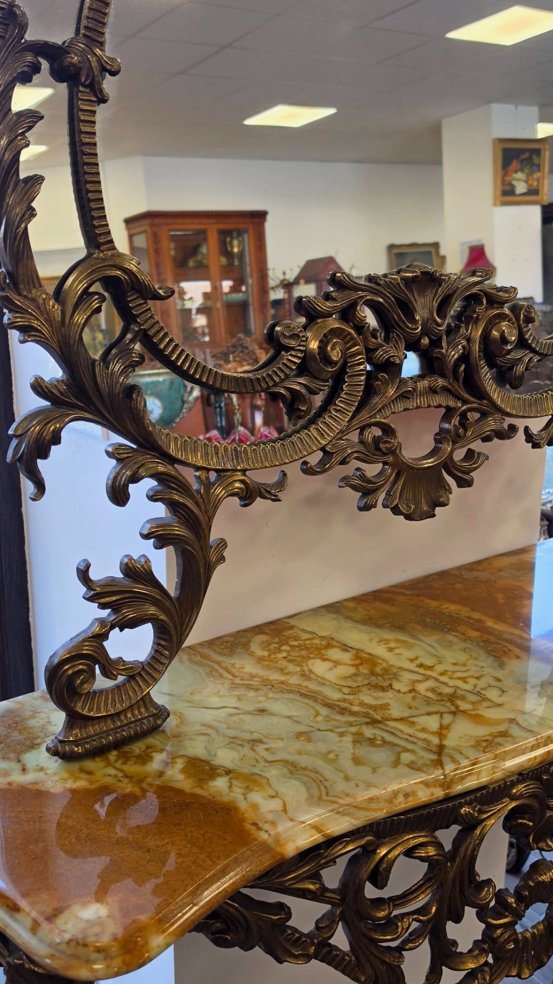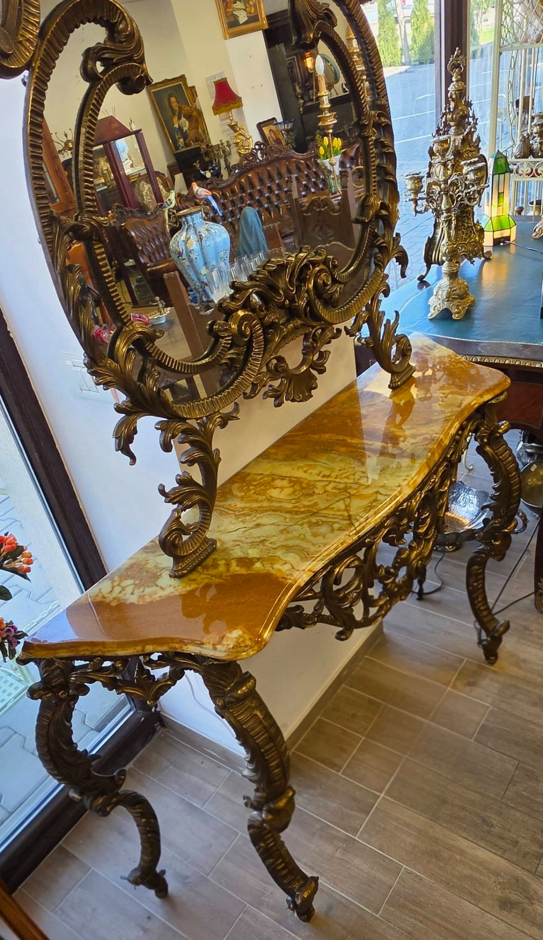 Consolă cu oglindă monumentală, în stil Baroc autentic, din bronz cu blat din onix, piesă „statement”, ideală pentru un hol elegant, un living generos sau un spațiu comercial de tip boutique/hotel de lux.