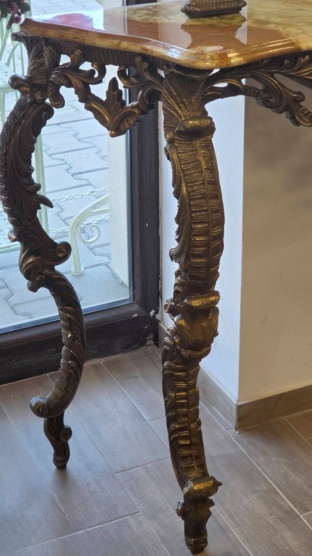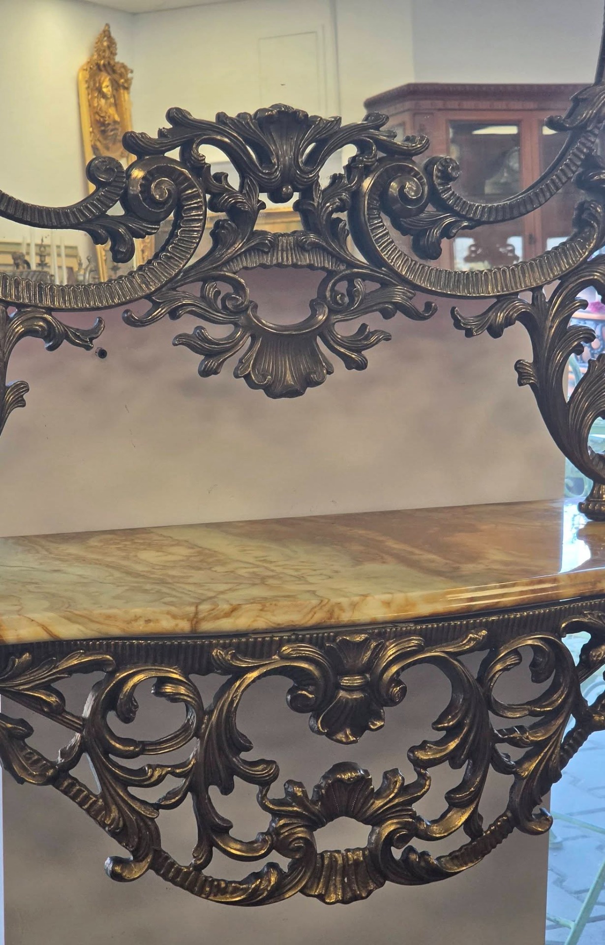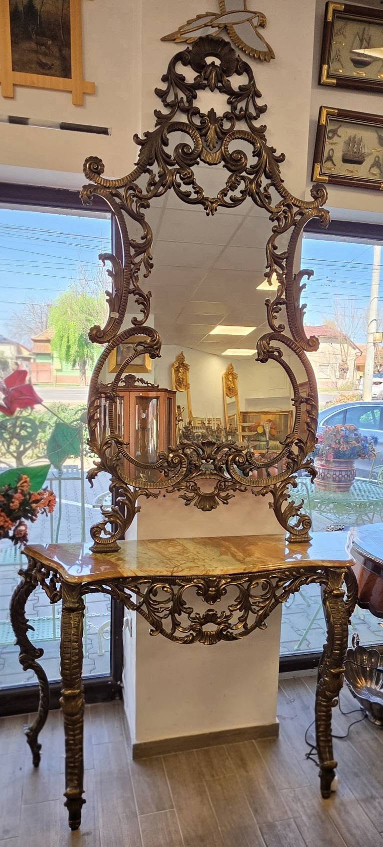 Consolă cu oglindă monumentală, în stil Baroc autentic, din bronz cu blat din onix, piesă „statement”, ideală pentru un hol elegant, un living generos sau un spațiu comercial de tip boutique/hotel de lux.