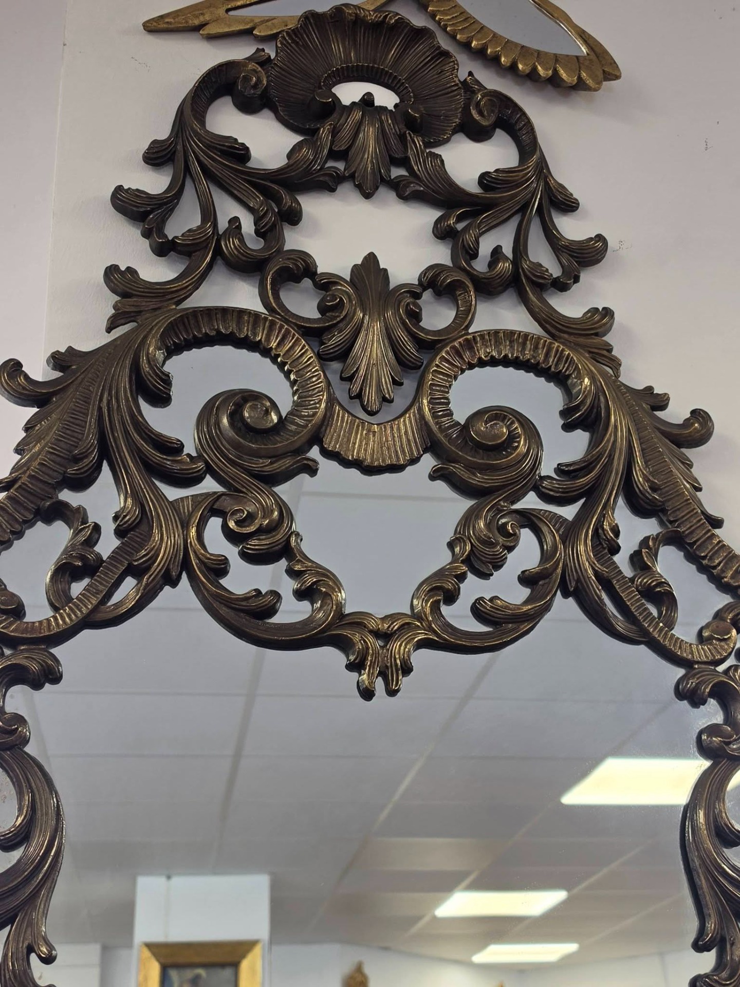 Structură masivă din bronz, decorată bogat cu motive florale, frunze de acant și elemente tip rocaille, cu patină originală care conferă profunzime detaliilor sculpturale.