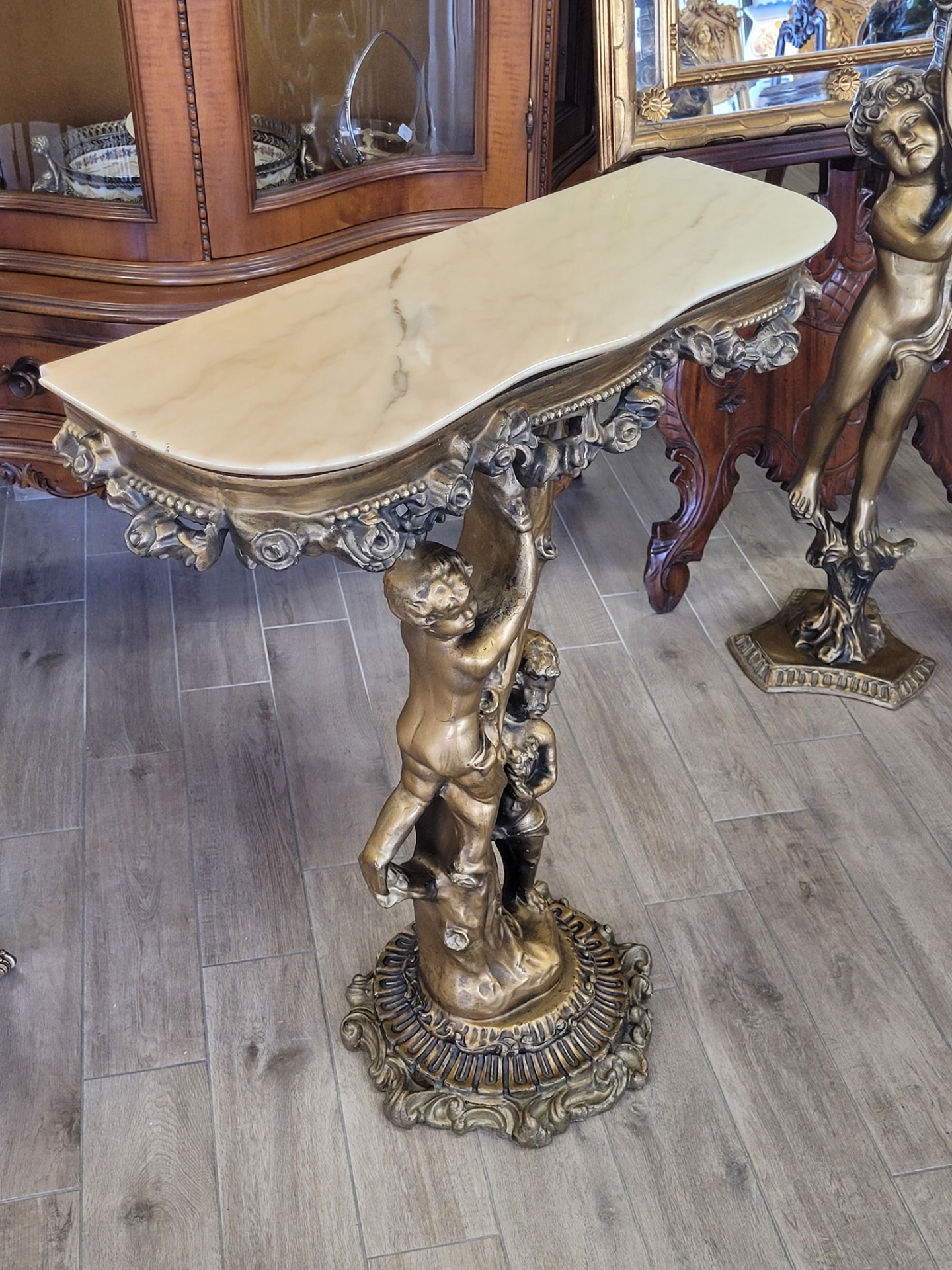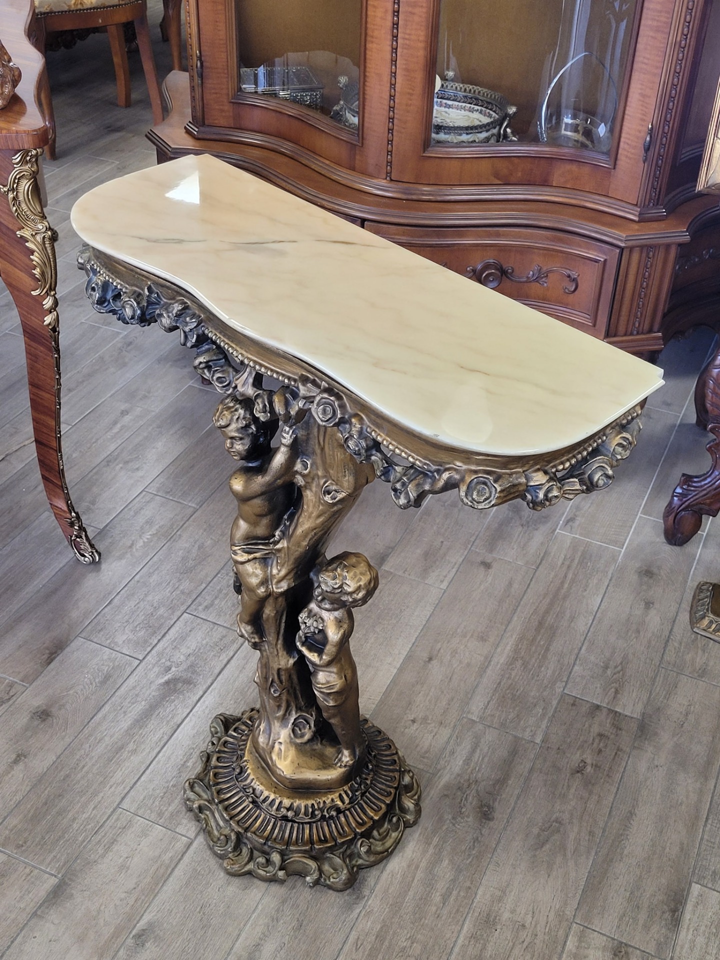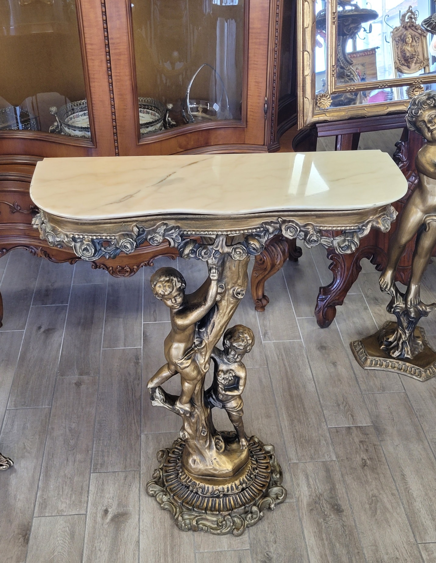Consolă în stil baroc, din rășină și blat din marmură, sculptură deosebită cu amorași Putti.