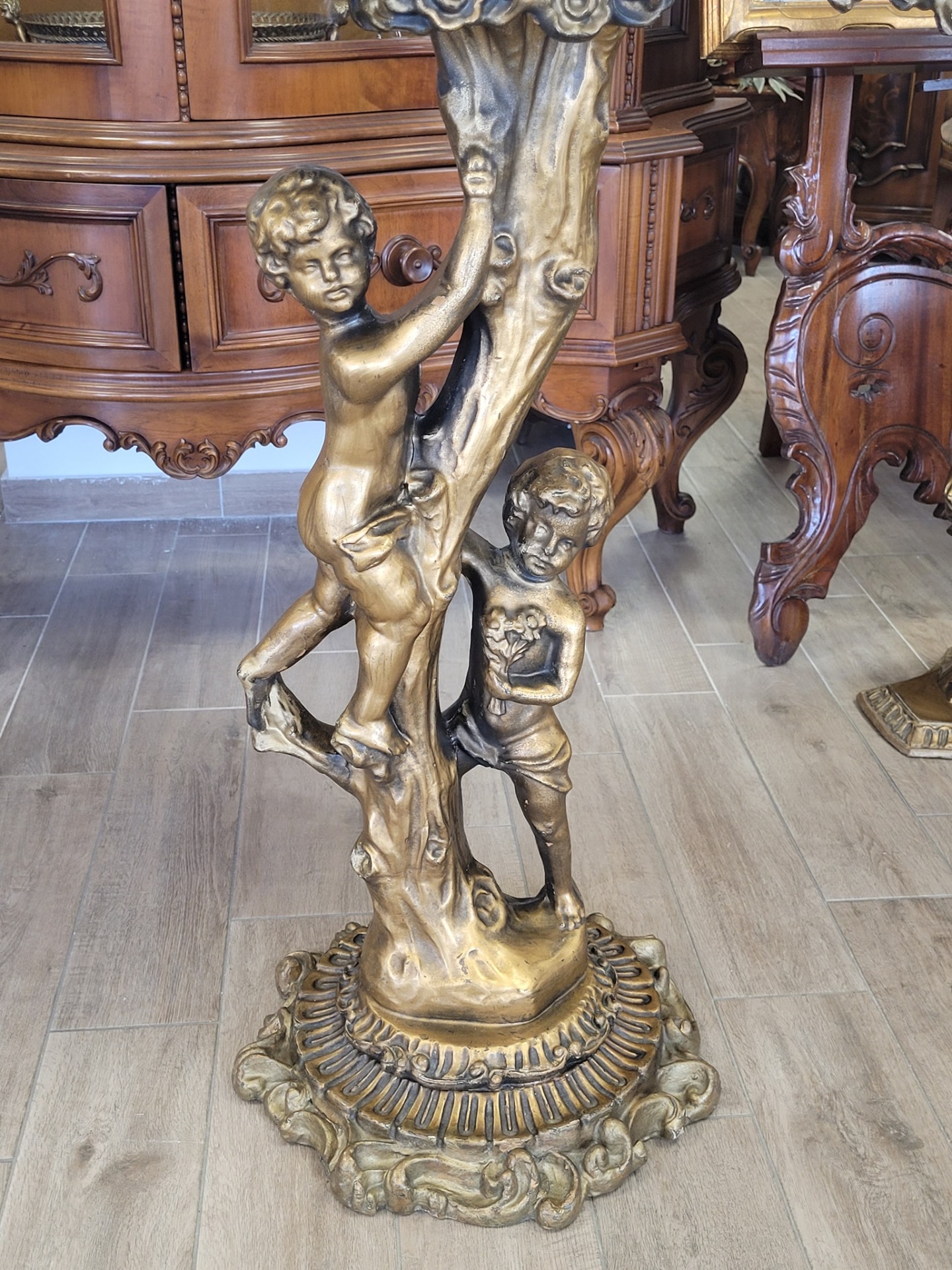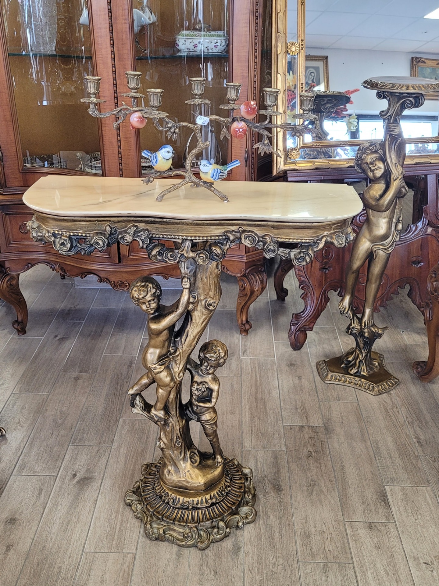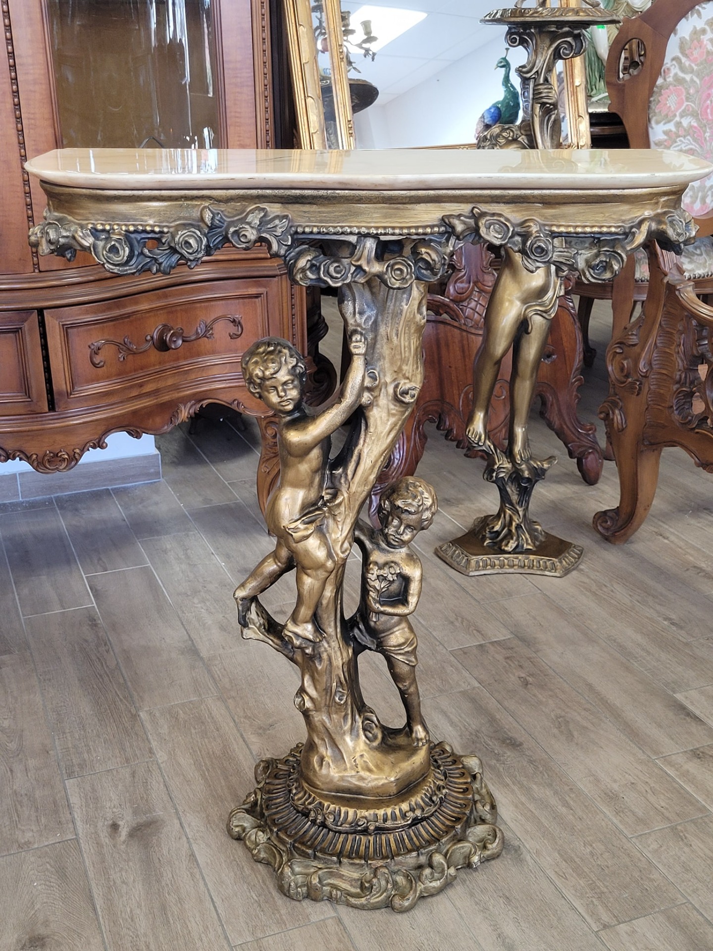 Consolă în stil baroc, din rășină și blat din marmură, sculptură deosebită cu amorași Putti.