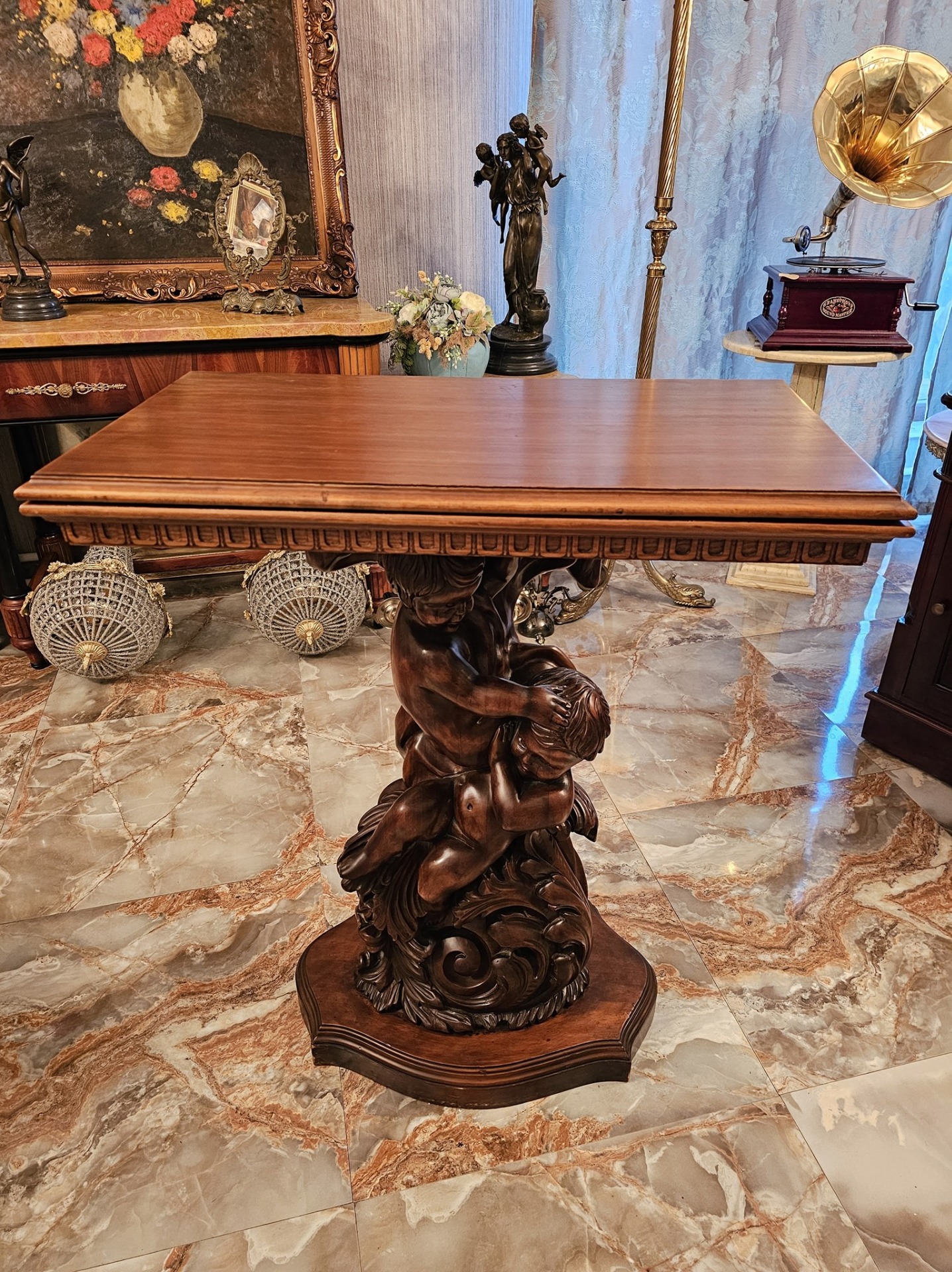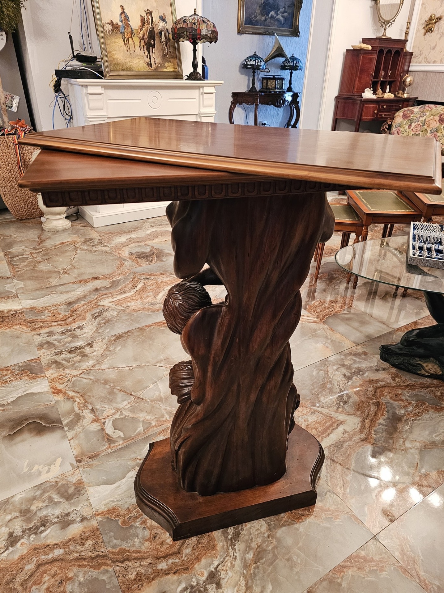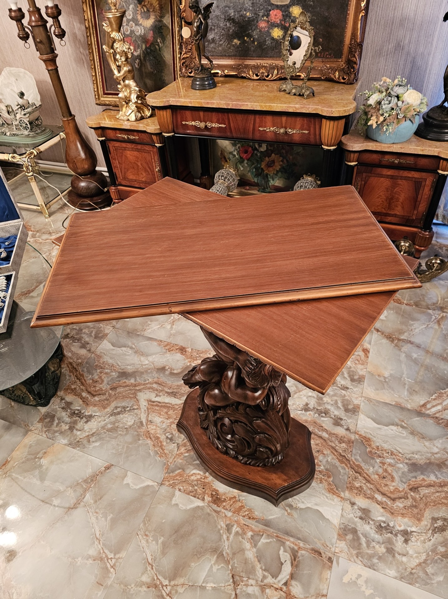 Consola veche din lemn cu amorasi si blat rotativ.