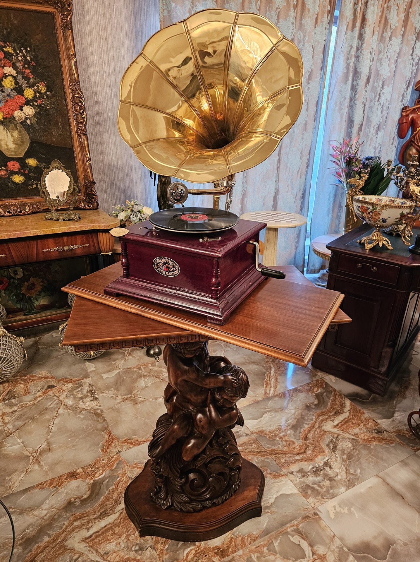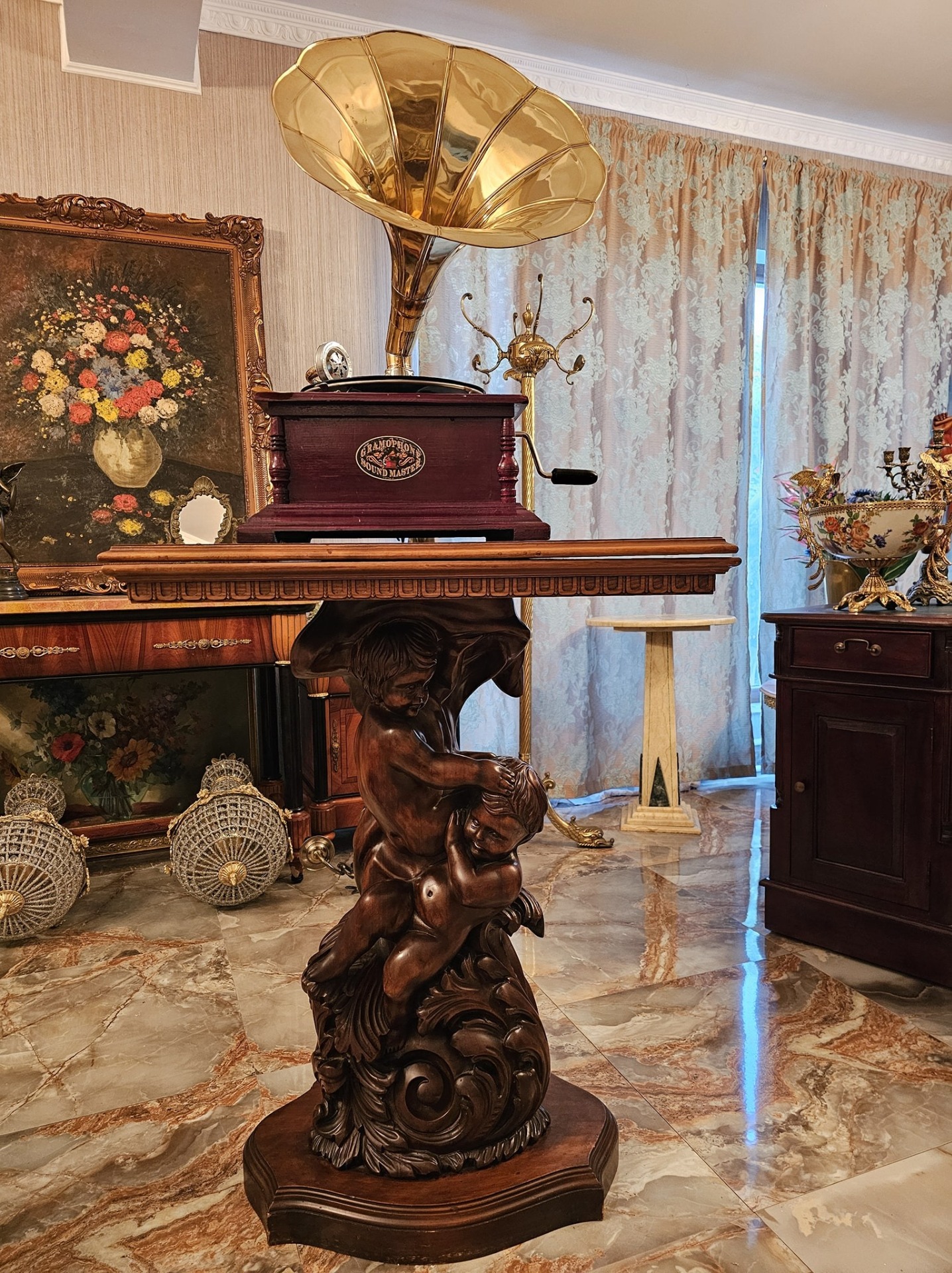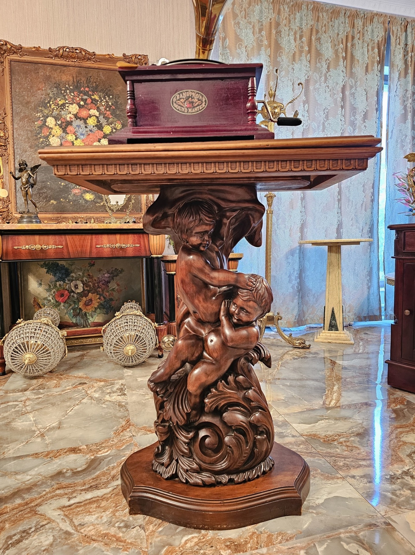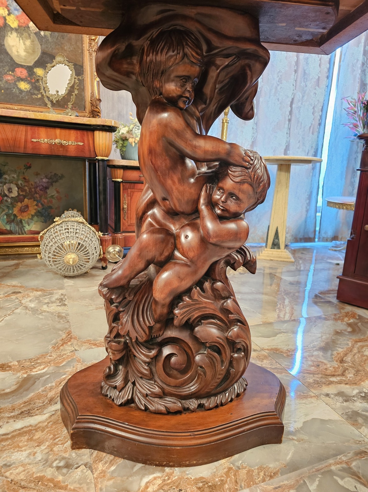 Consola veche din lemn cu amorasi si blat rotativ.