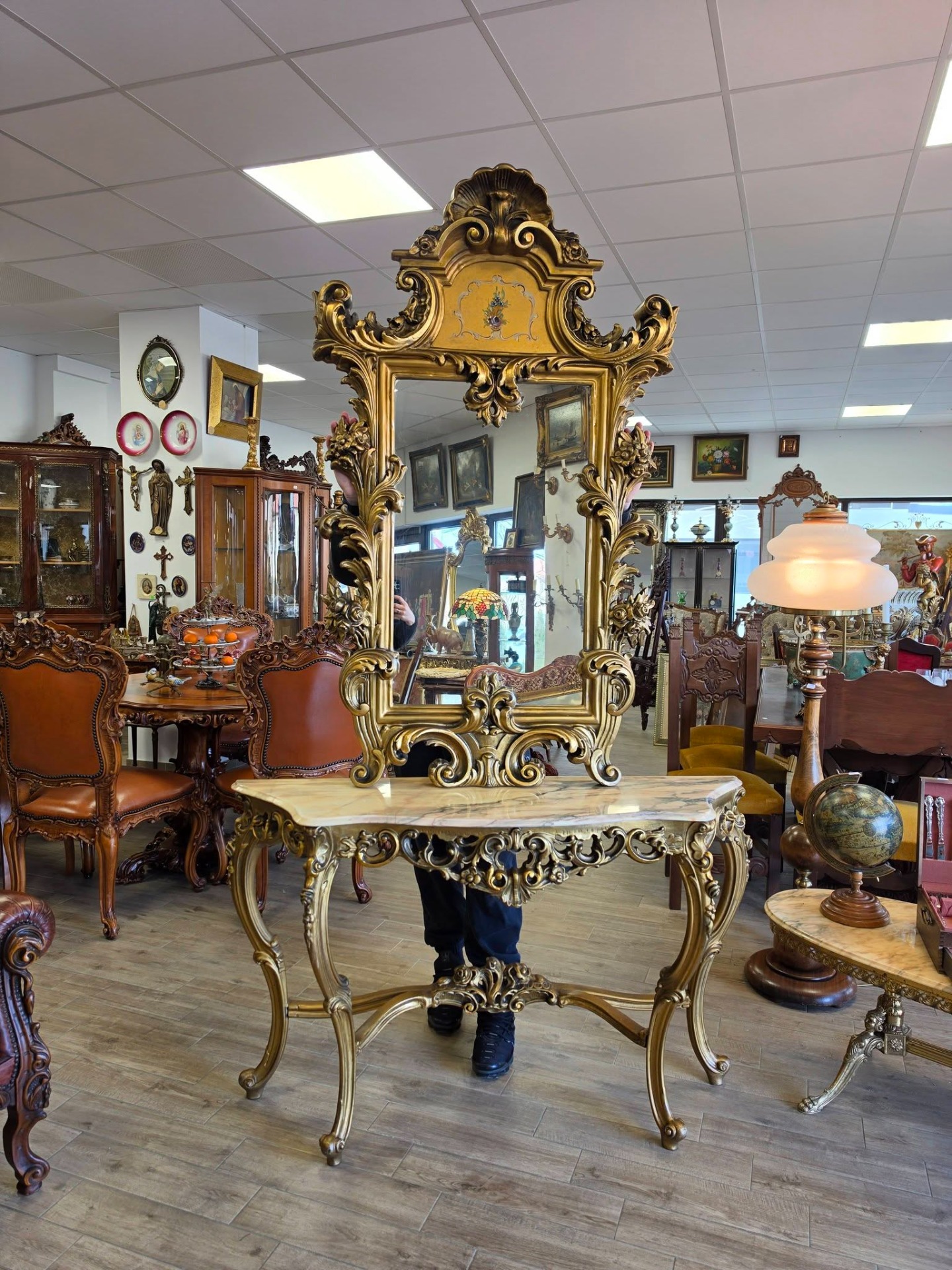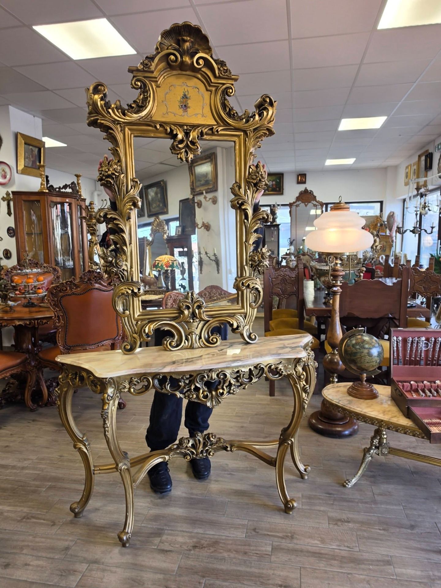Set elegant format din consolă și oglindă, realizat în stil baroc/rococo, cu detalii bogat ornamentate și finisaj auriu patinat. O piesă spectaculoasă care atrage imediat atenția și oferă un aer luxos oricărui interior.