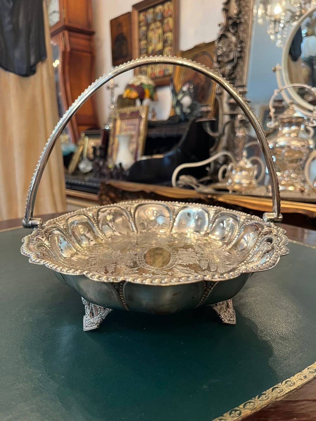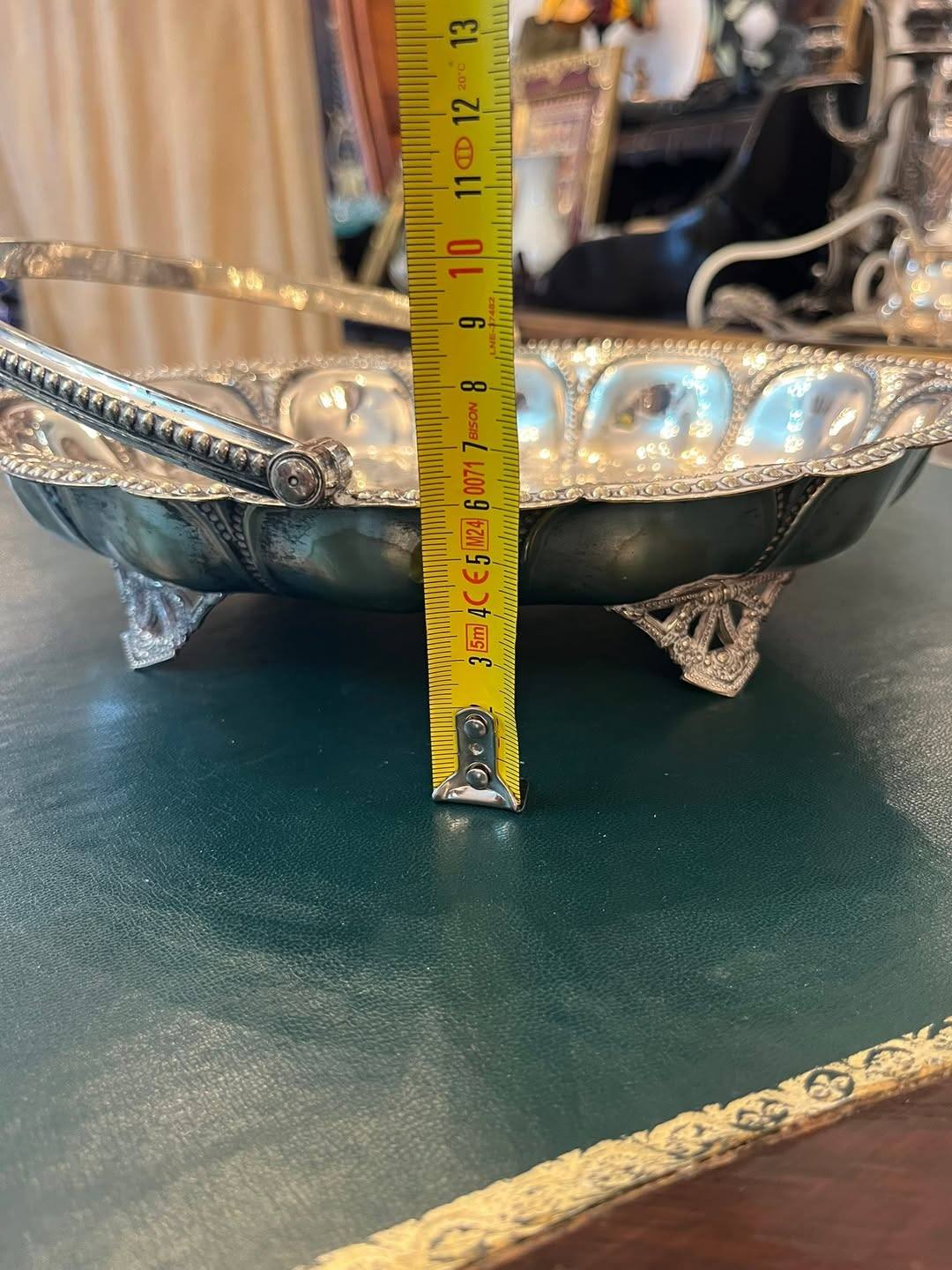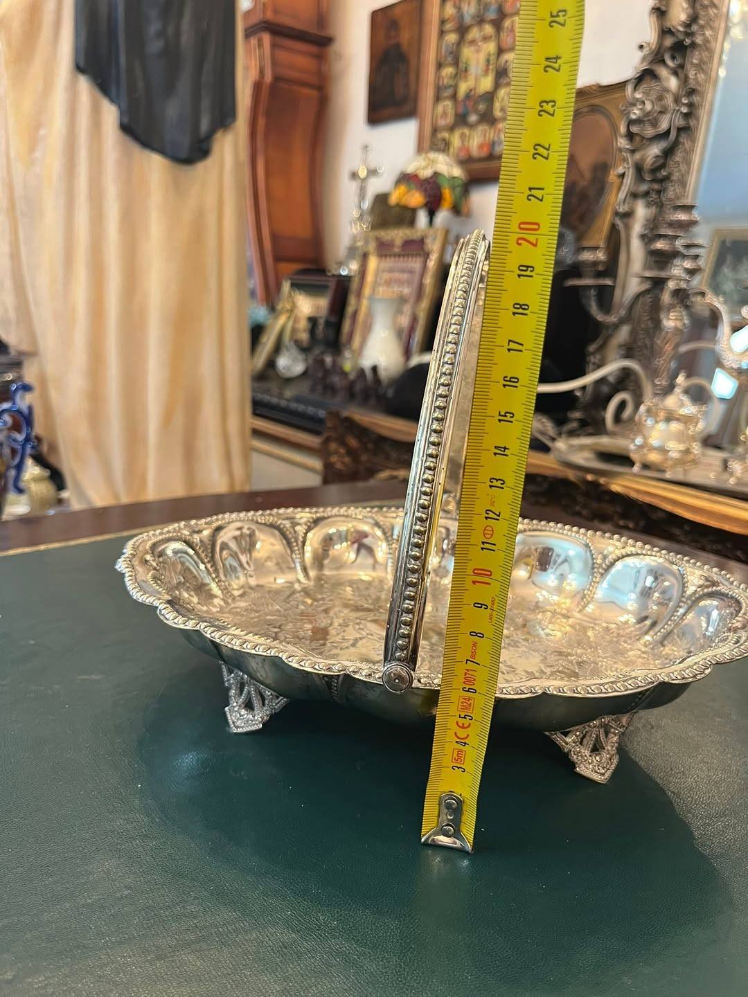 Coș decorativ argintat, realizat într-un stil clasic, cu un design elegant și detalii atent lucrate. Piesa este prevăzută cu mâner mobil decorat fin și este