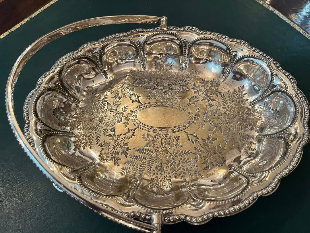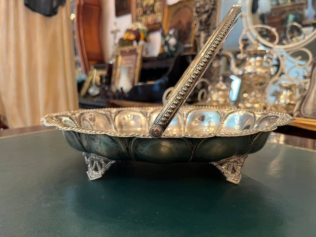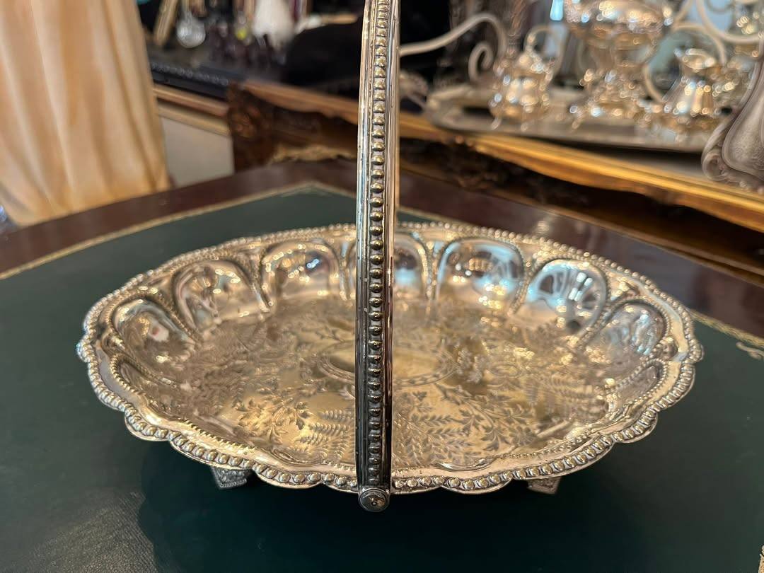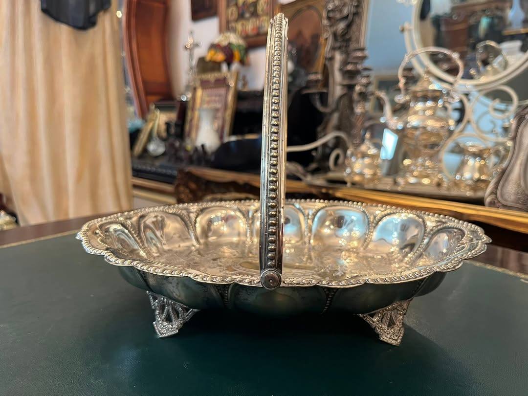 Coș decorativ argintat, realizat într-un stil clasic, cu un design elegant și detalii atent lucrate. Piesa este prevăzută cu mâner mobil decorat fin și este