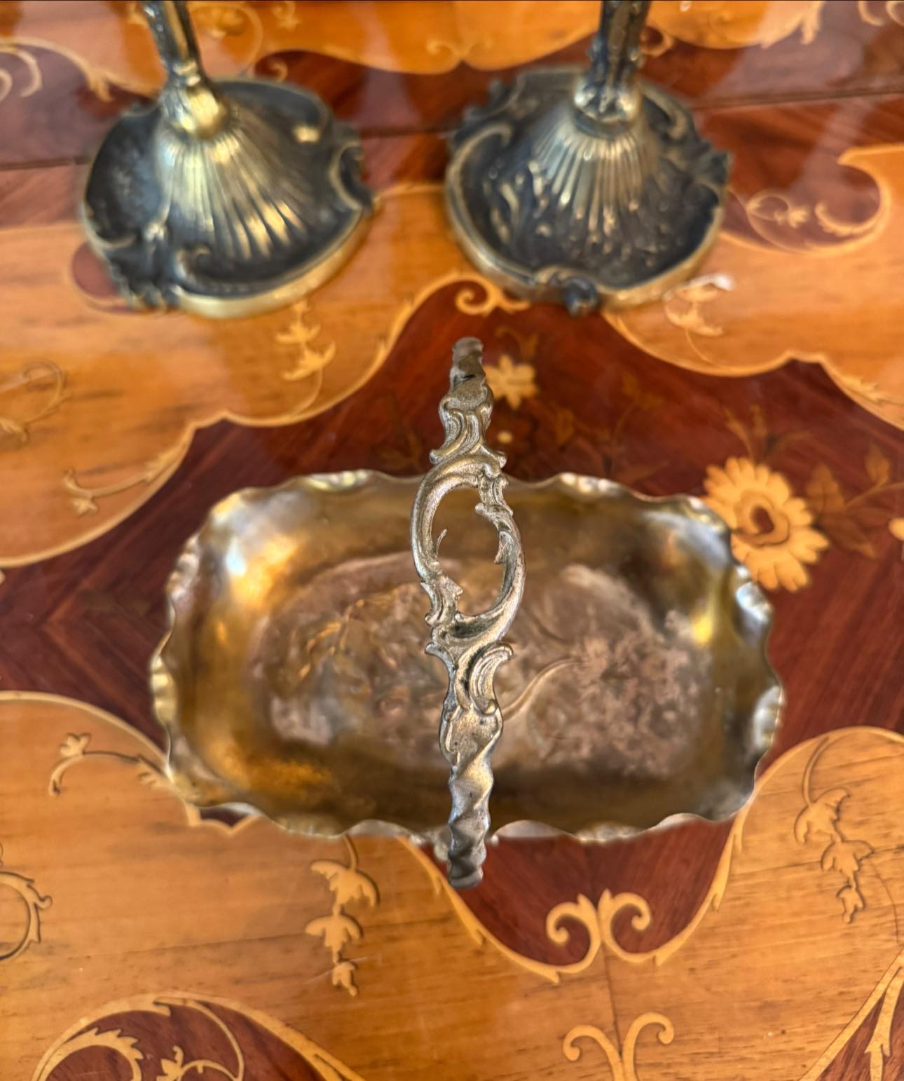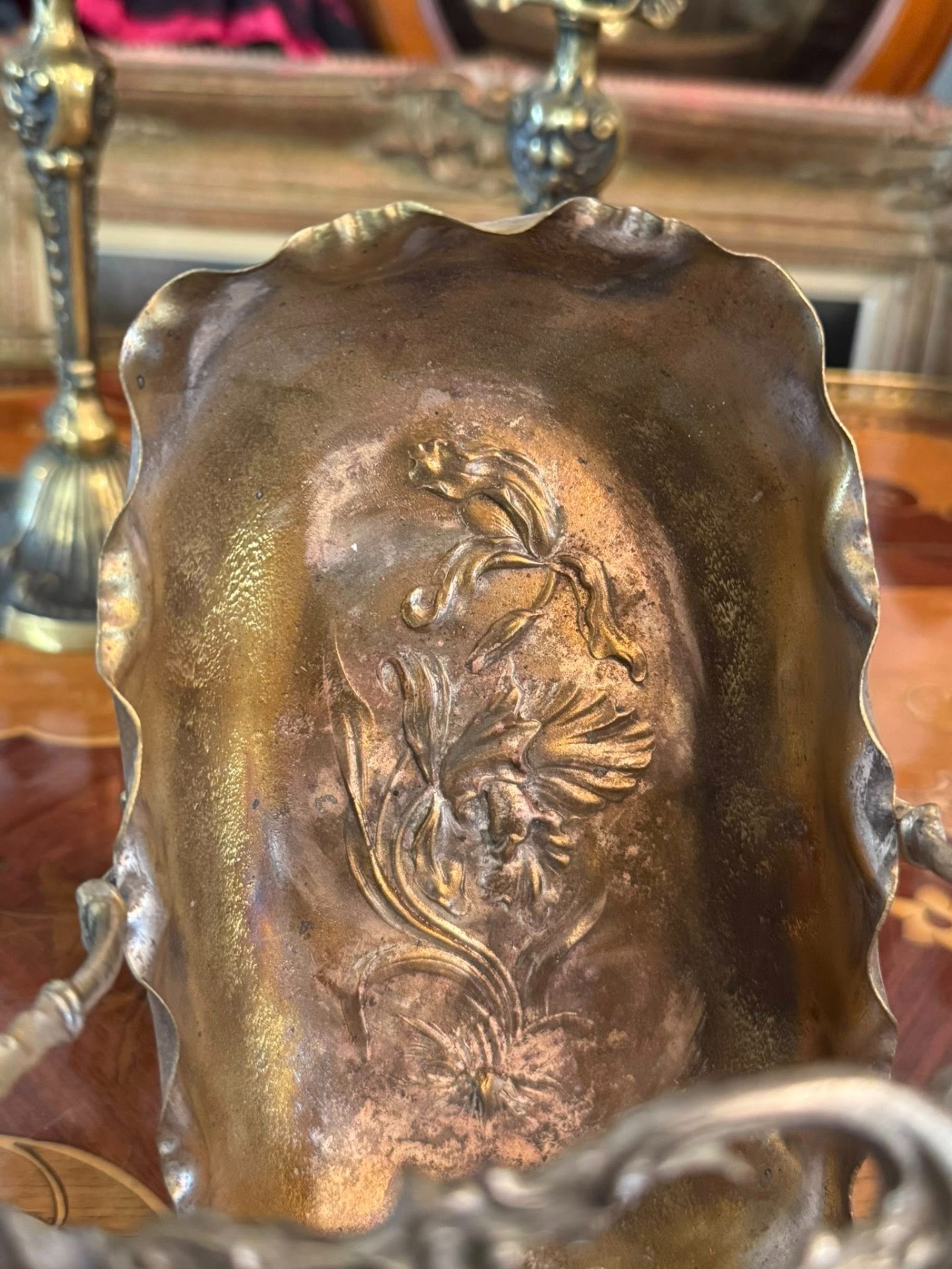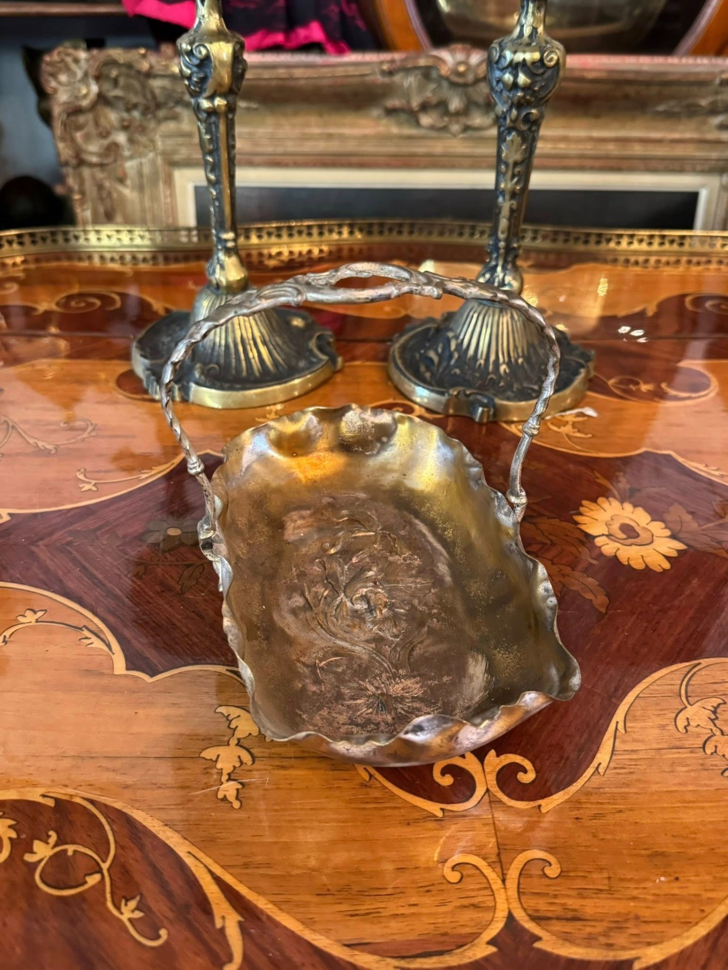 Coșuleț decorativ de tip bonbonnière, în stil Art Nouveau. Fundul coșulețului prezintă un decor în repoussé (metal bătut din spate) cu motive florale, adăugând un detaliu artistic care iese în relief. (Franța, cca 1910)