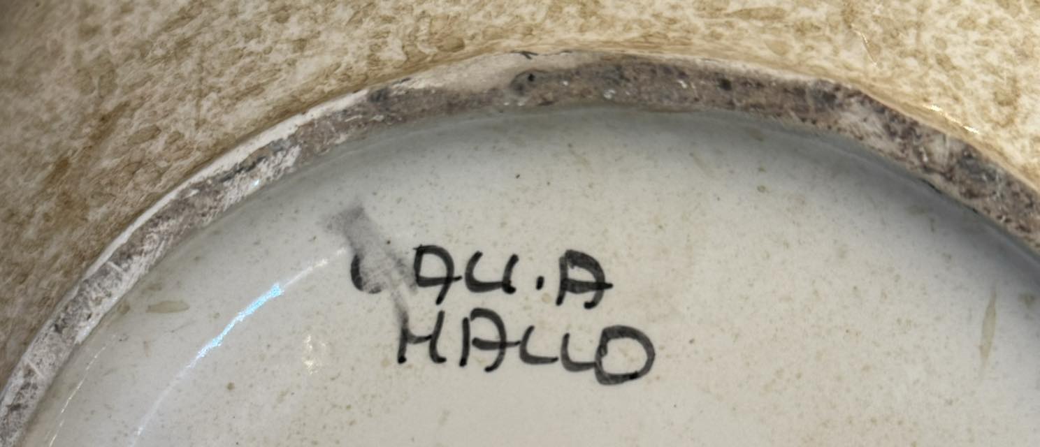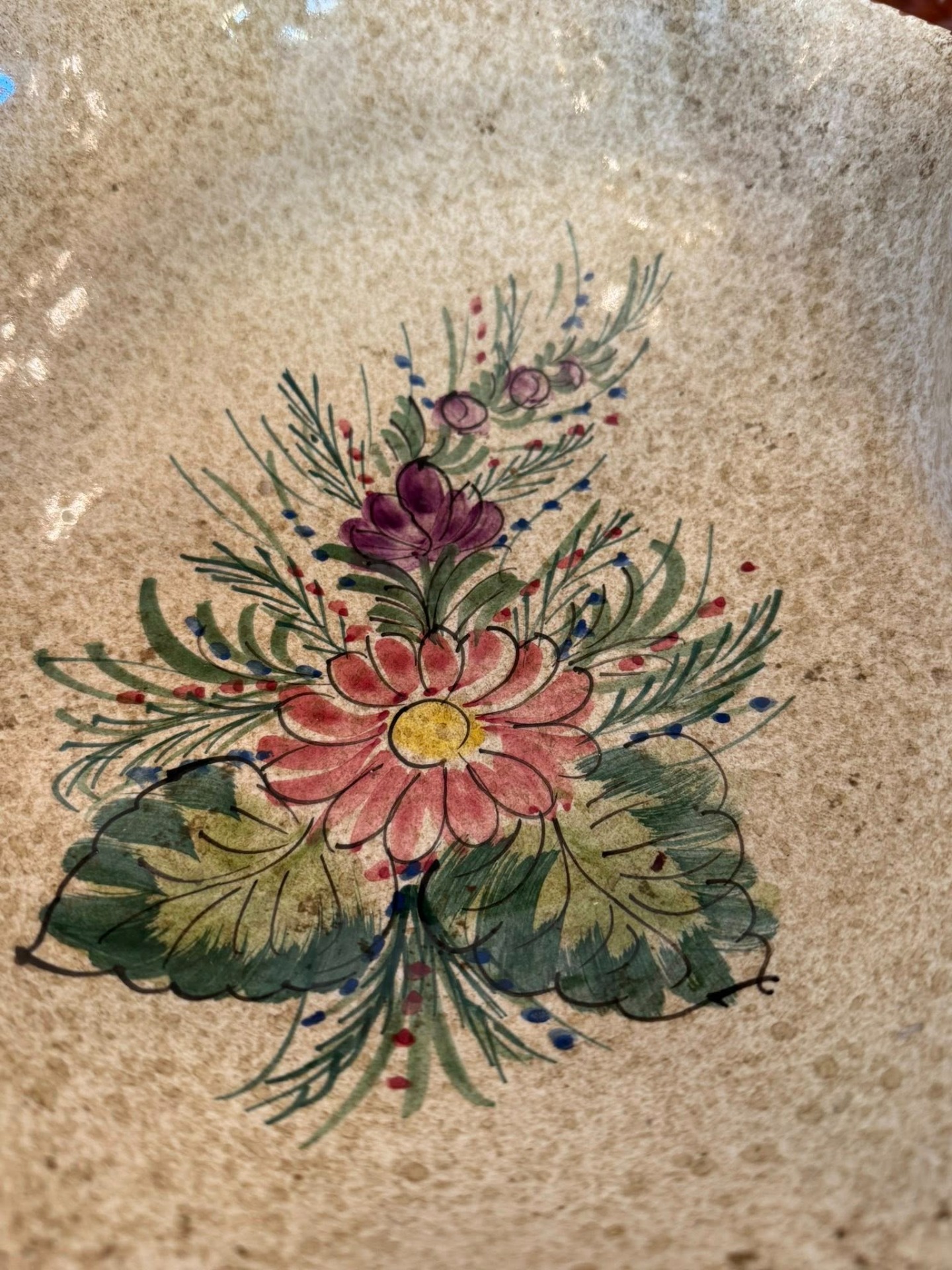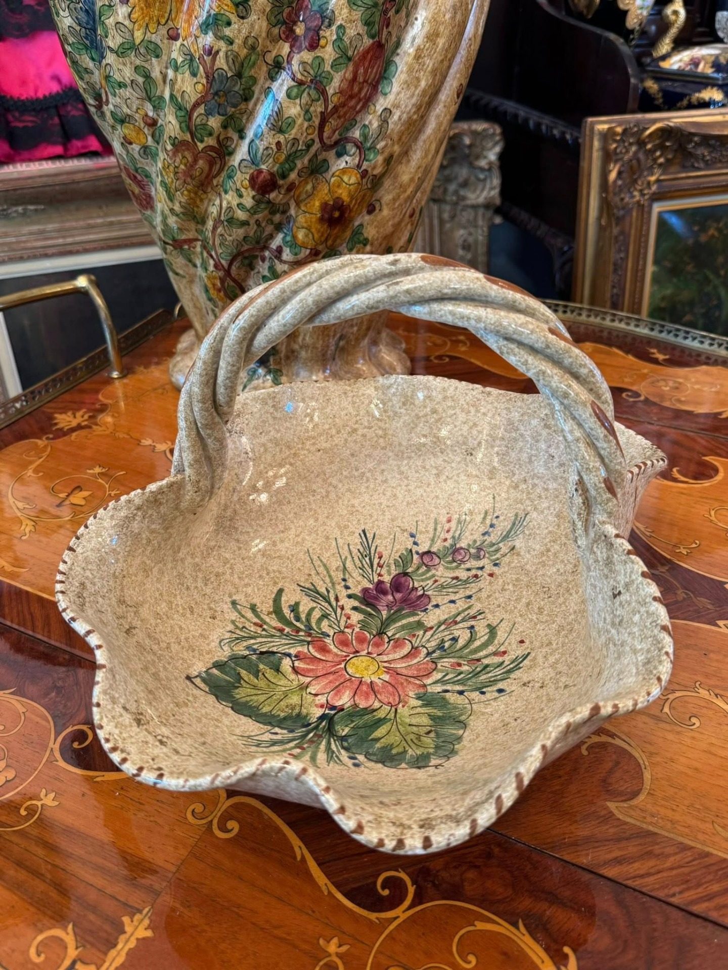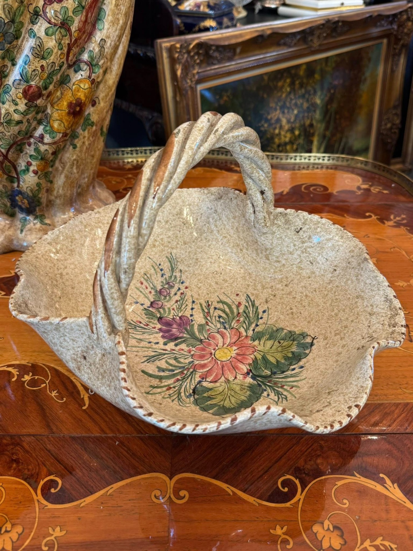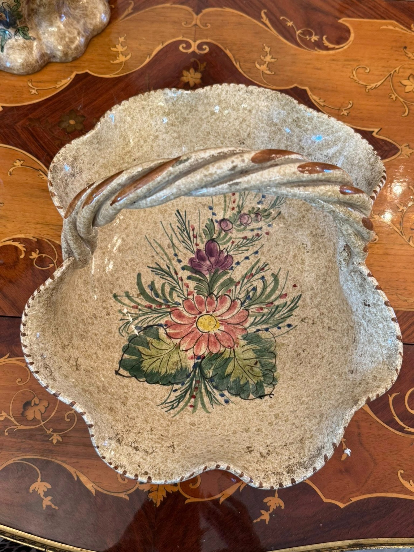 Coșuleț decorativ din ceramică realizat într-un stil rustic, cu motiv floral .(Italia, cca 1960)
