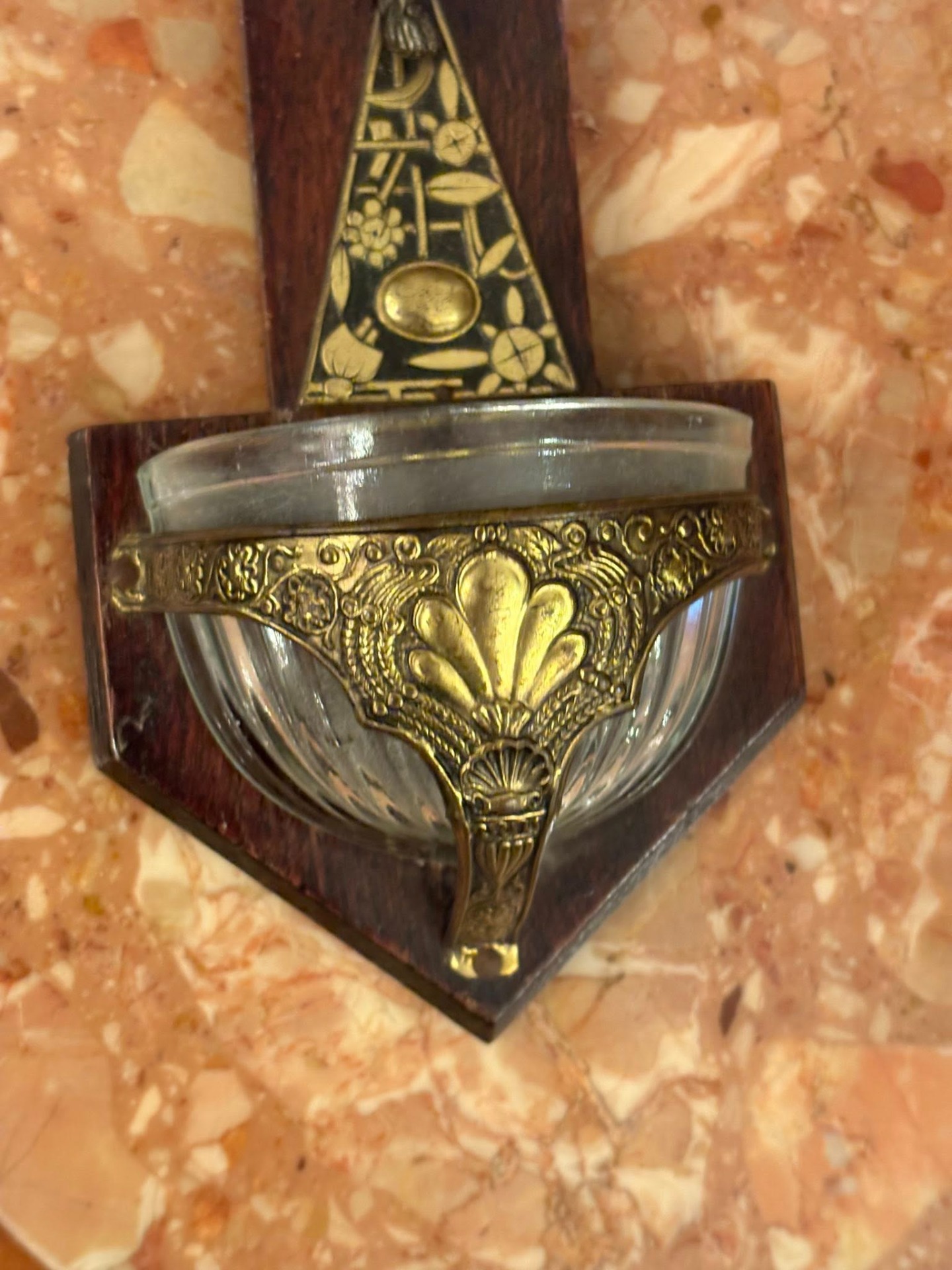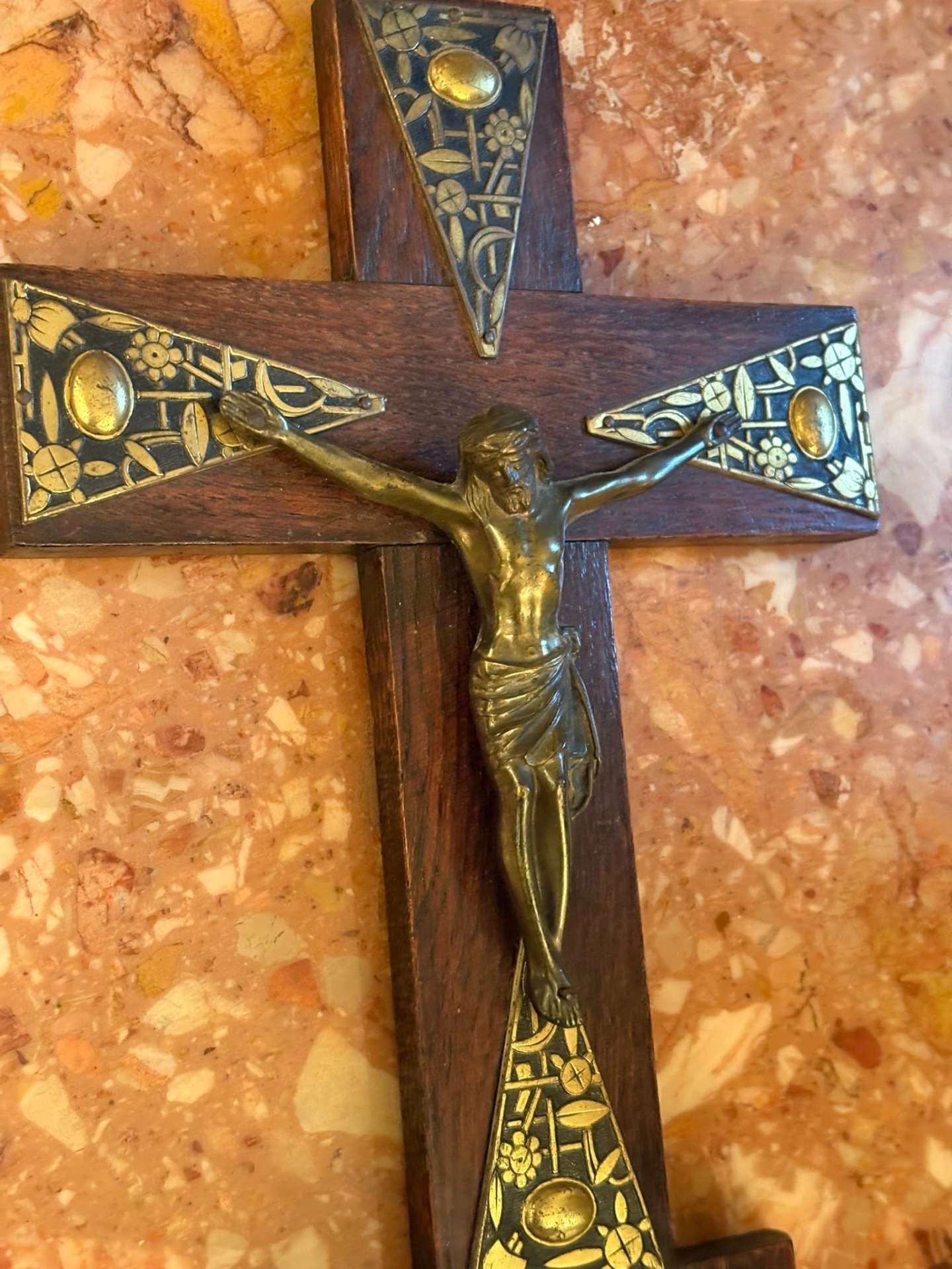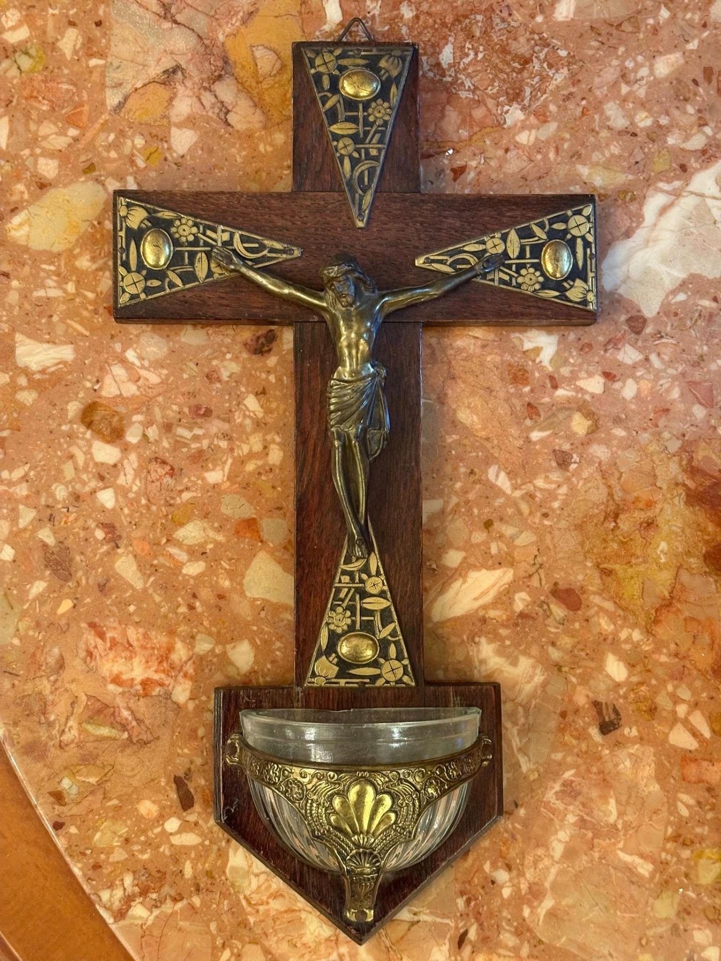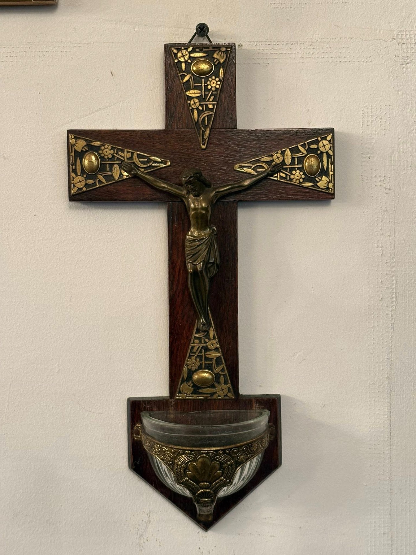 Crucifix vechi de perete, realizat pe suport din lemn masiv, cu detalii decorative din alamă și vas din sticlă pentru apă sfințită. Piesa prezintă un Isus din