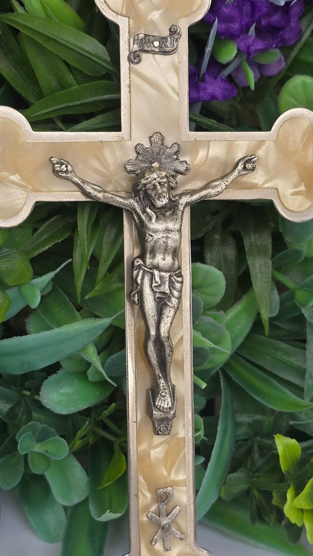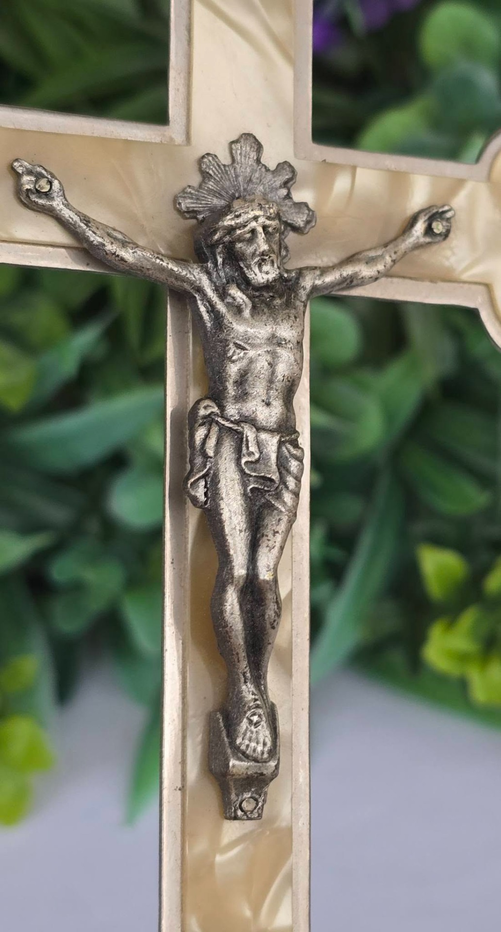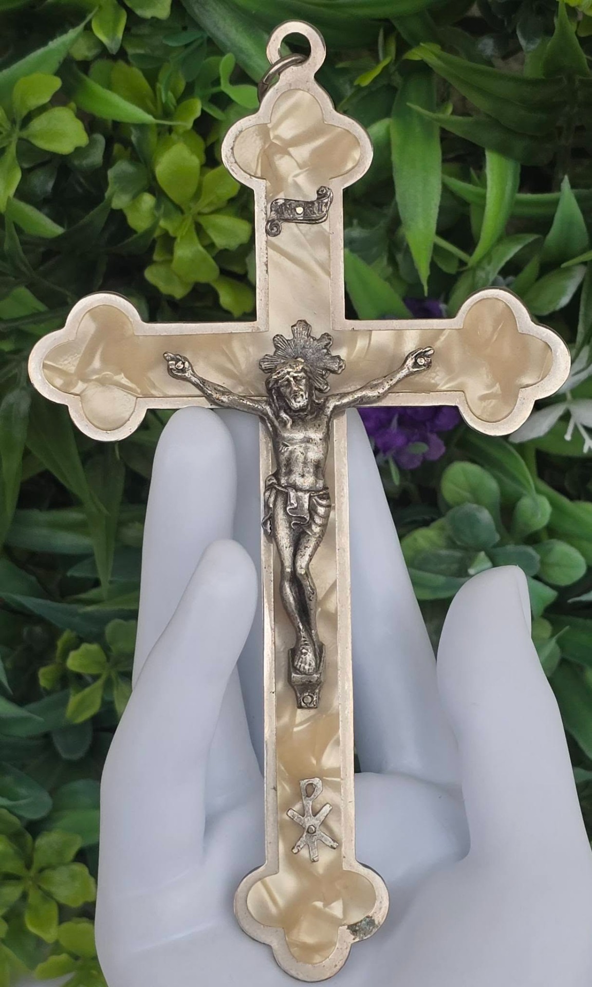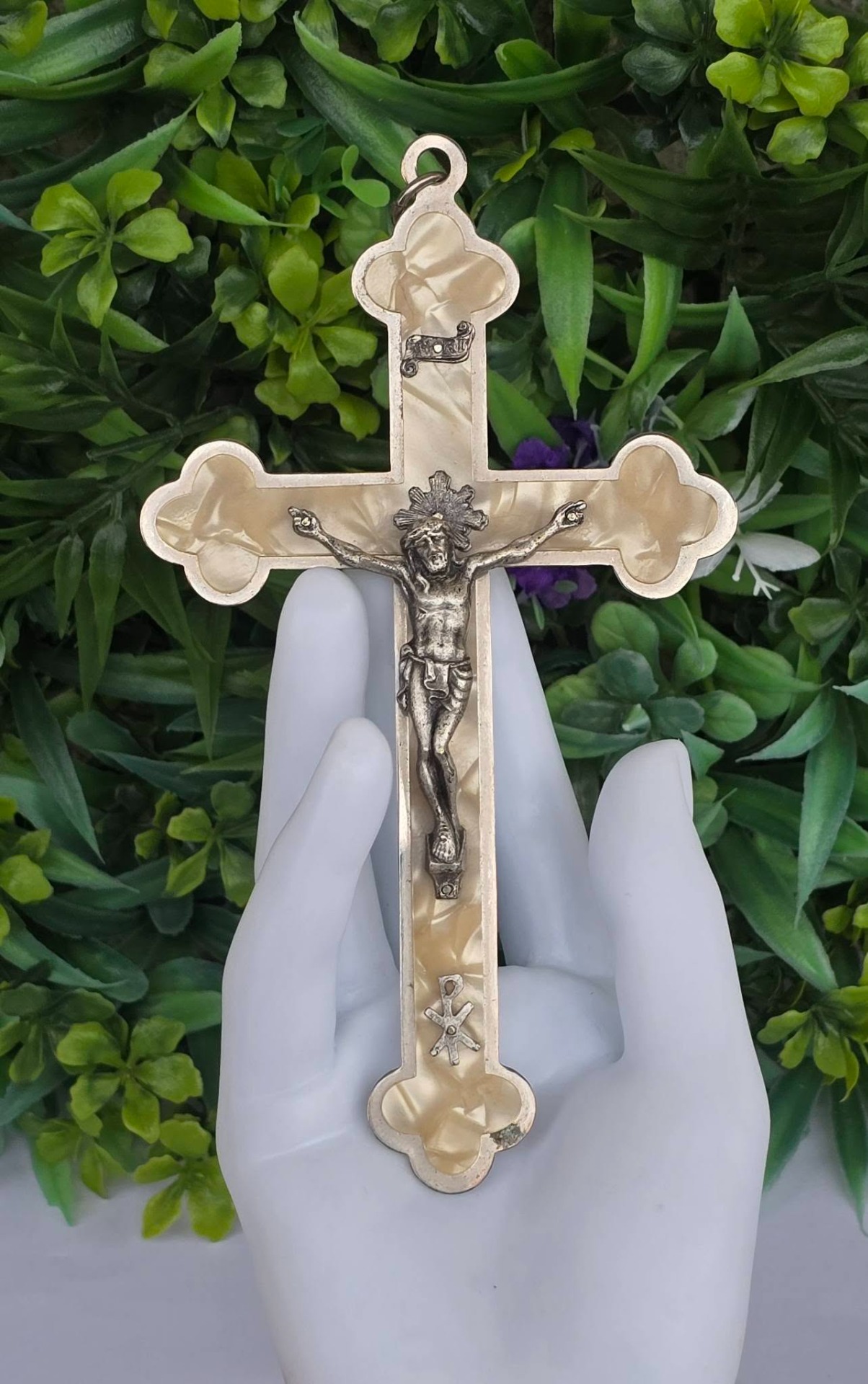 Crucifix vechi din metal argintat și sidef "faux" (celuloid "French Ivory"), cu detalii frumos lucrate manual (anii 1950-1960, Franța).