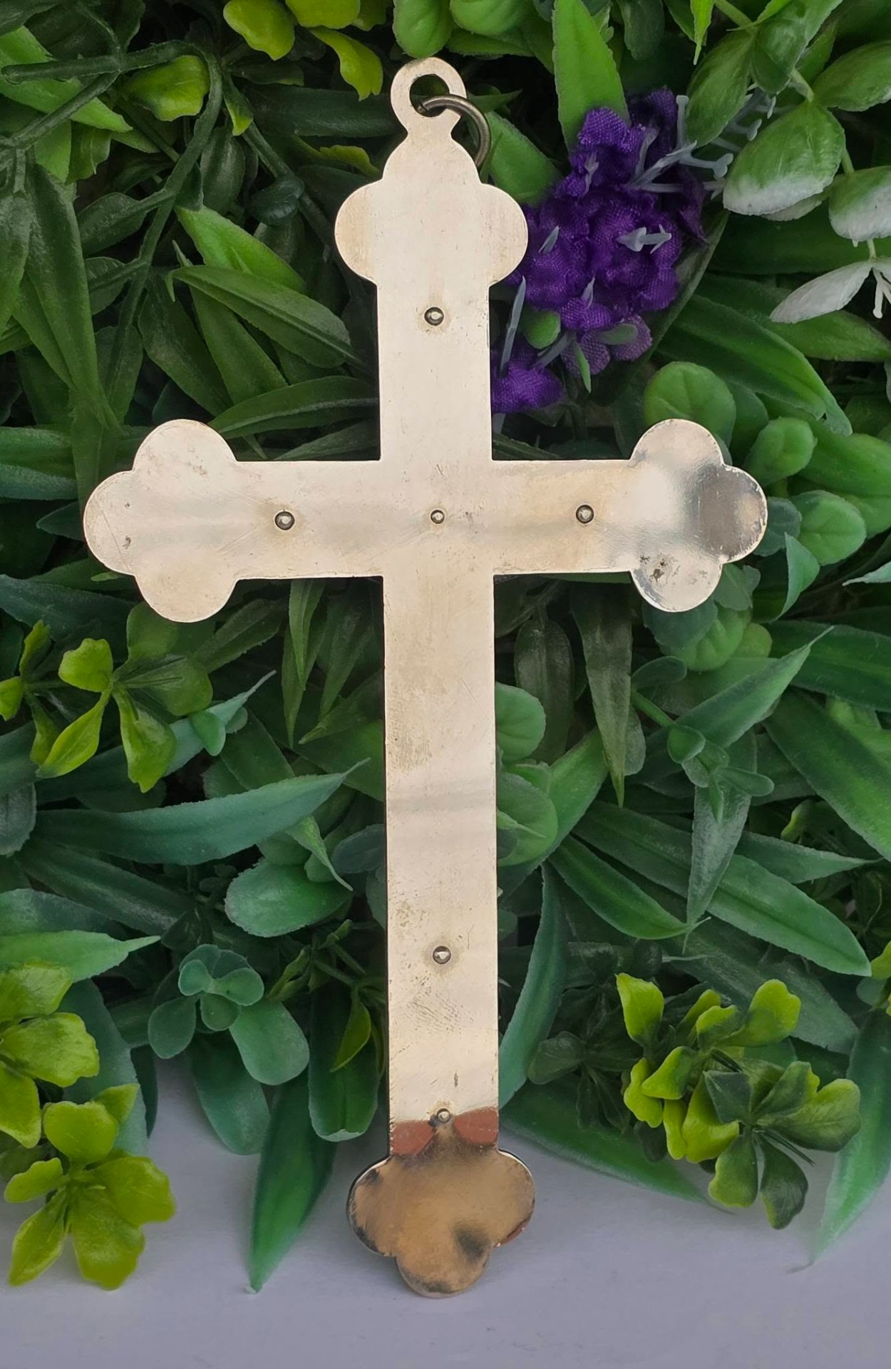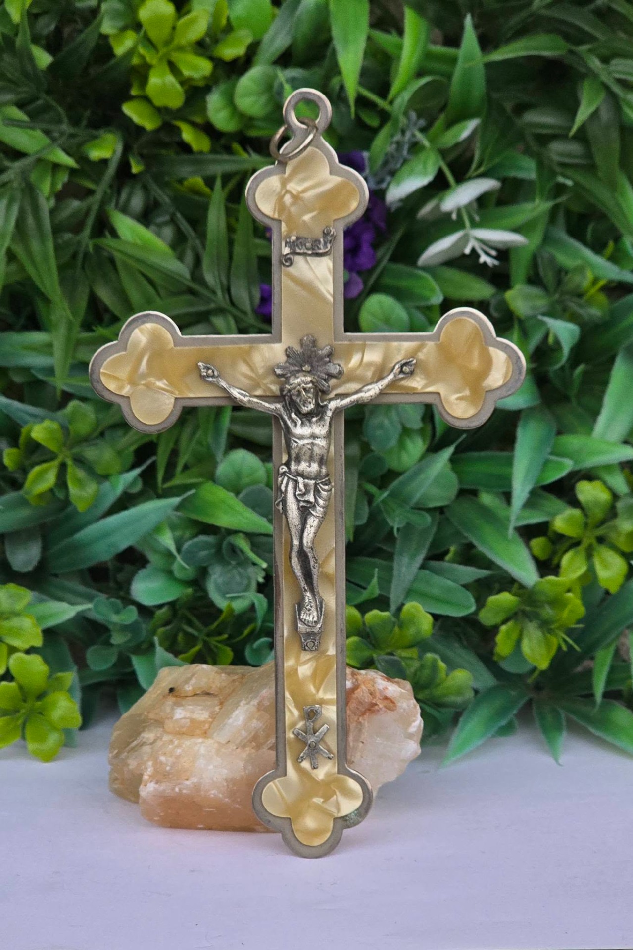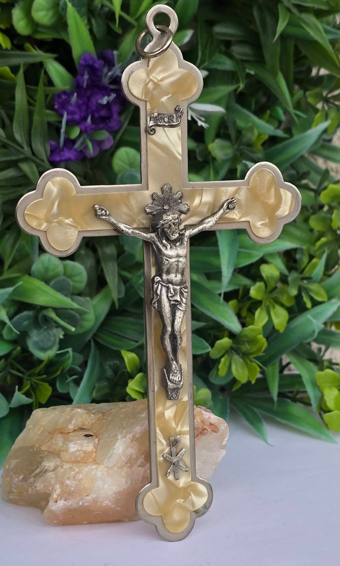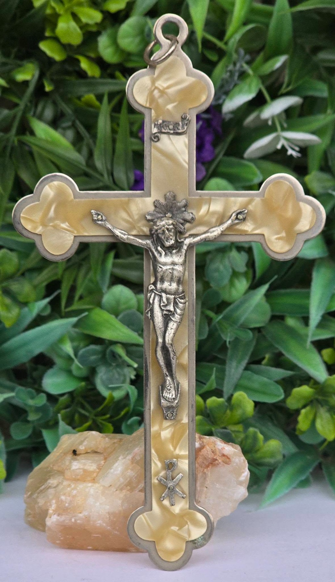 Crucifix vechi din metal argintat și sidef "faux" (celuloid "French Ivory"), cu detalii frumos lucrate manual (anii 1950-1960, Franța).