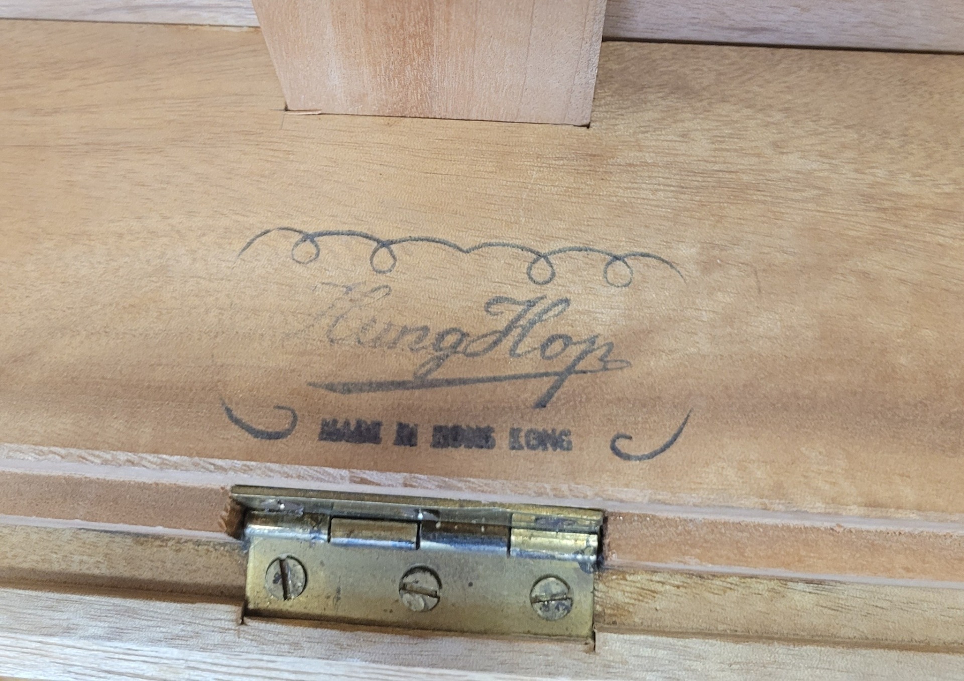 Acest cufăr a fost fabricat de renumitul atelier Hung Hop din Hong Kong, cel mai probabil în perioada de vârf a exporturilor asiatice (anii '50-'70), fiind sculptat tridimensional în relief înalt, întreaga suprafață fiind acoperită cu sculpturi manuale complexe, prezentând scene narative tradiționale, peisaje și motive florale proeminente.