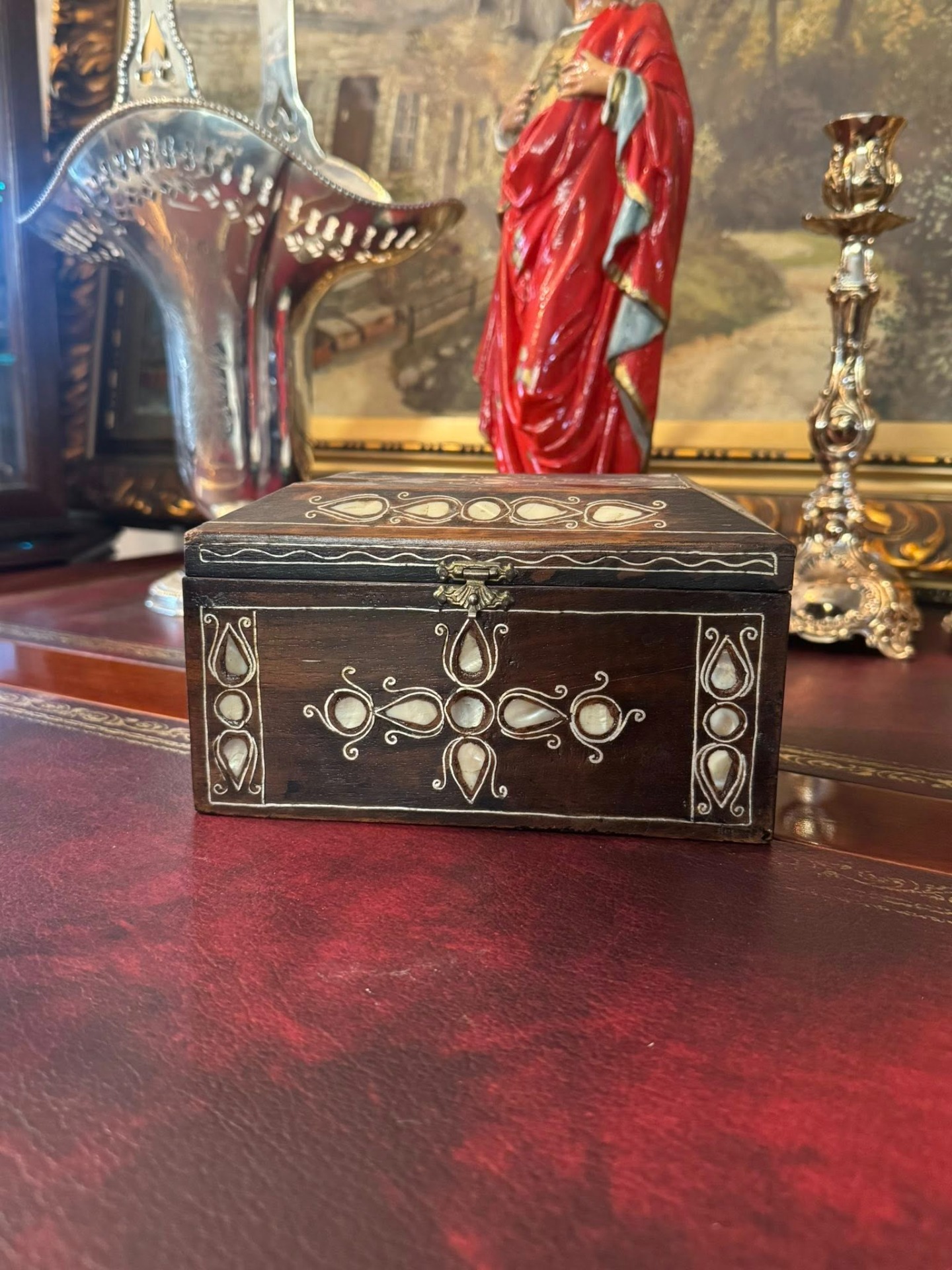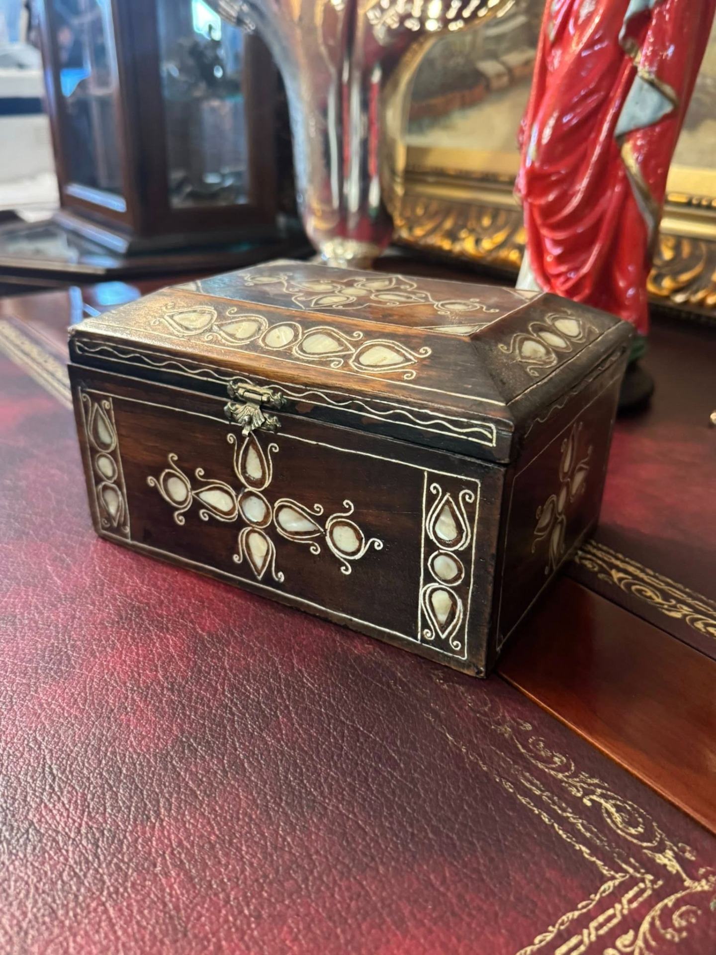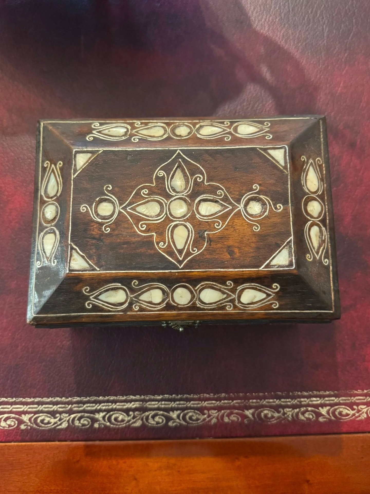 Cutie de bijuterii sau de valori, realizată din lemn de esență tare și intarsie cu sidef. Stilul decorativ sugerează o origine din zona Orientului Apropiat sau a Africii de Nord (cca 1950).