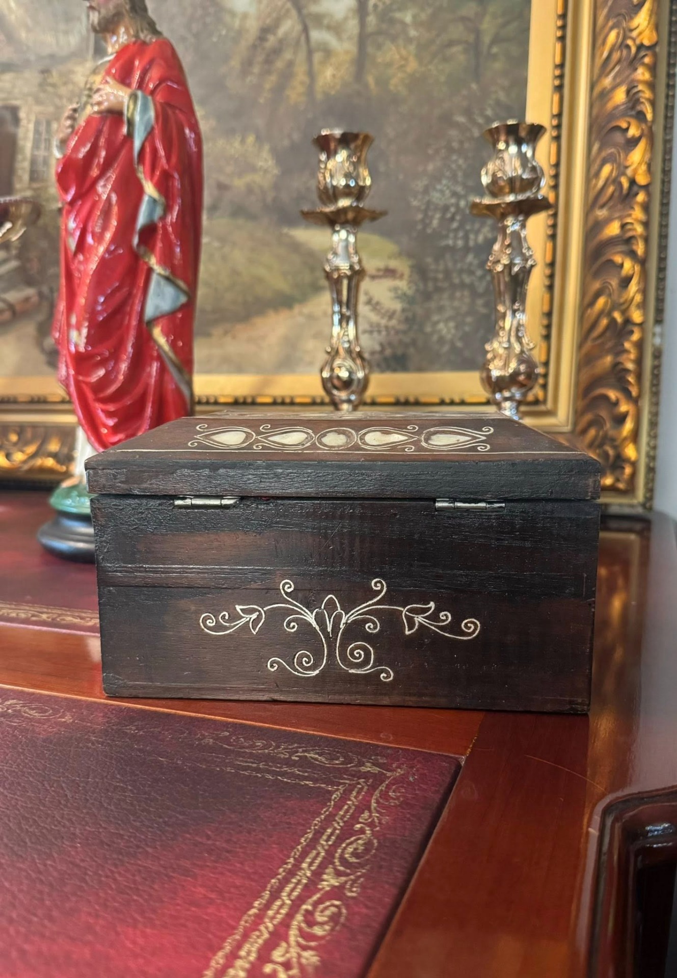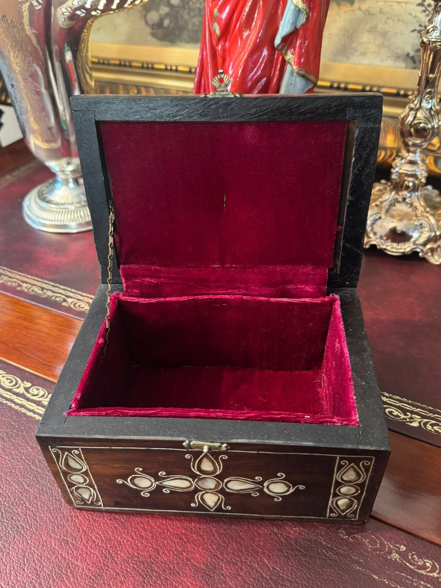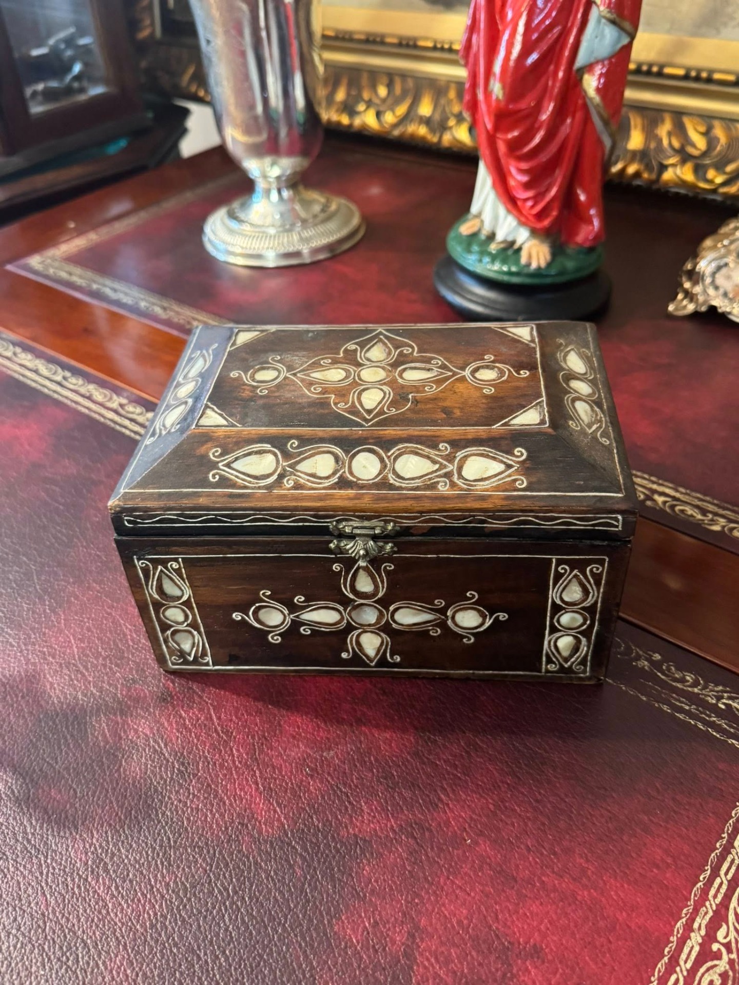 Cutie de bijuterii sau de valori, realizată din lemn de esență tare și intarsie cu sidef. Stilul decorativ sugerează o origine din zona Orientului Apropiat sau a Africii de Nord (cca 1950).