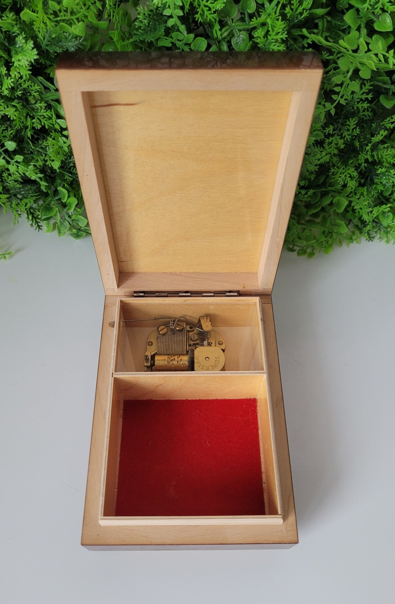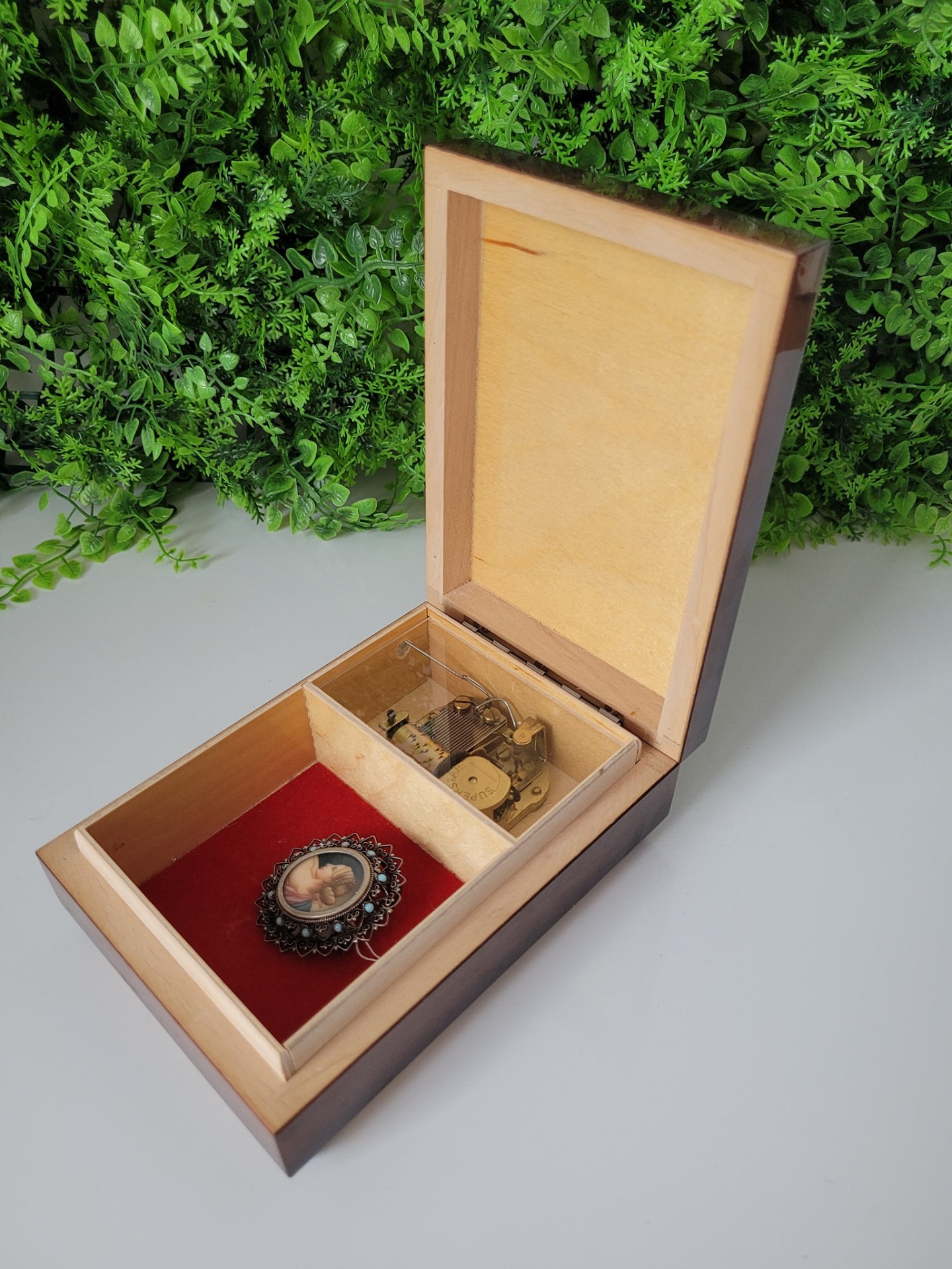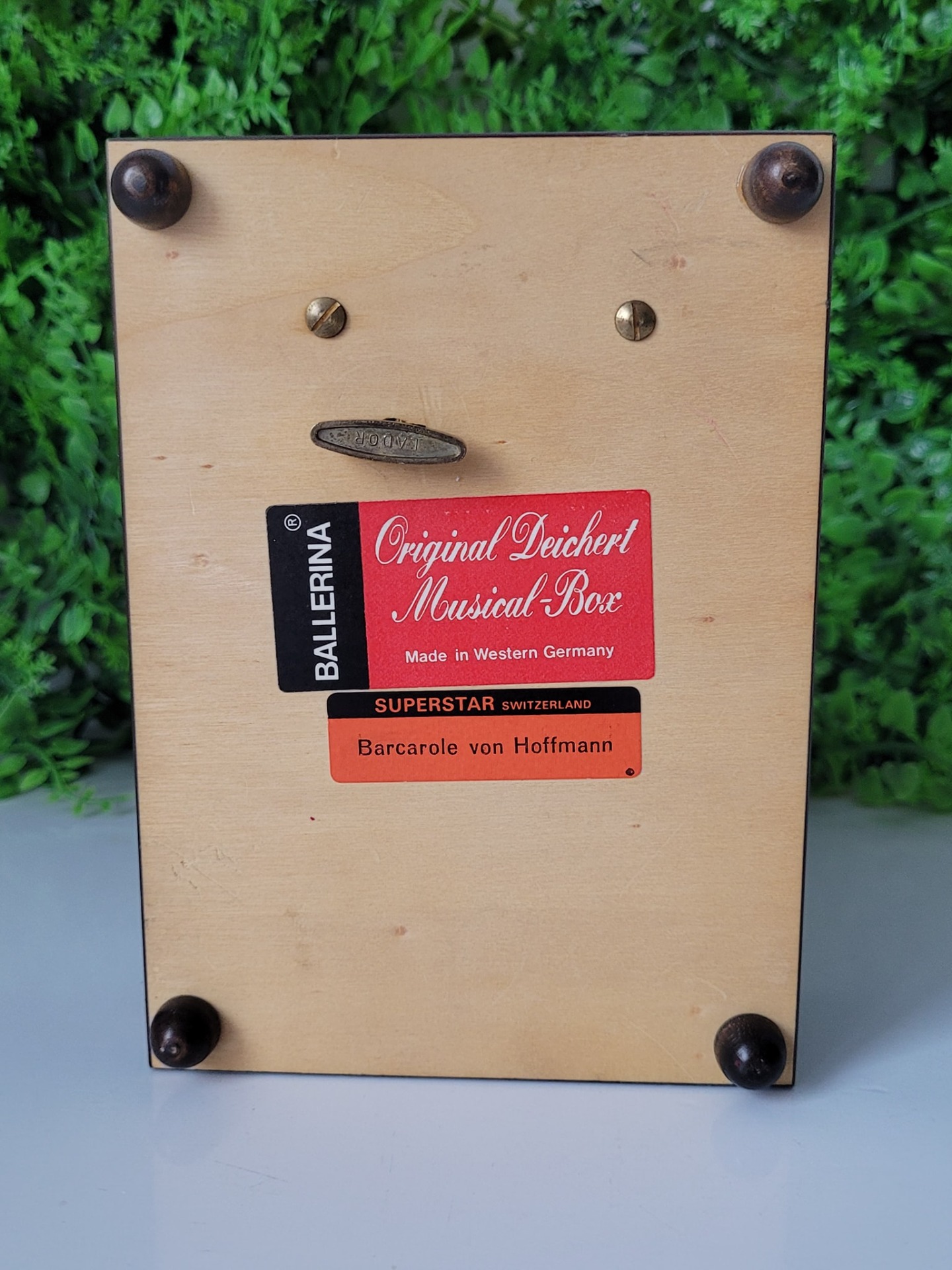 ,,Barcarole von Hoffmann", din lemn, cu interior căptușit cu catifea roșie, fabricată în Germania de Vest (Western Germany), un obiect decorativ elegant, cu un design nostalgic aflat într-o stare estetică și funcțională foarte bună, cu mecanism muzical elvețian Superstar Switzerland, recunoscut pentru precizia și claritatea sunetului, care la deschiderea cutiei redă melodia ,,Barcarole" din opera