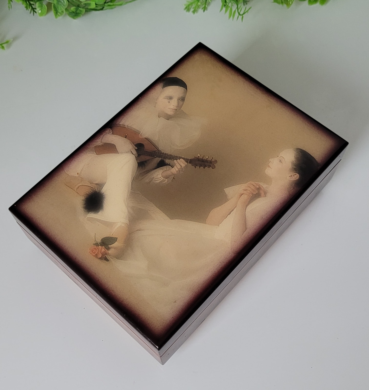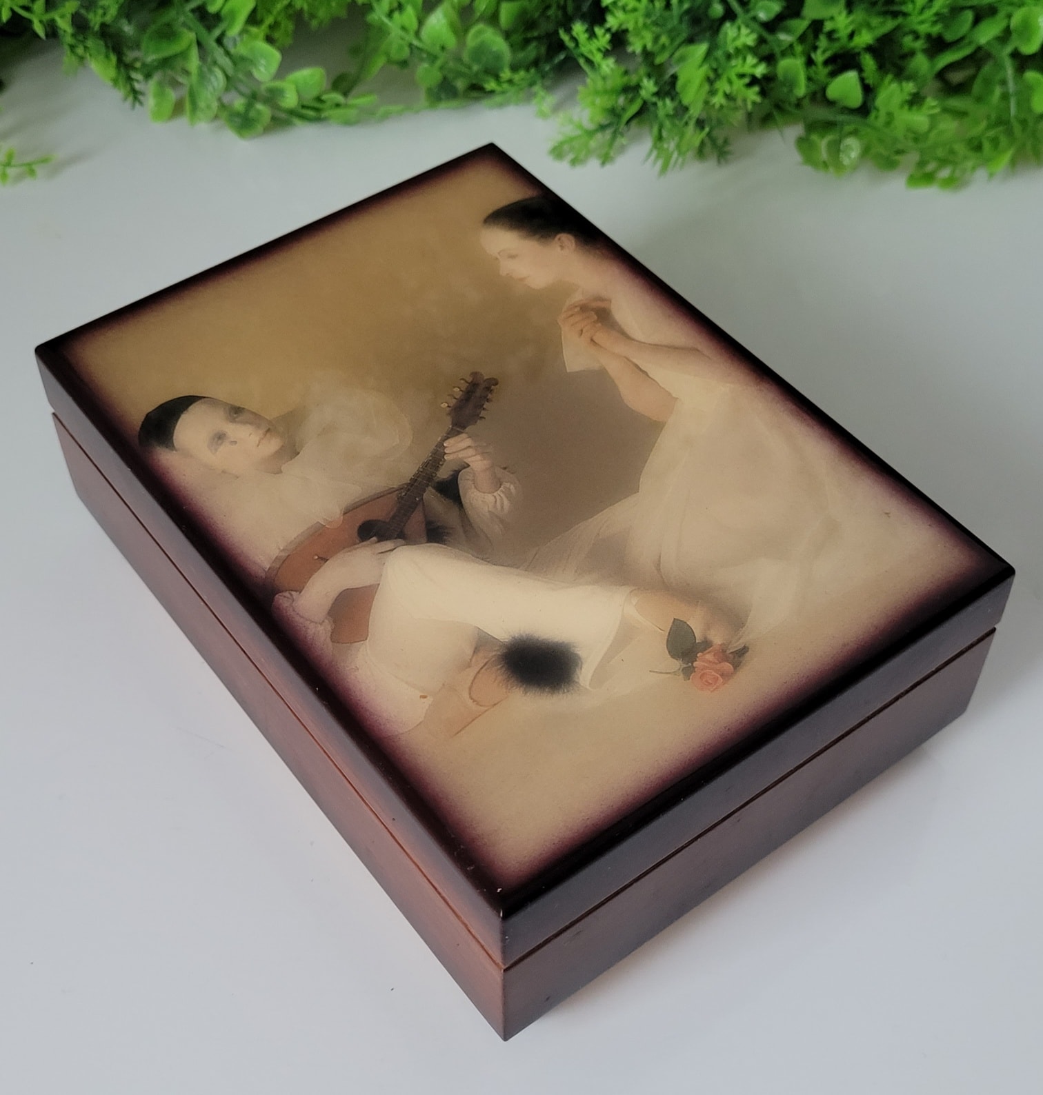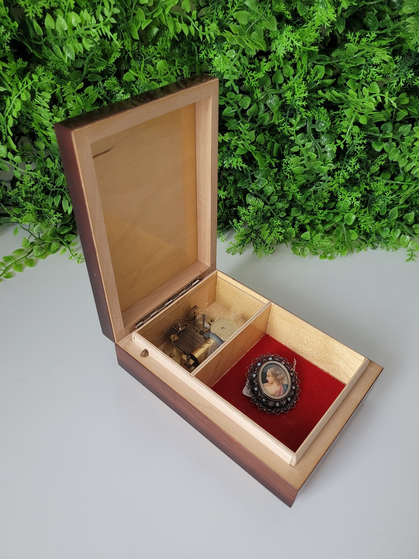 ,,Barcarole von Hoffmann", din lemn, cu interior căptușit cu catifea roșie, fabricată în Germania de Vest (Western Germany), un obiect decorativ elegant, cu un design nostalgic aflat într-o stare estetică și funcțională foarte bună, cu mecanism muzical elvețian Superstar Switzerland, recunoscut pentru precizia și claritatea sunetului, care la deschiderea cutiei redă melodia ,,Barcarole" din opera