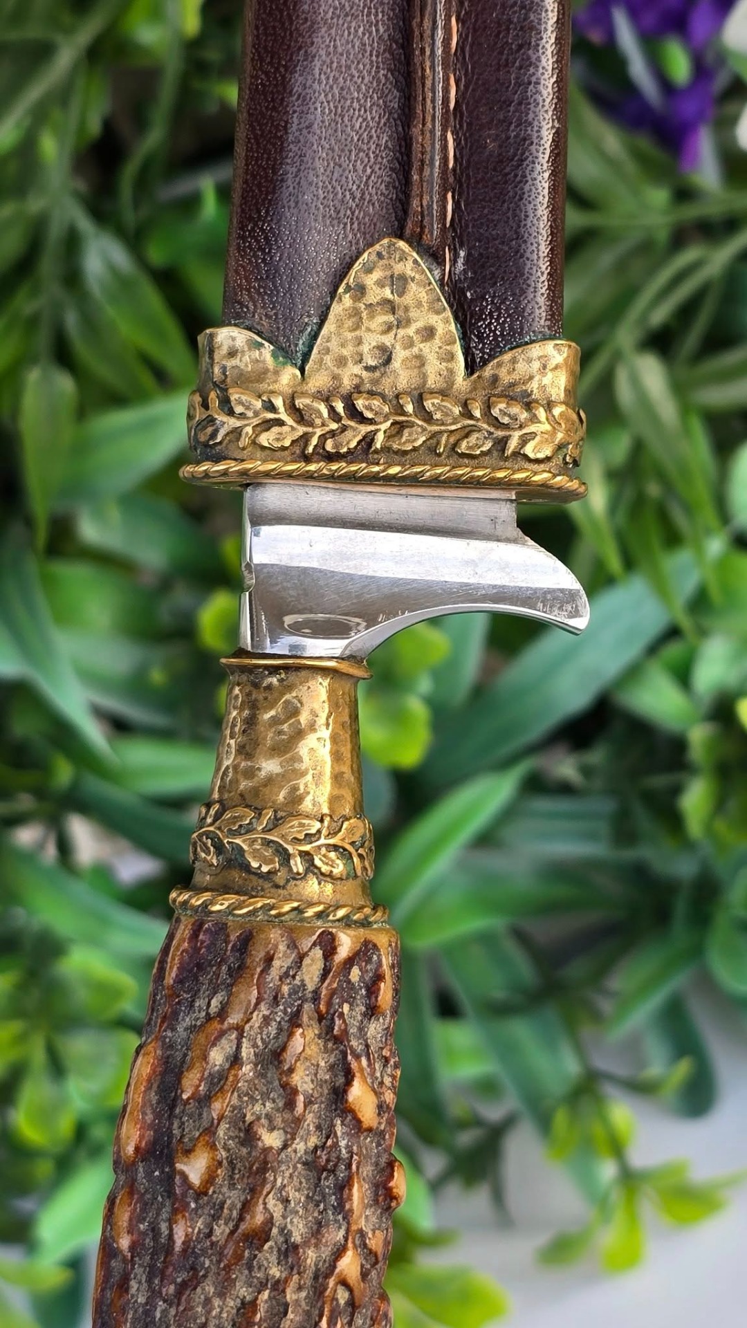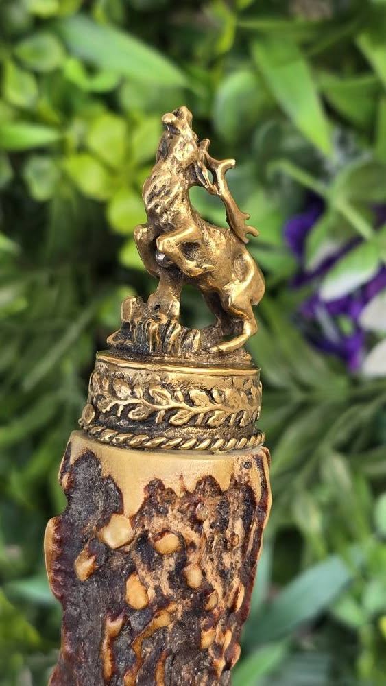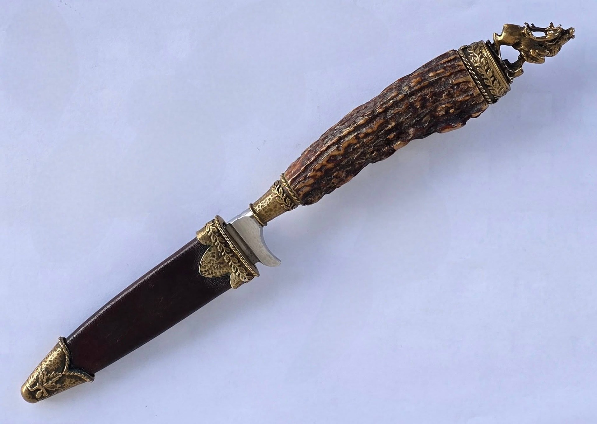 Cuțit vintage tradițional bavarez Trachtenmesser, de colecție, cu mâner din corn de cerb decorat la capăt cu un cerb sculptat din bronz, lamă din oțel
