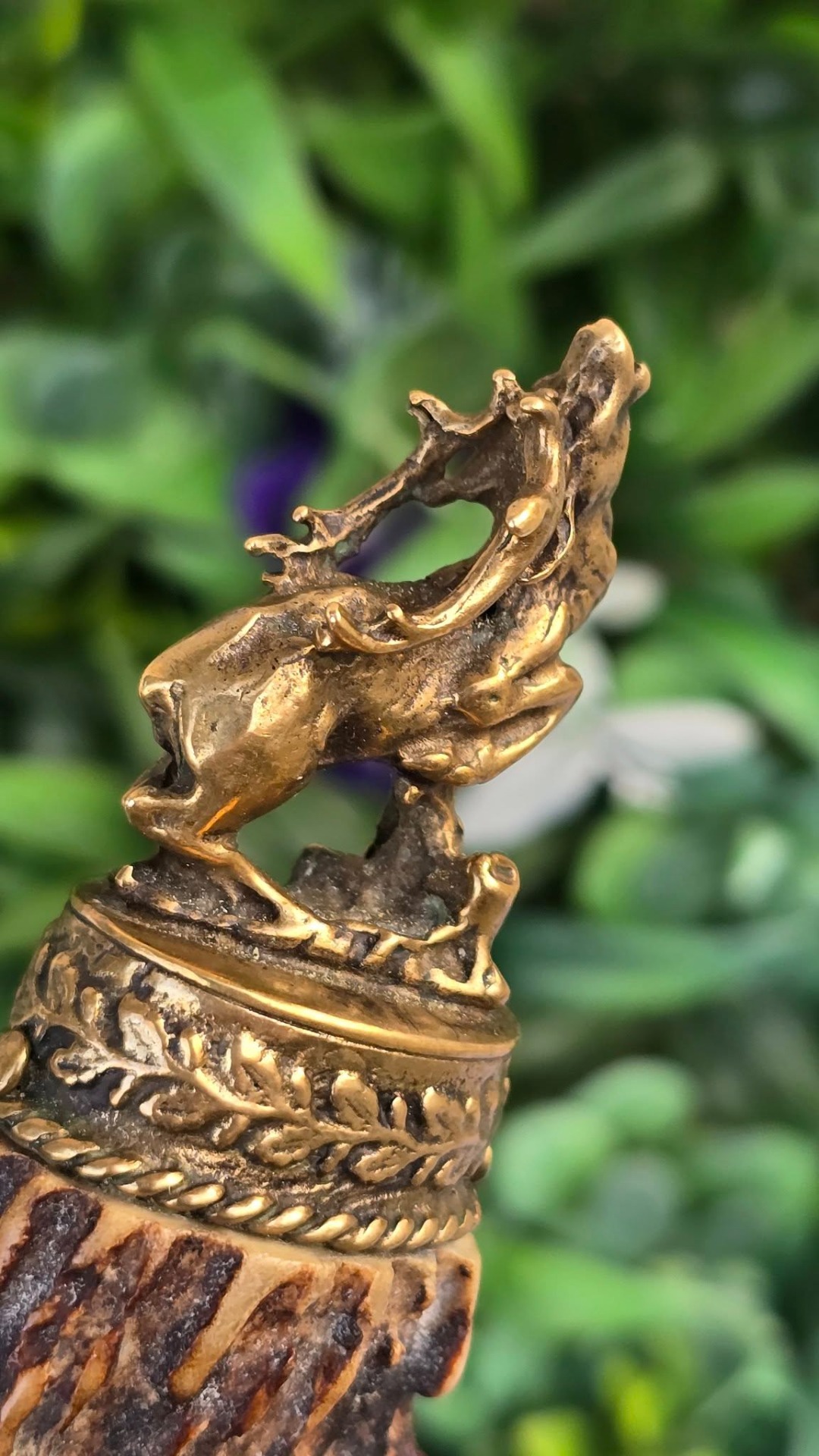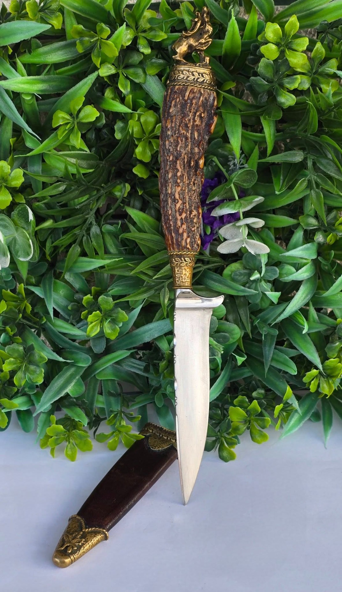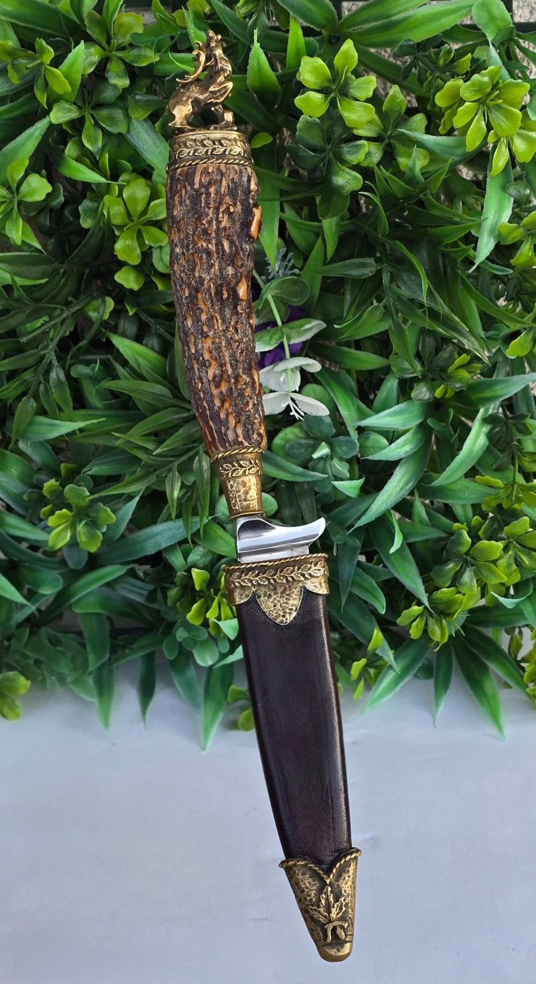 Cuțit vintage tradițional bavarez Trachtenmesser, de colecție, cu mâner din corn de cerb decorat la capăt cu un cerb sculptat din bronz, lamă din oțel