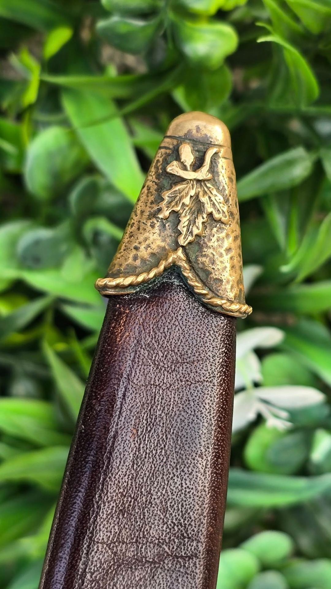inoxidabil și teacă din piele și bronz decorată cu frunze de stejar (anii 1970-1980, Germania).