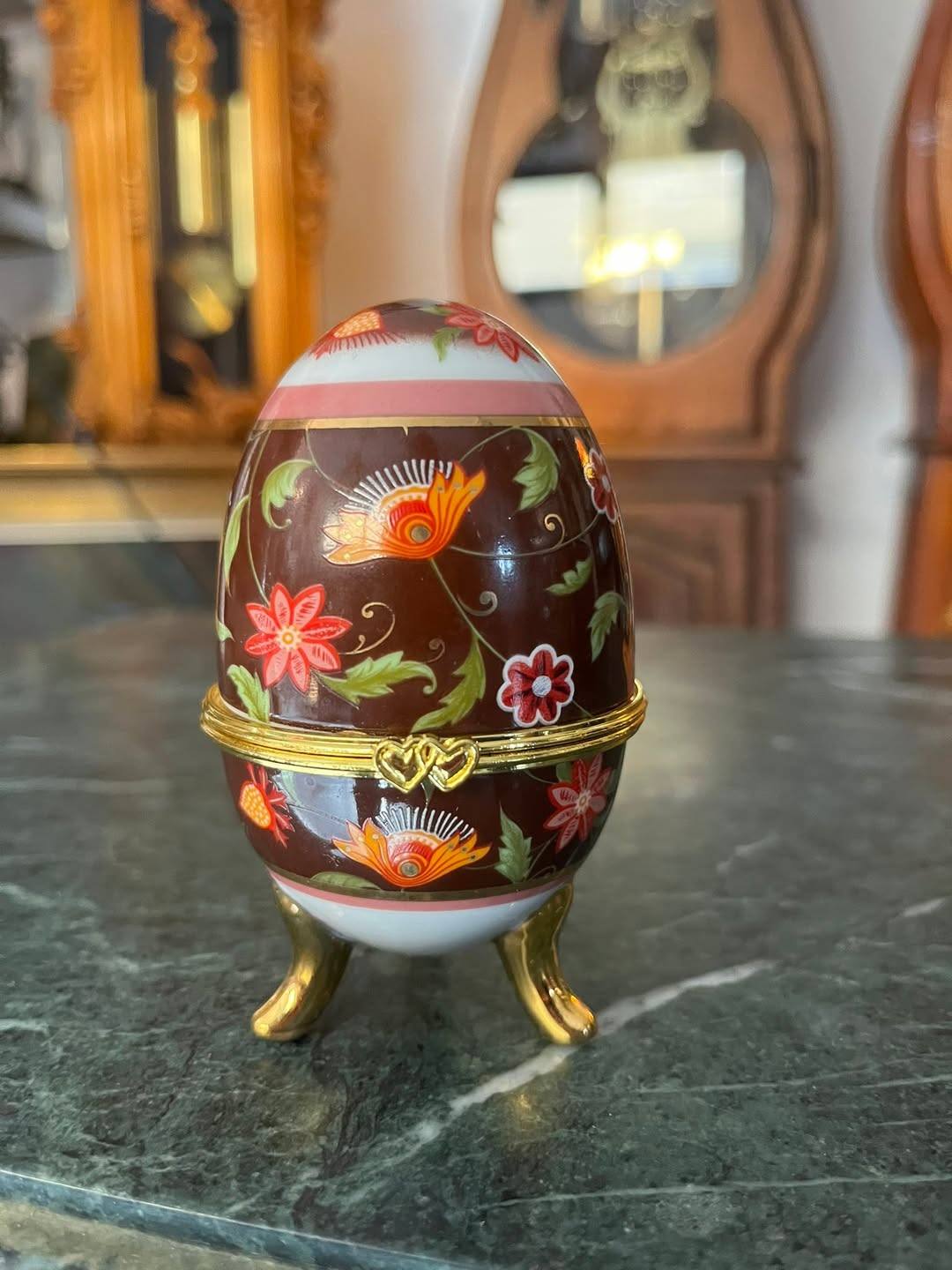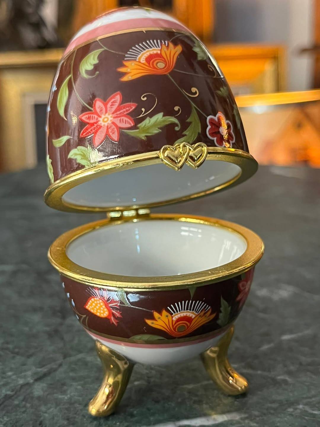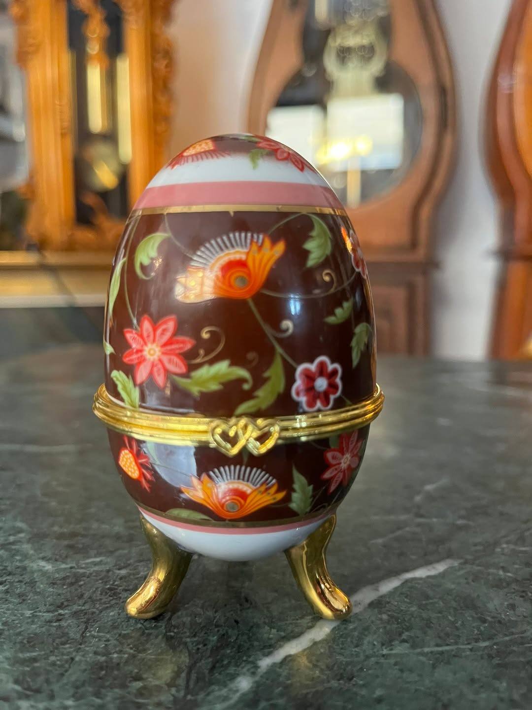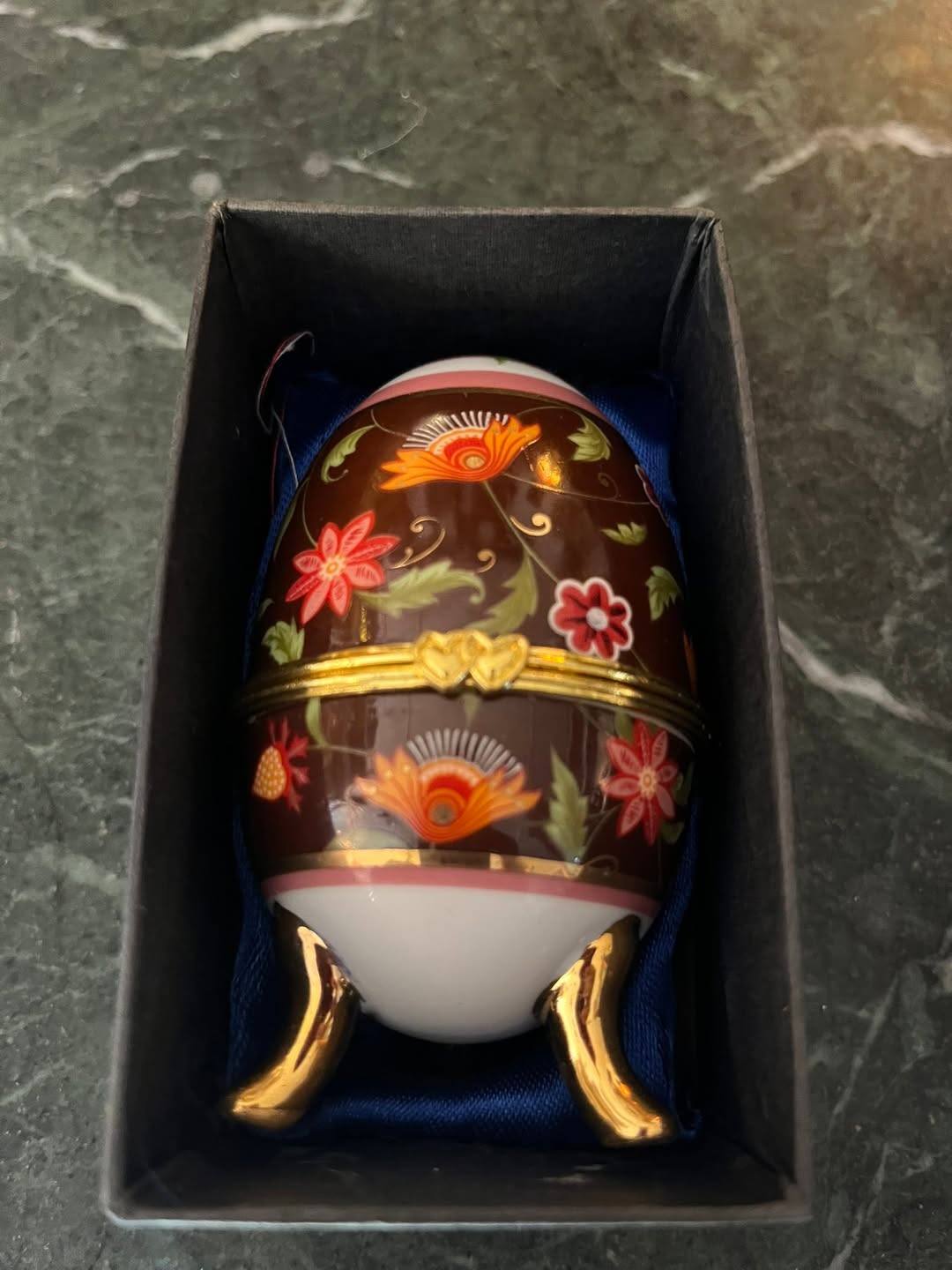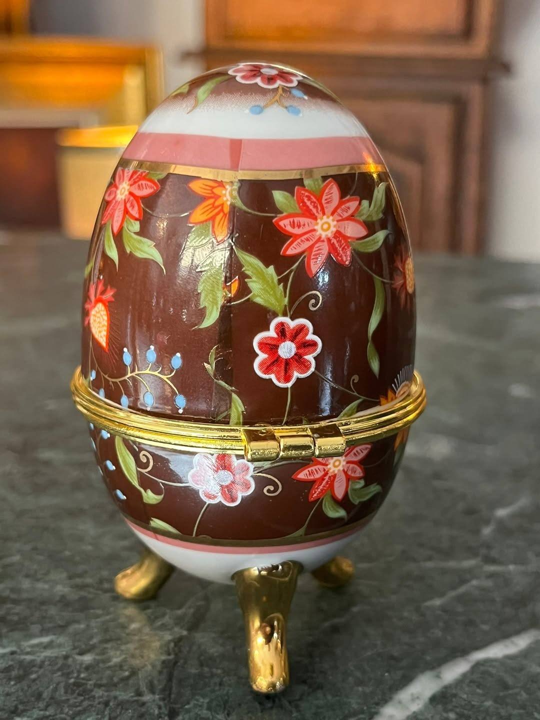 Elegant ou decorativ tip Fabergé, realizat din porțelan fin, decorat cu motive florale colorate pe fundal maro lucios, cu accente aurii rafinate. Piesa se deschide și poate fi folosită ca cutie pentru bijuterii sau obiecte mici, fiind așezată pe trei piciorușe aurite, în stil clasic.