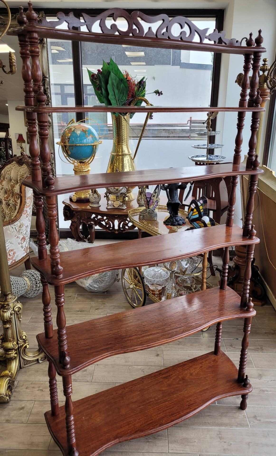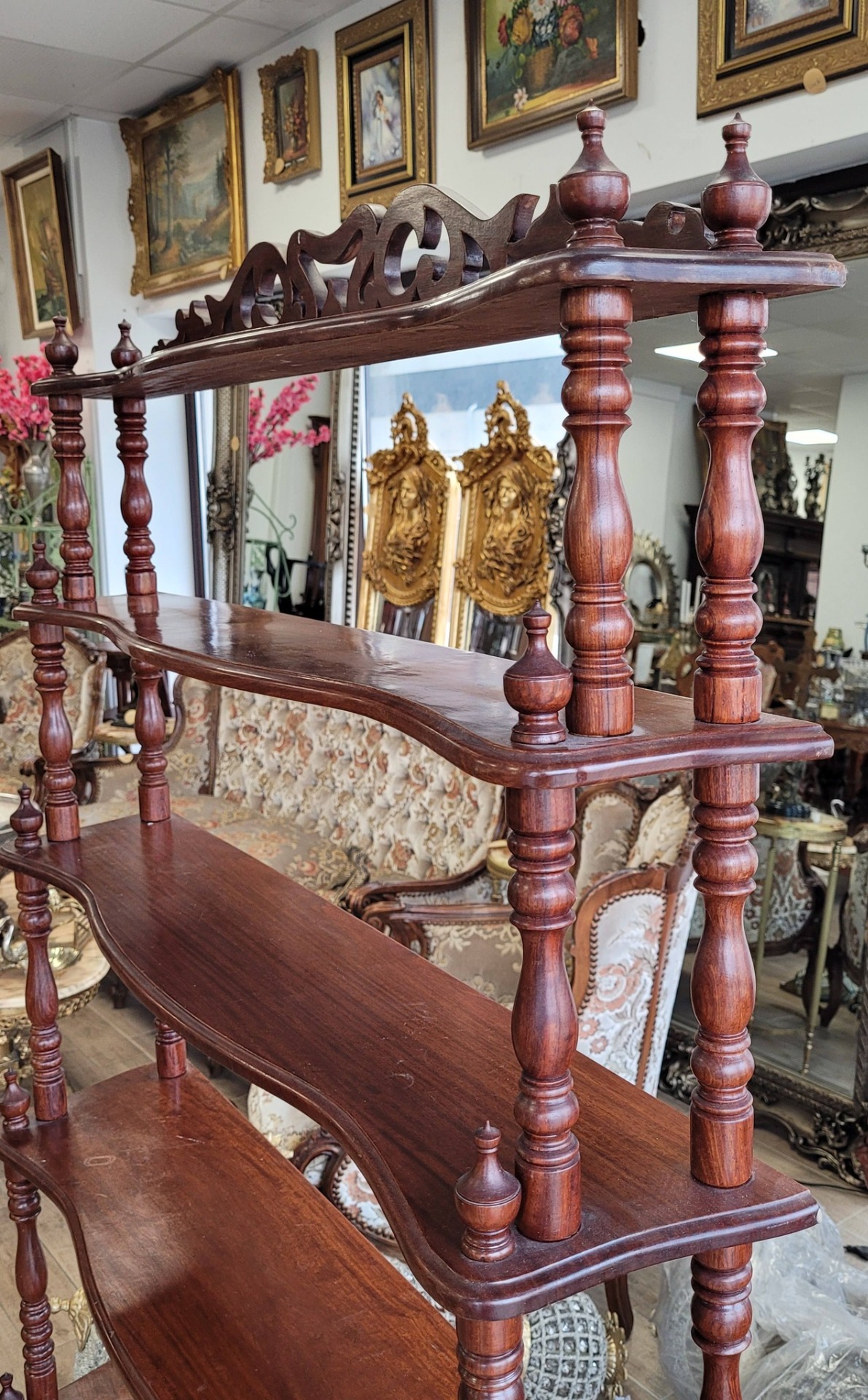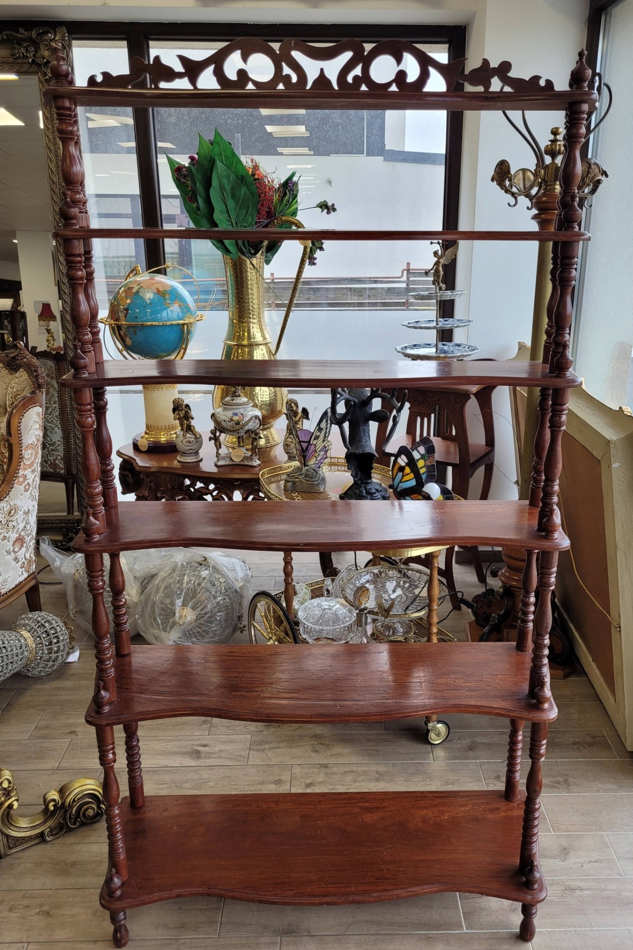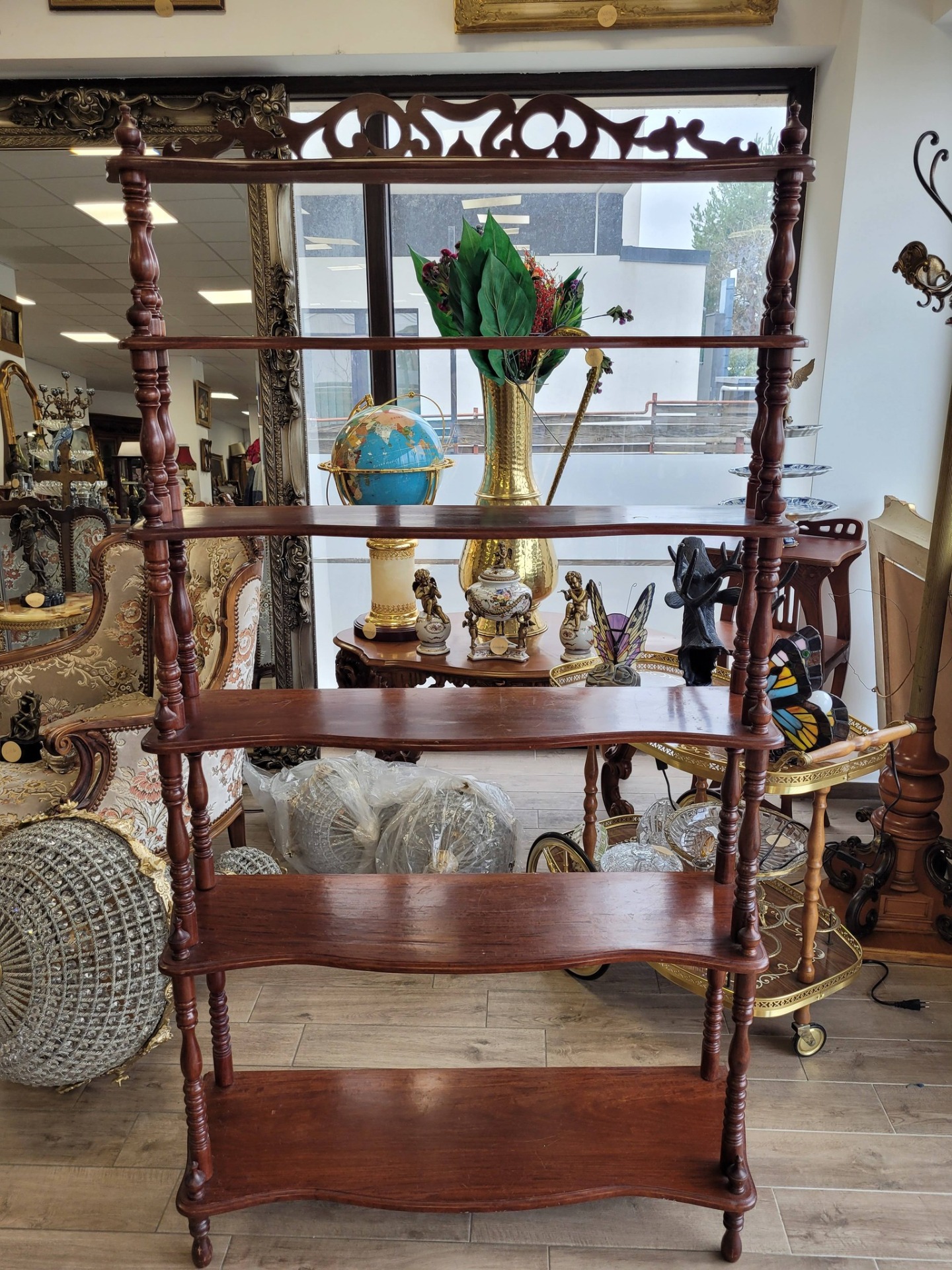 Etajeră vintage din lemn, clasică și elegantă, realizată în stil victorian, care oferă un spaţiu generos de expunere pentru cărți, obiecte de colecție sau