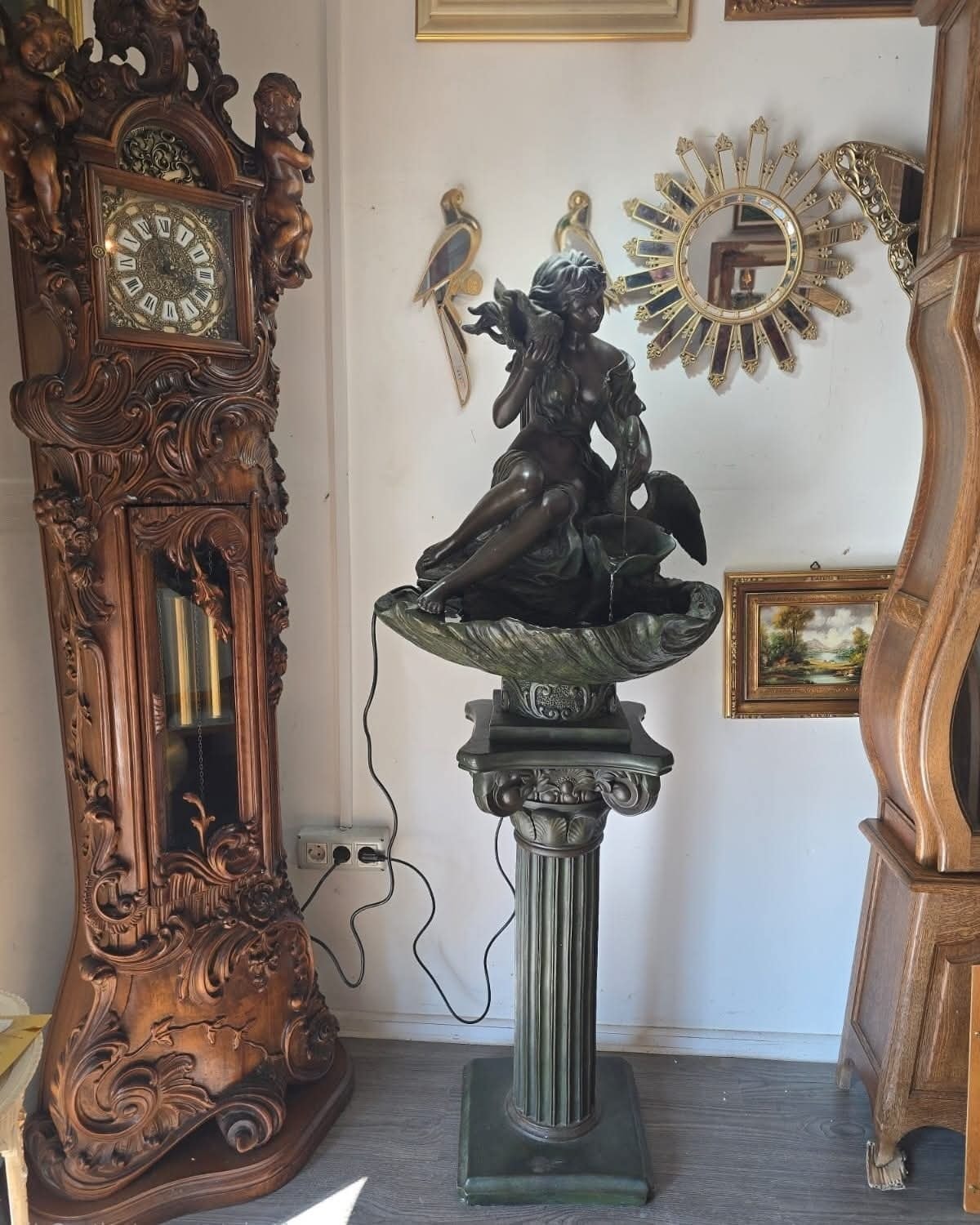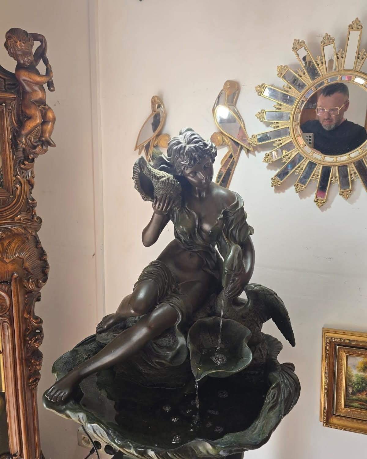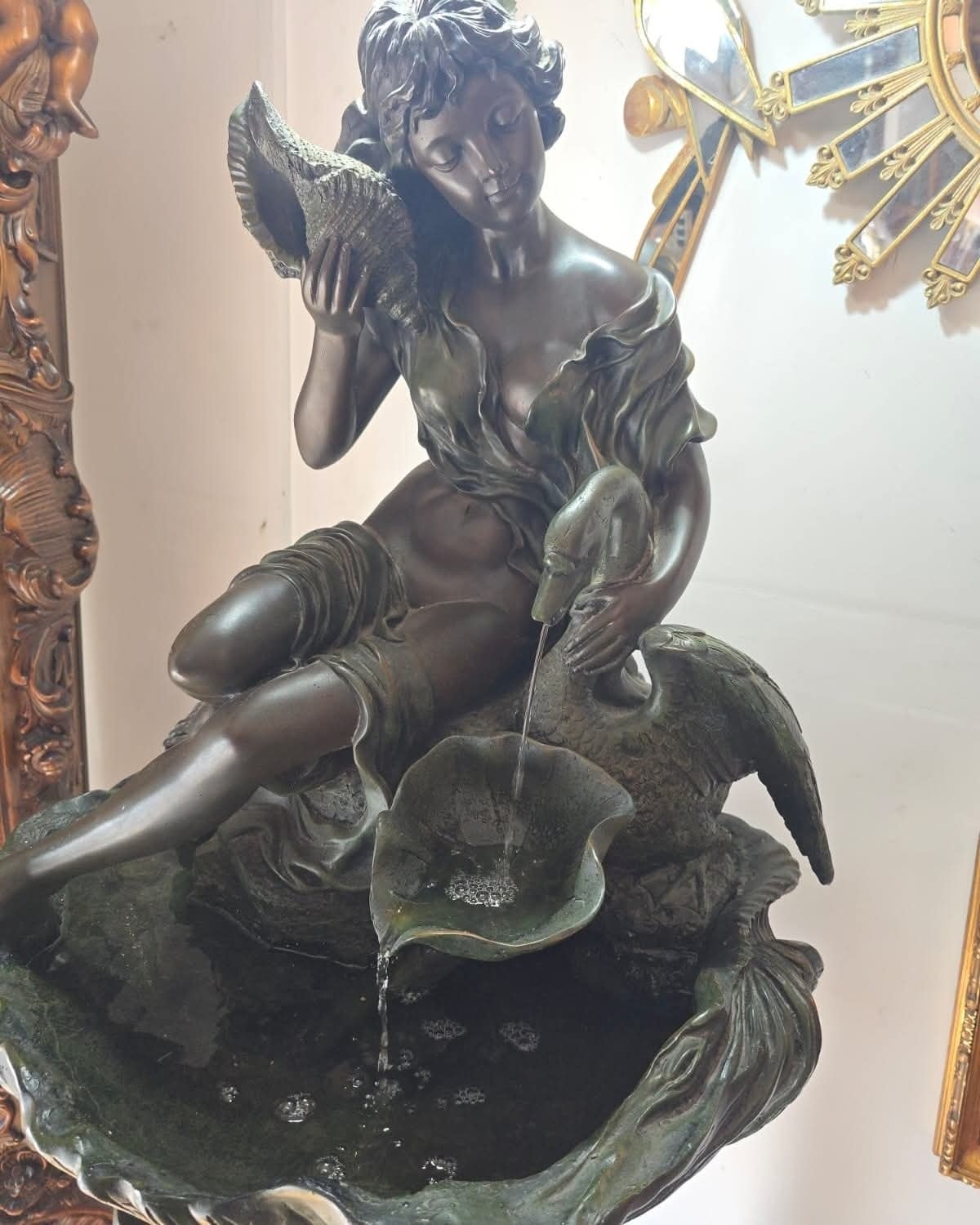 fântână arteziană decorativă de interior, cu statuetă feminină, realizată în stil Art Nouveau. Piesa este confecționată din rășină cu finisaj bronz patinat, având detalii sculpturale elegante.