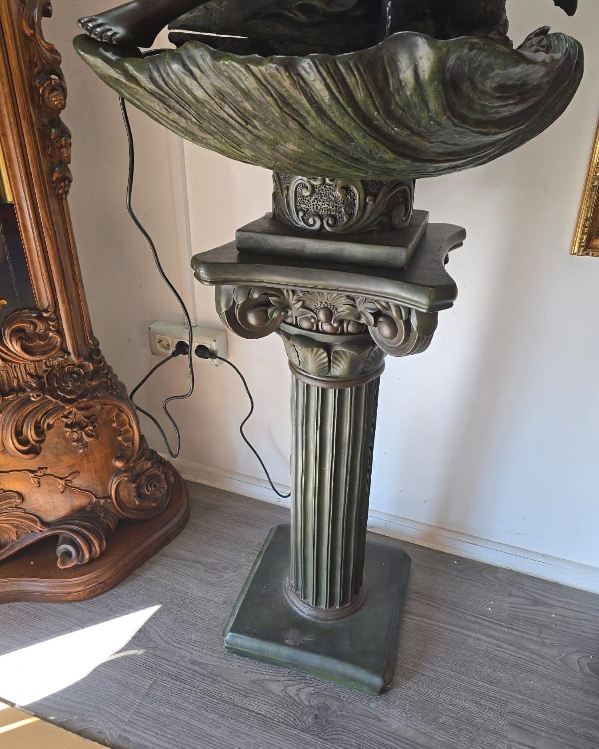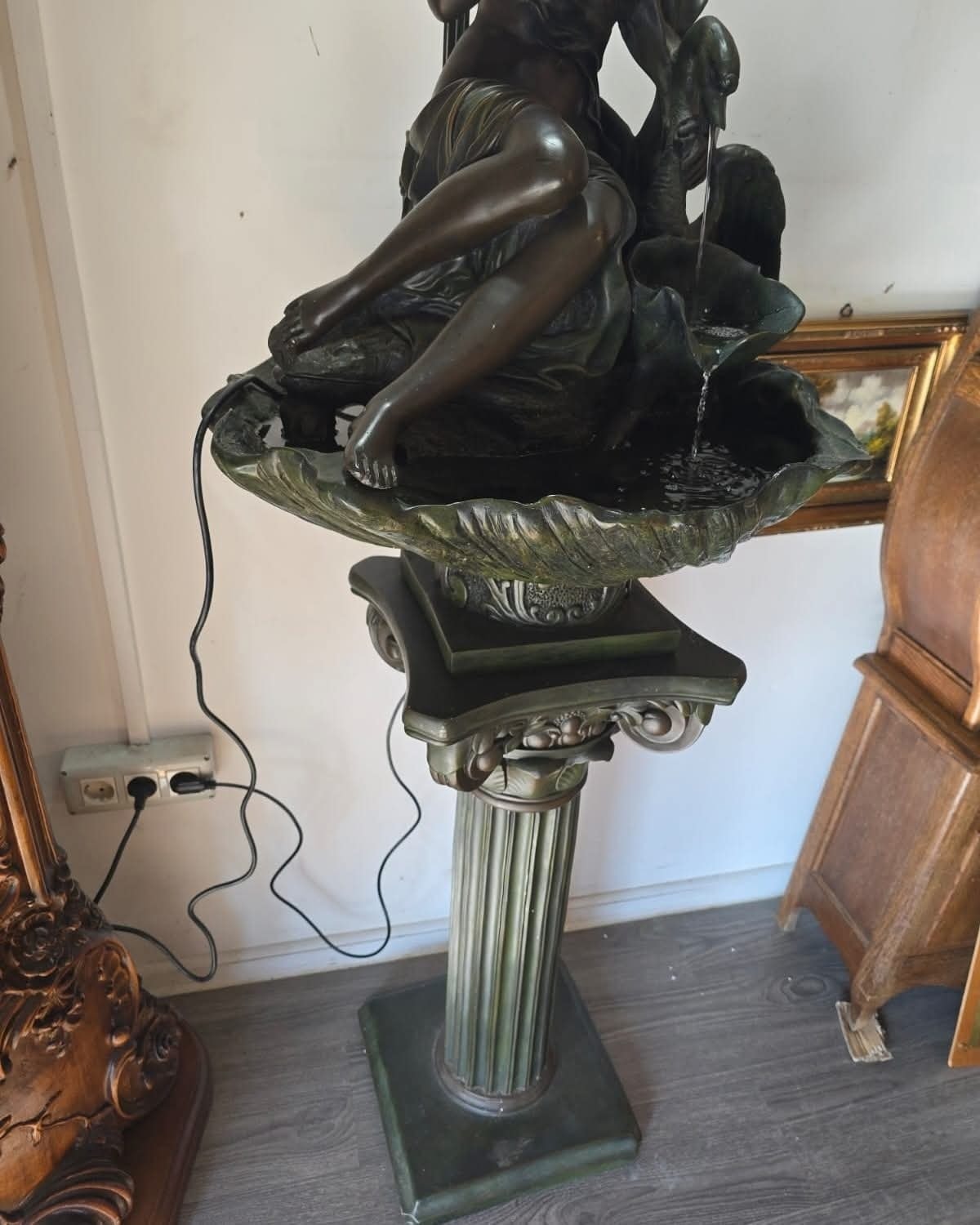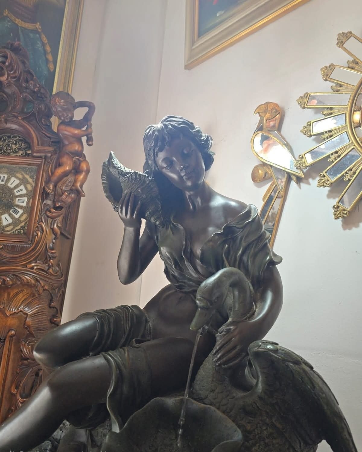 fântână arteziană decorativă de interior, cu statuetă feminină, realizată în stil Art Nouveau. Piesa este confecționată din rășină cu finisaj bronz patinat, având detalii sculpturale elegante.