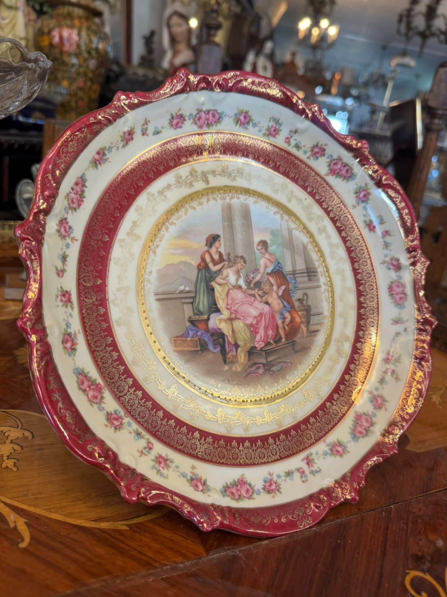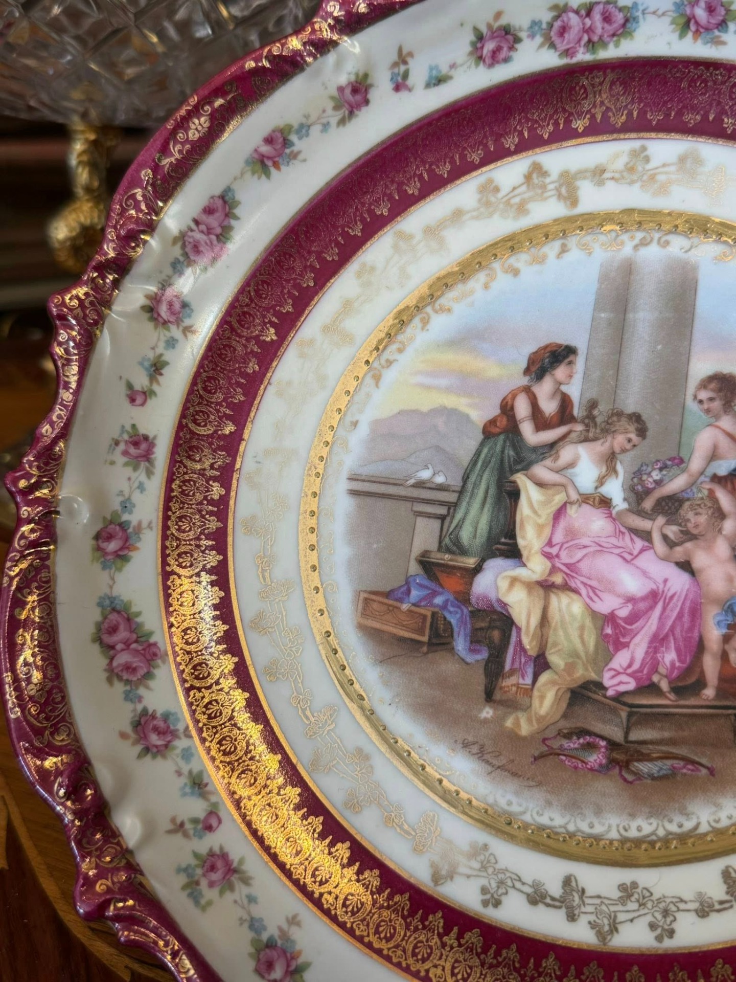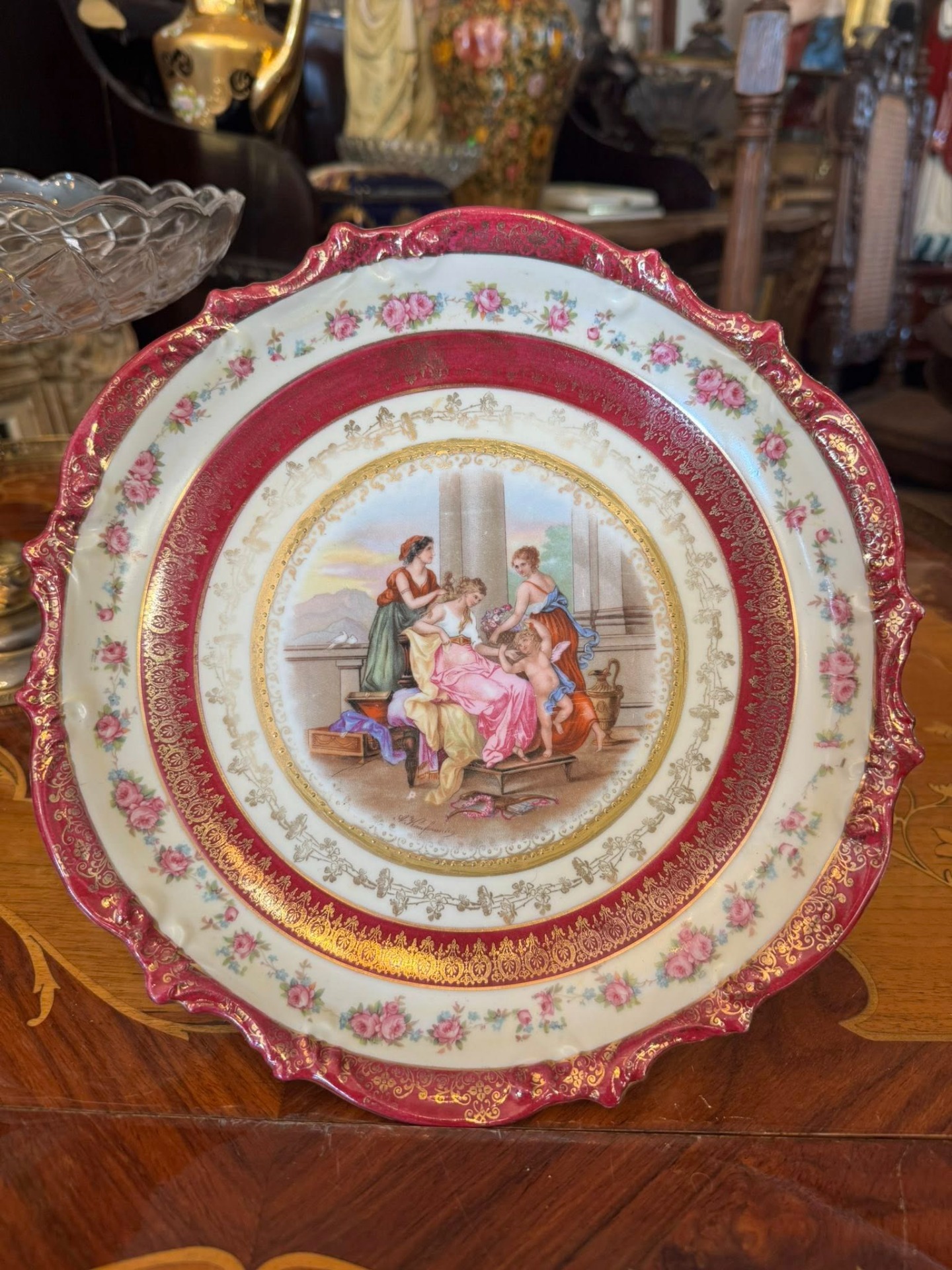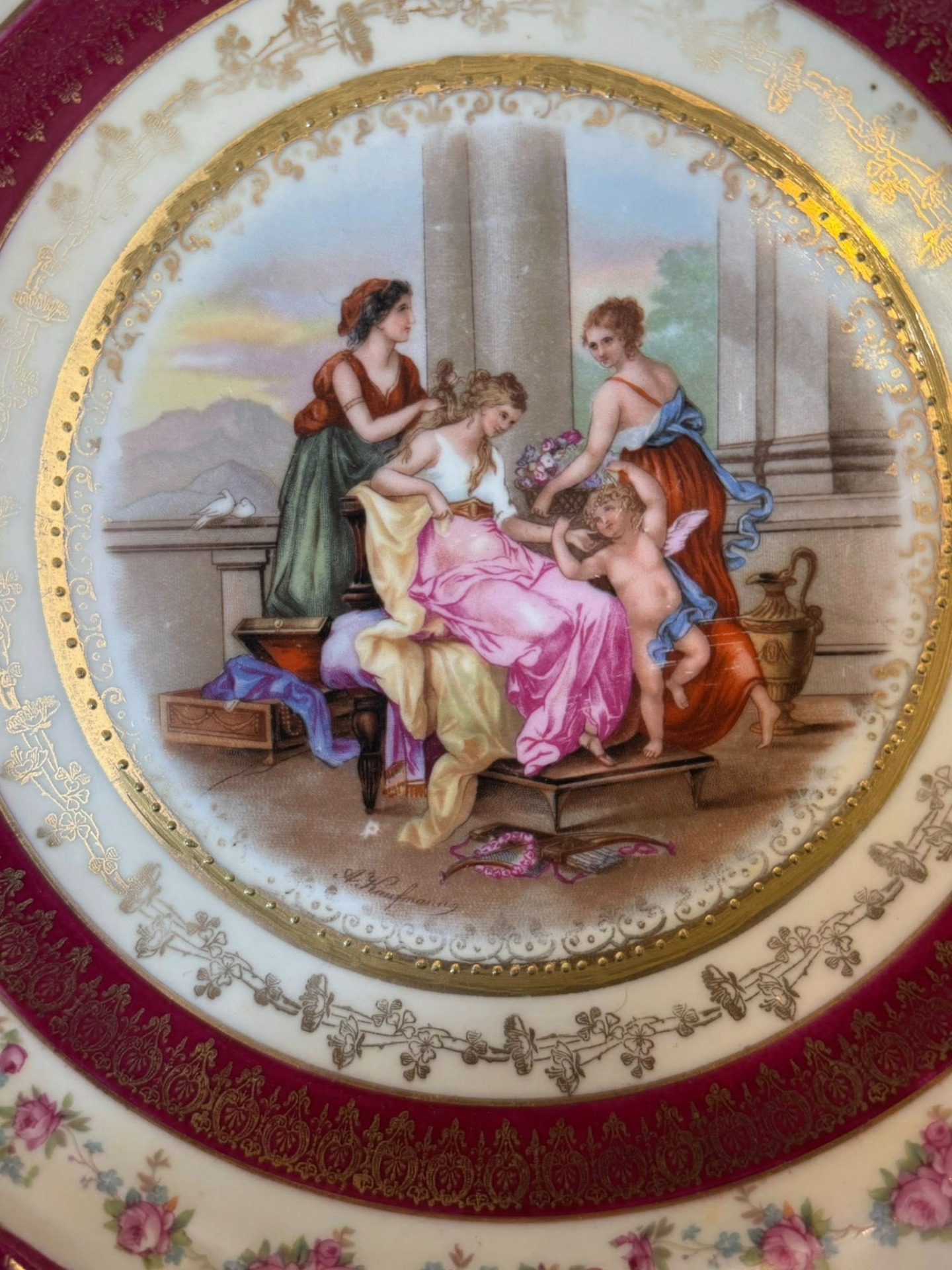 Farfurie decorativă din porțelan ce ilustrează o scenă mitologică sau neoclasică de tip "curte de onoare", înfățișând trei femei în veșminte clasice și un Cupidon (sau putto) cu aripi.