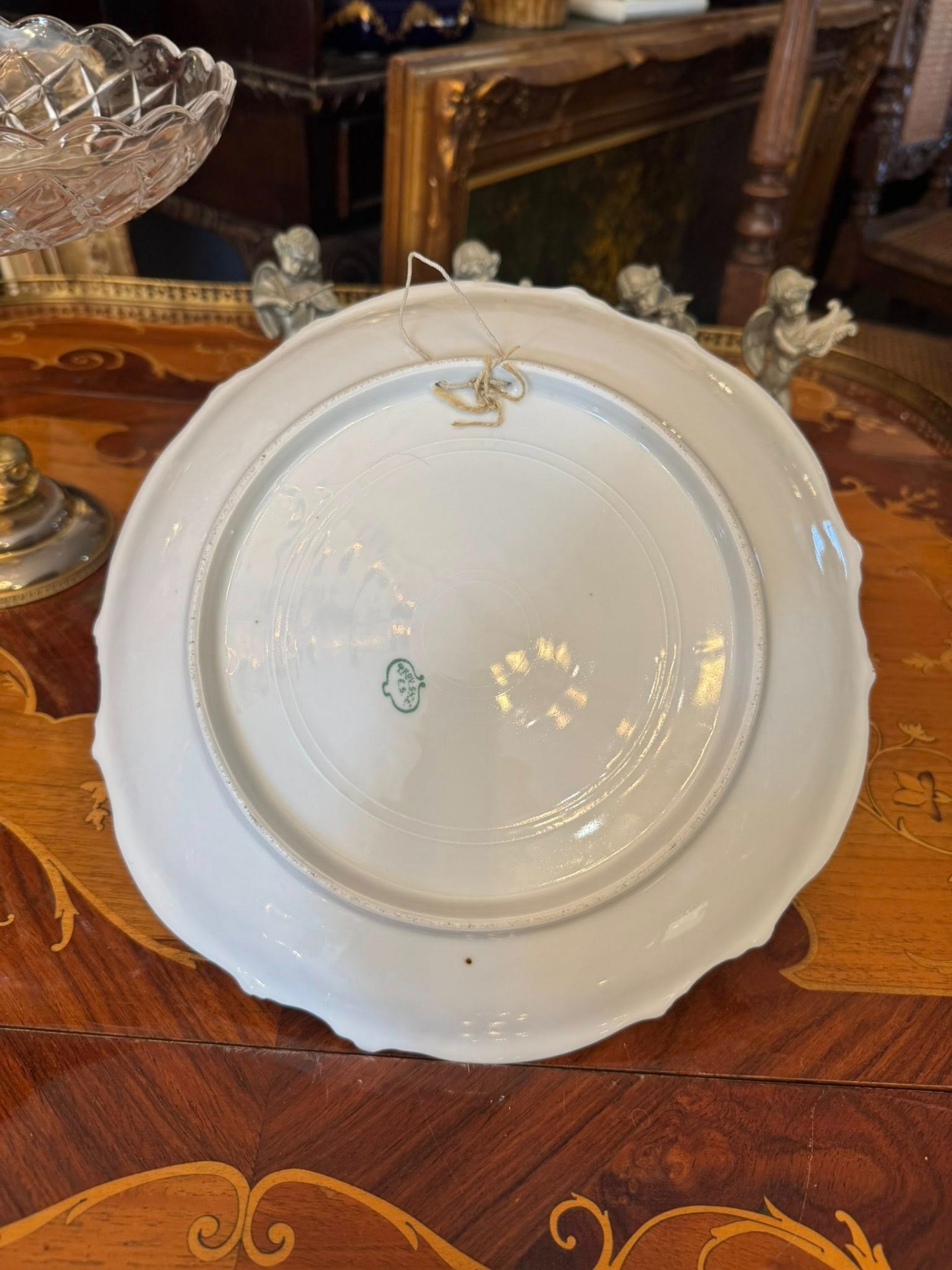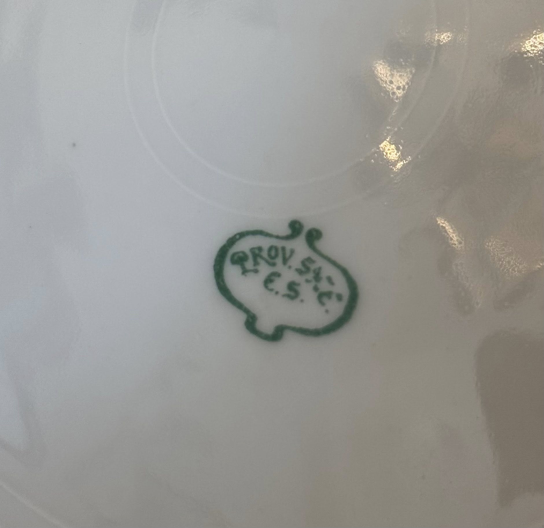 Marcajul verde cu inițialele E.S. aparține fabricii de porțelan Erdmann Schlegelmilch. Origine: Suhl, Prusia (astăzi în Germania). Textul „Prov. Sax.” (Provincia Saxonia) este tipic pentru acest producător. (cca 1900)