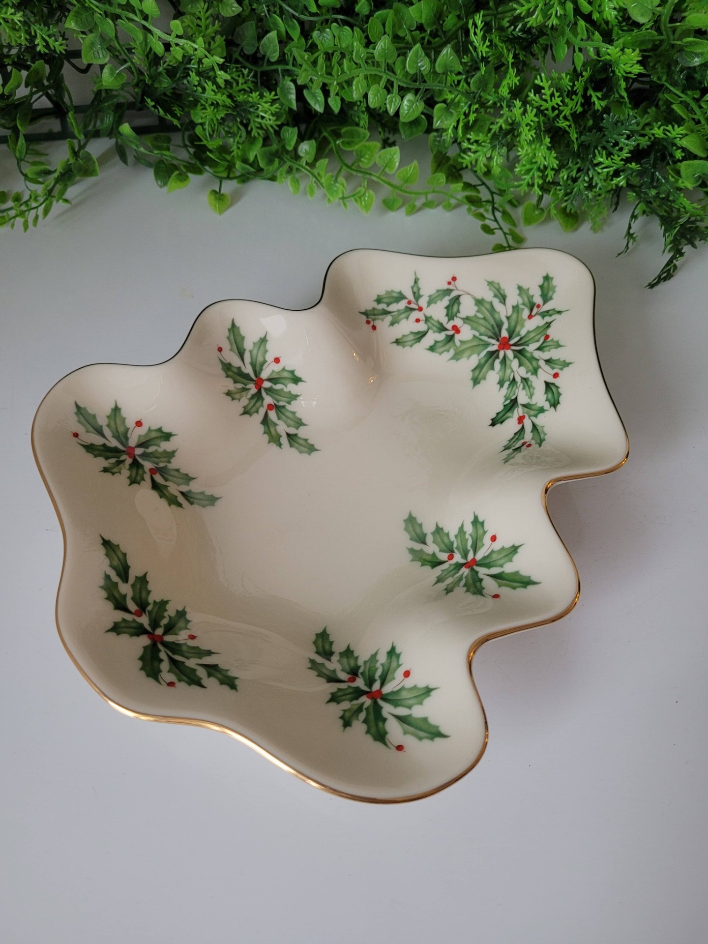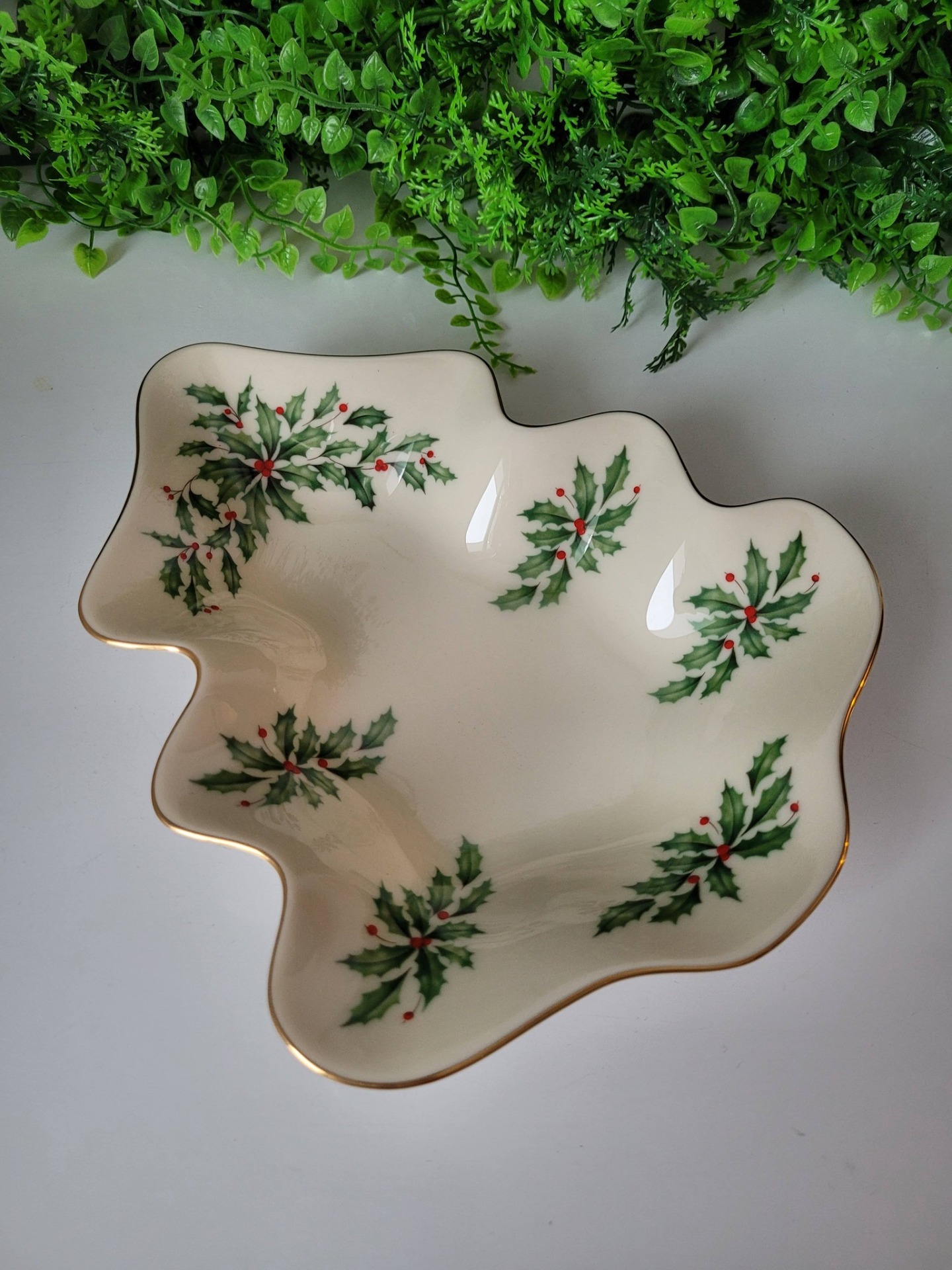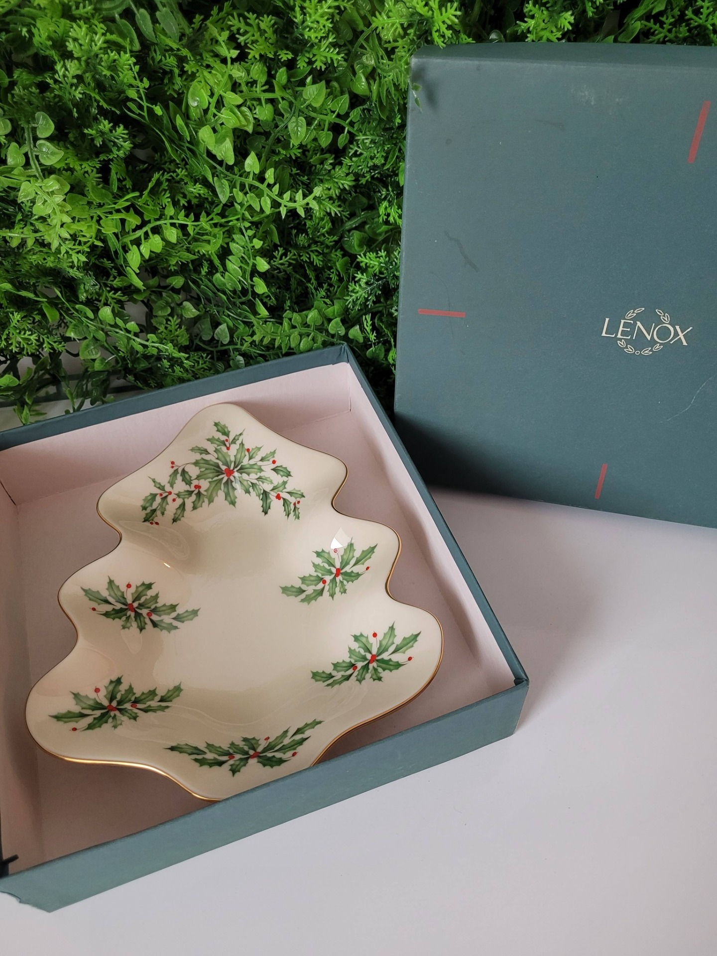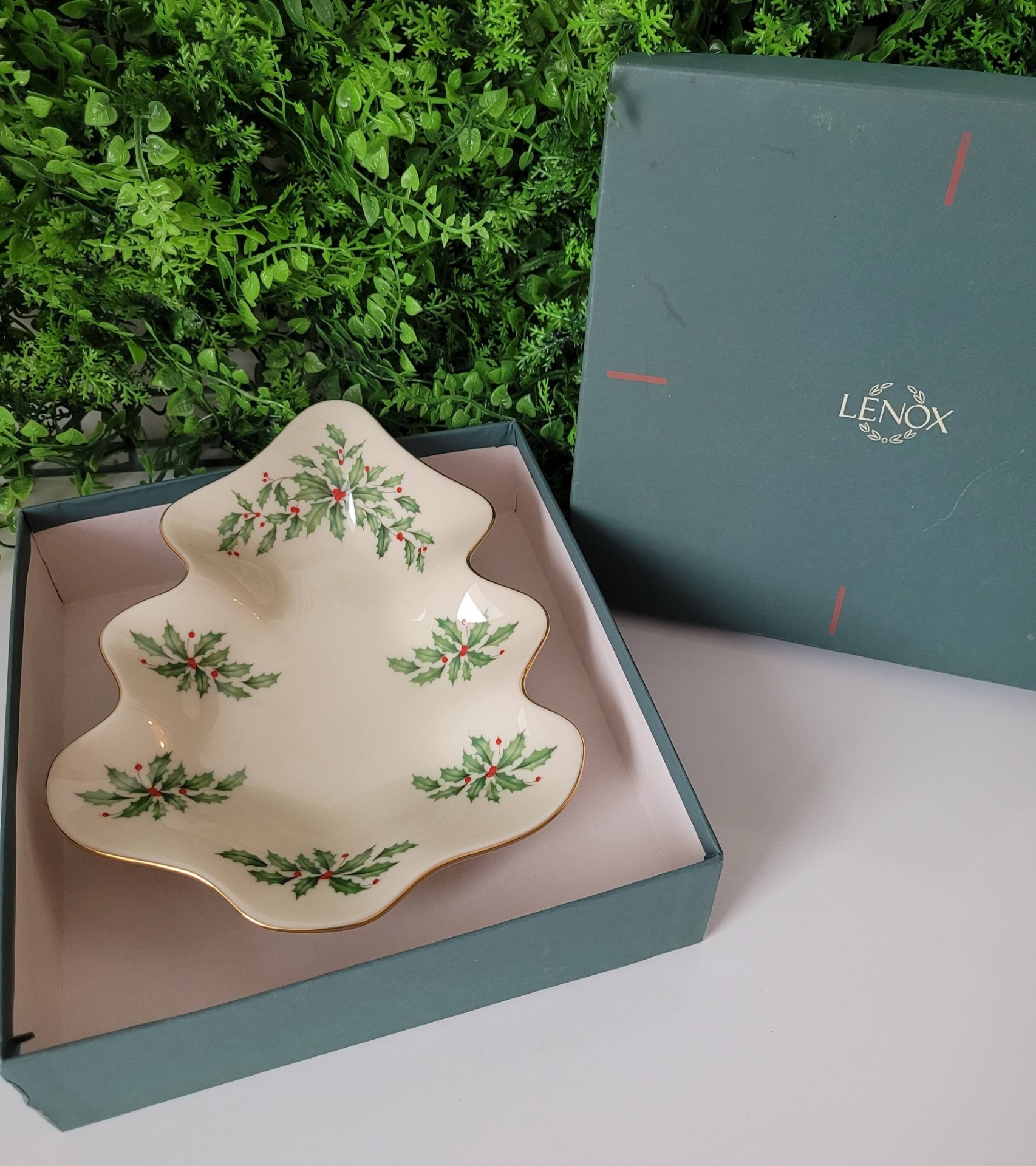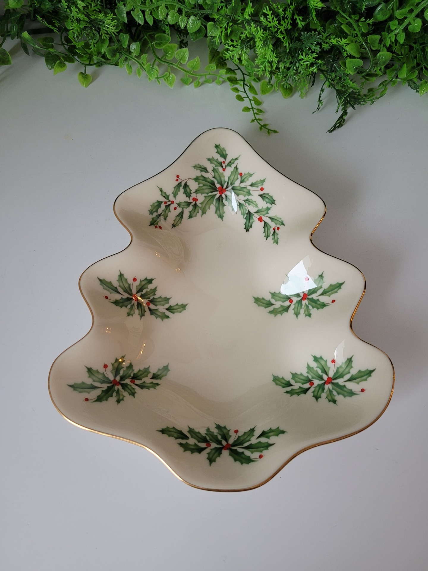 Farfurie vintage Lenox în formă de brad, din porțelan fin de culoarea fildeșului, cu accente din aur de 24K pe margine, în cutie originală.