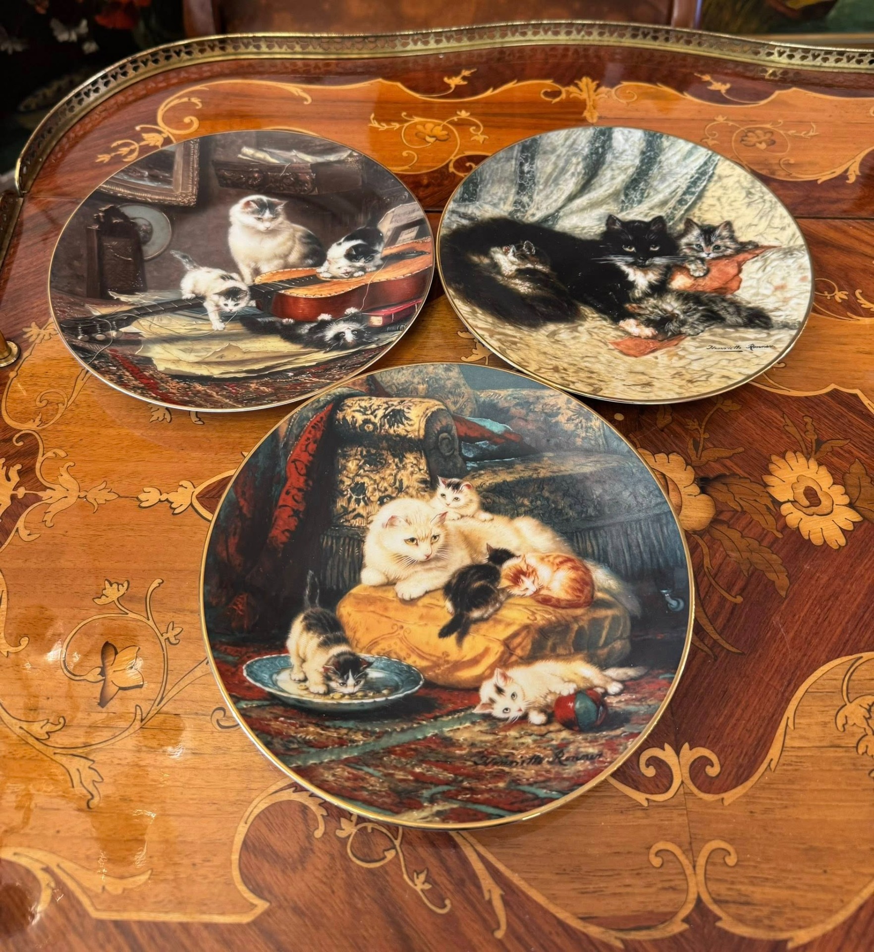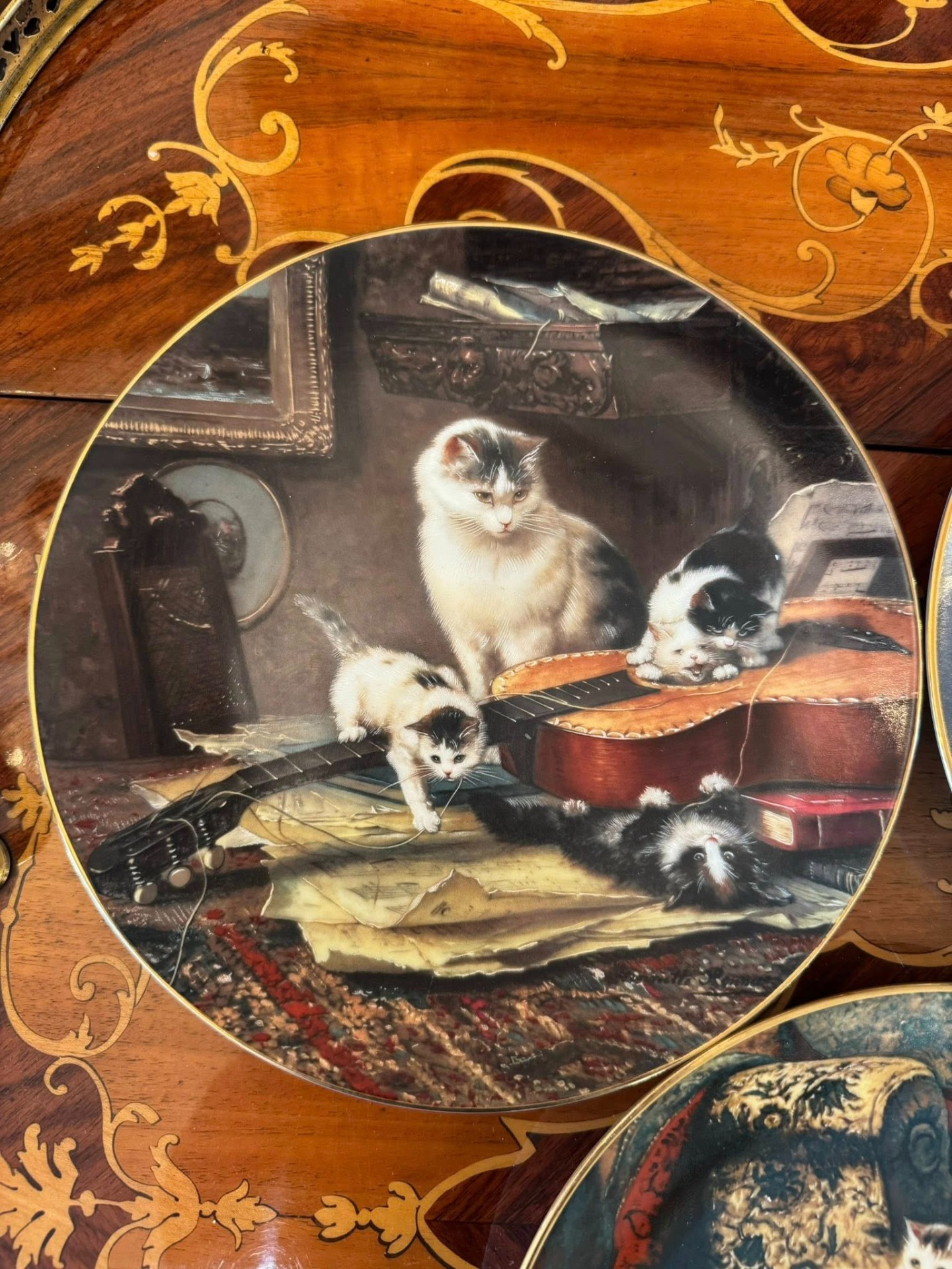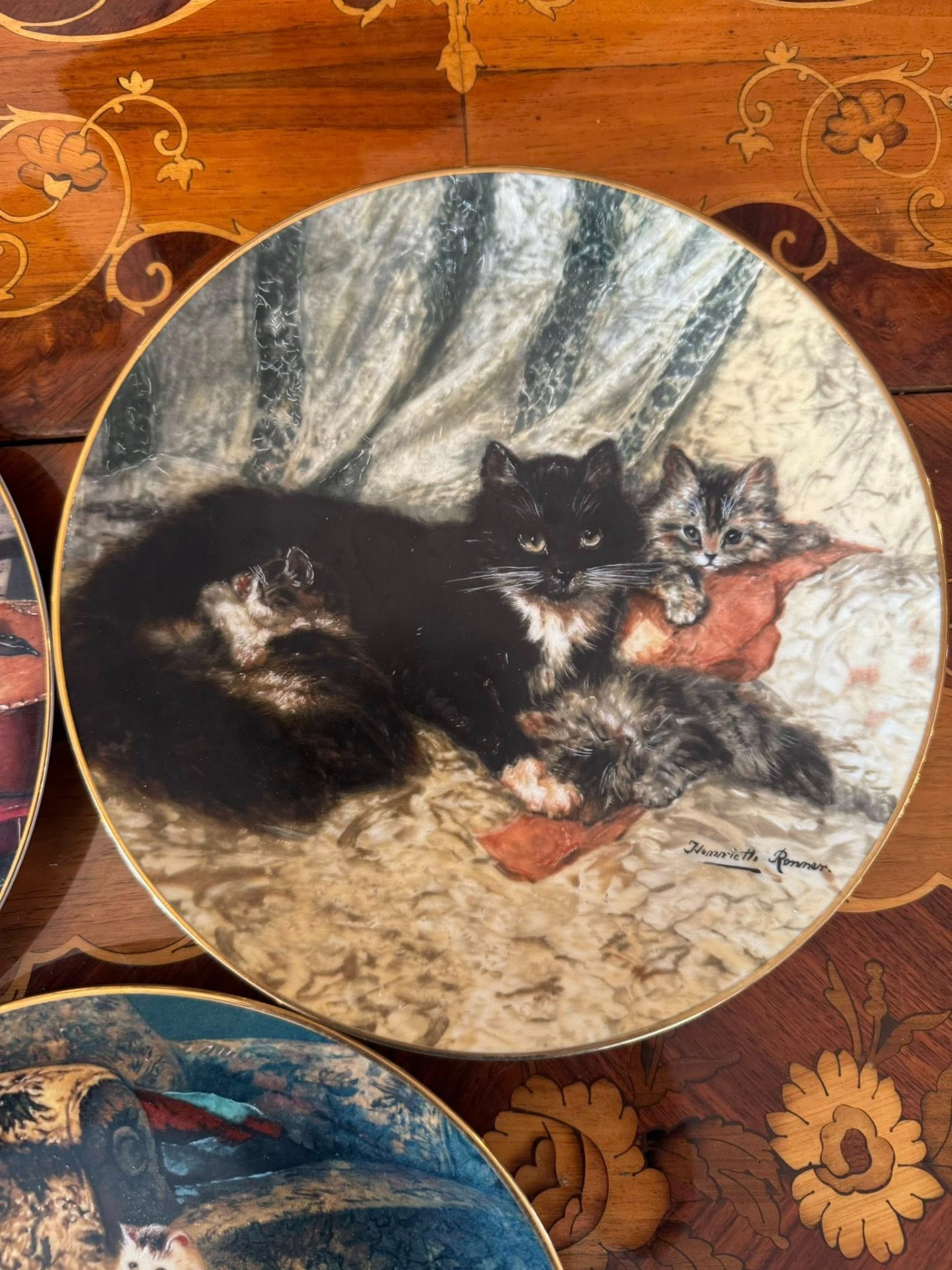 Farfurii decorative din porțelan fin, decorate cu operele celebrei artiste olandeze Henriette Ronner-Knip.