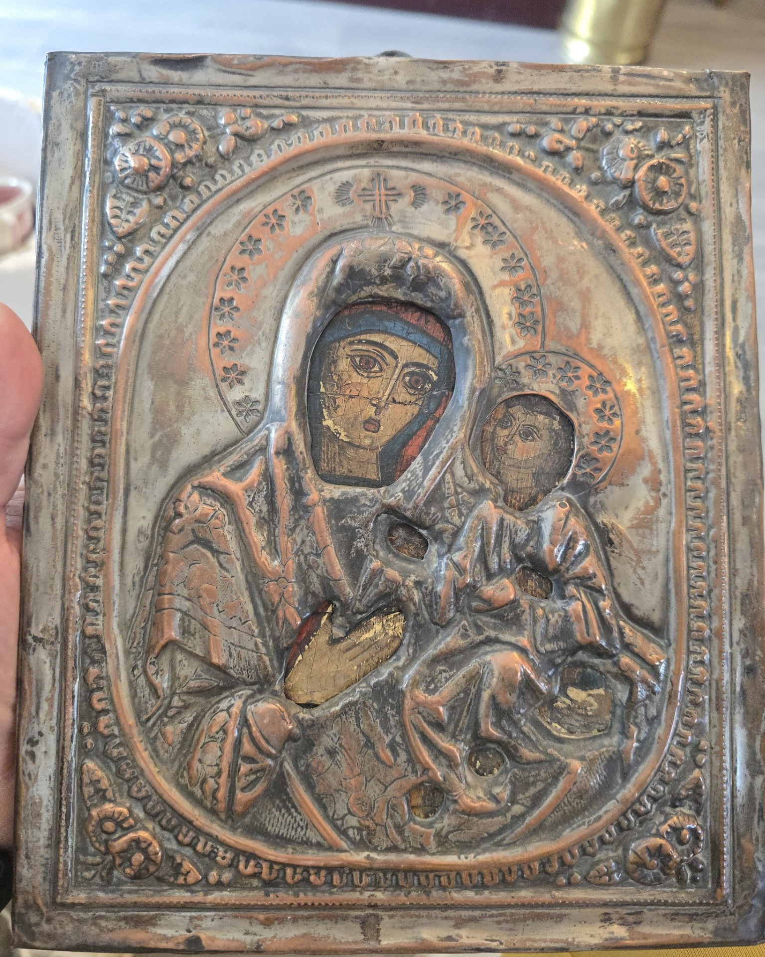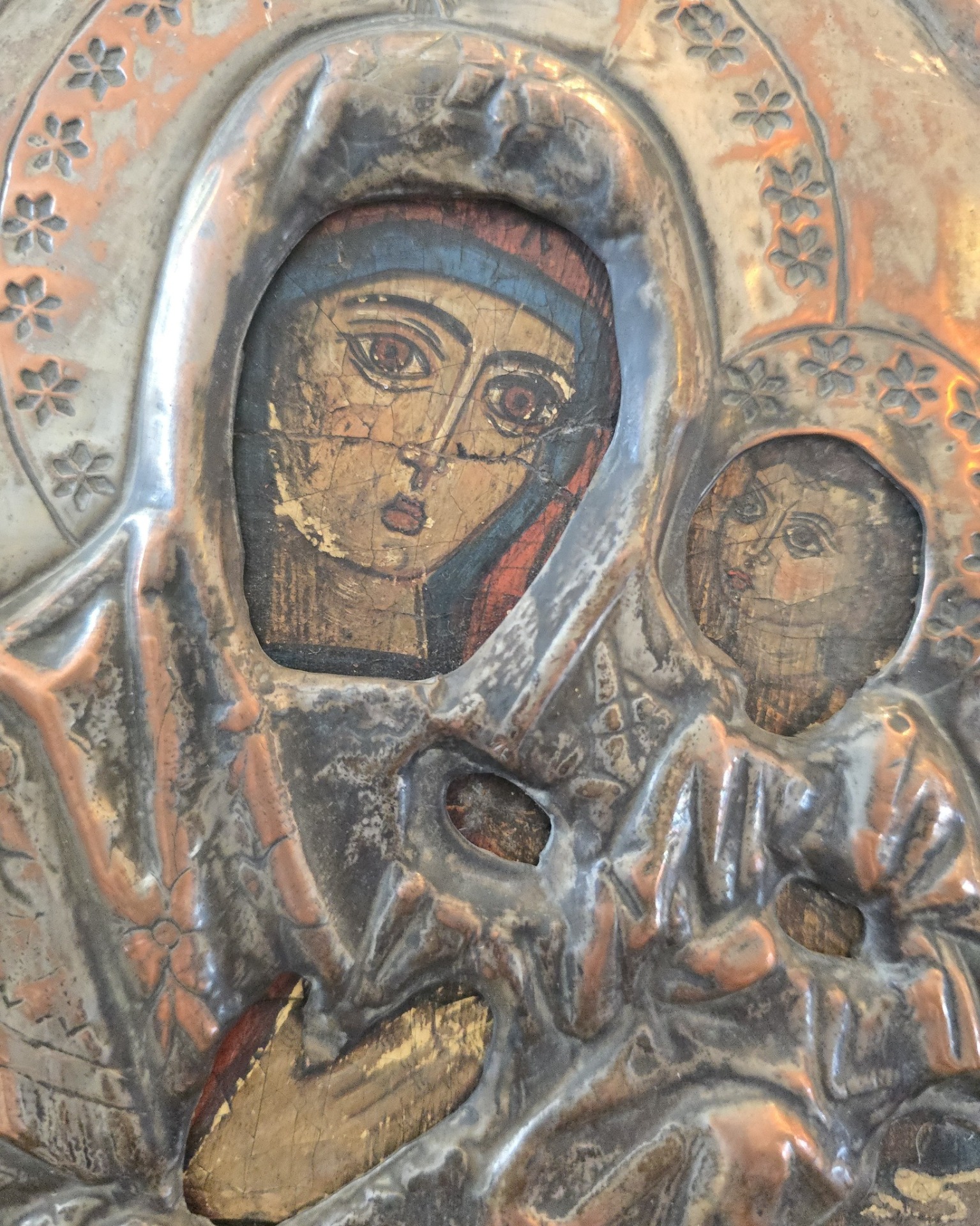 Icoana este acoperită cu o „riză” metalică (probabil cupru argintat sau un aliaj similar). Se observă că stratul de argint s-a uzat în timp, lăsând să se vadă nuanța roșiatică a cuprului dedesubt, ceea ce îi dă o patină autentică.