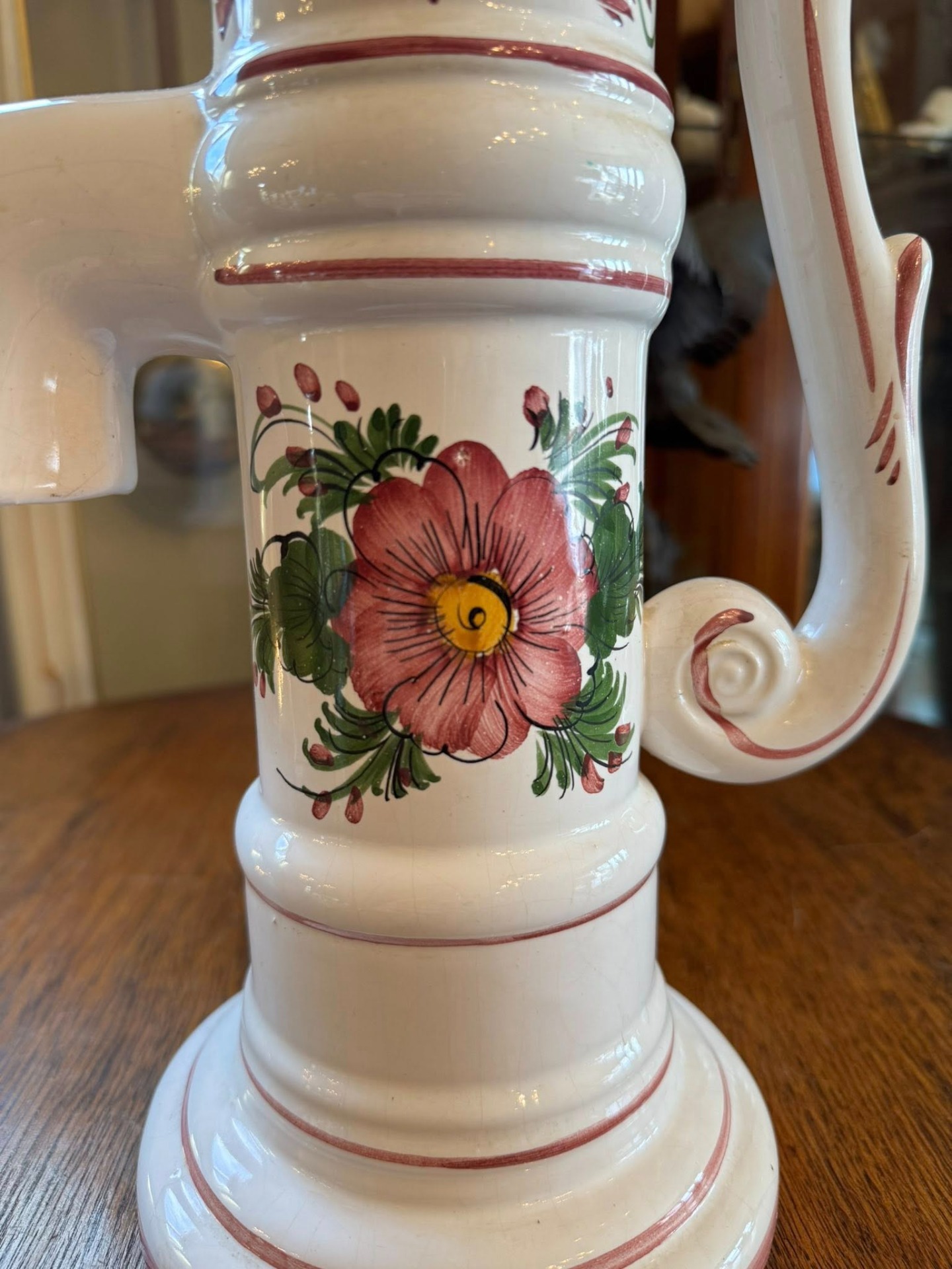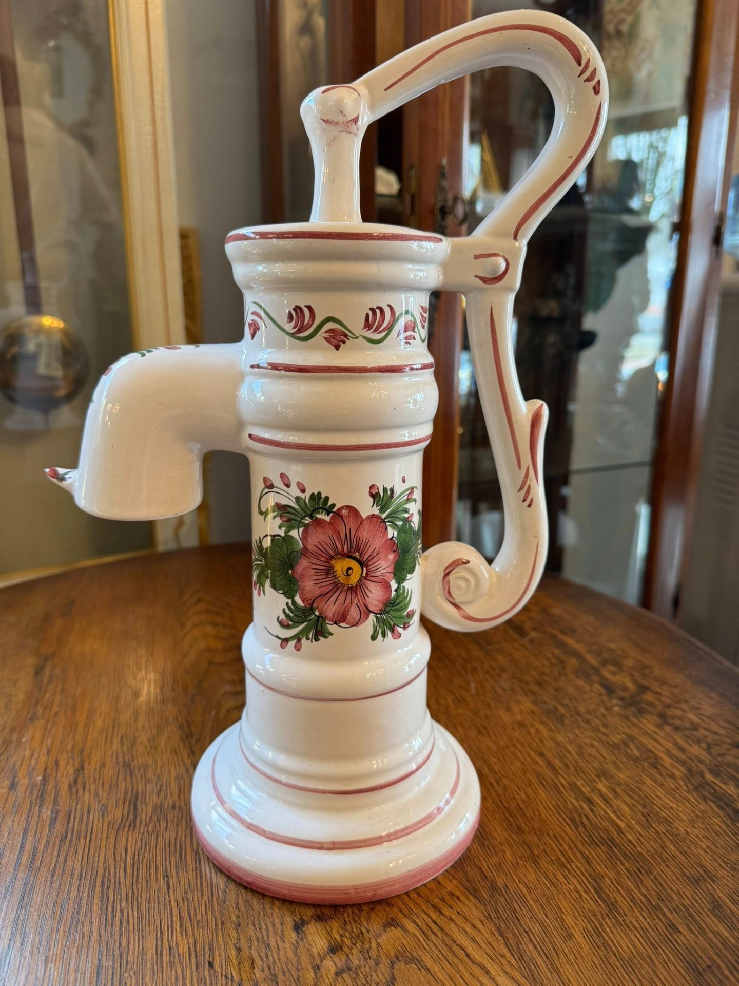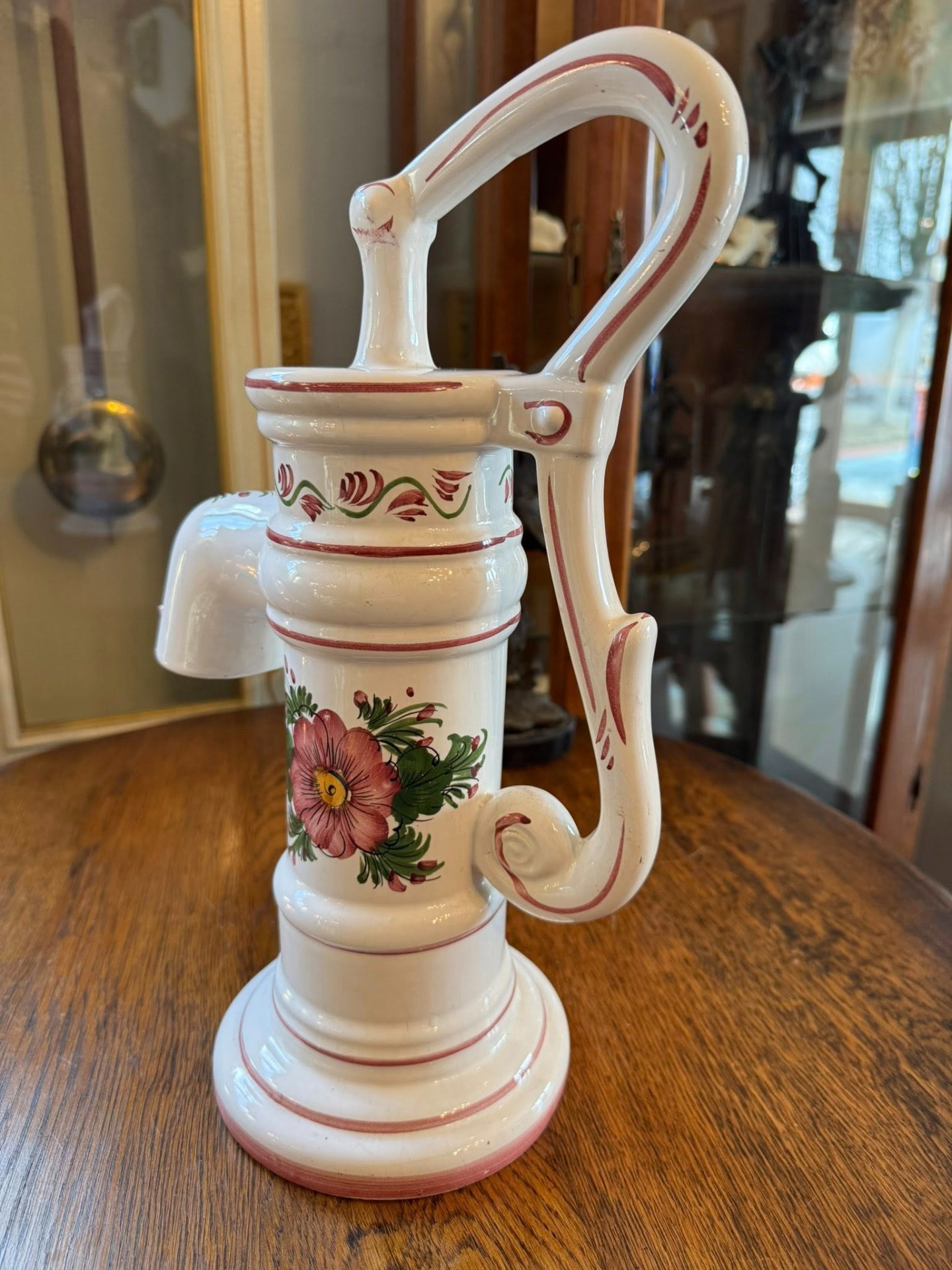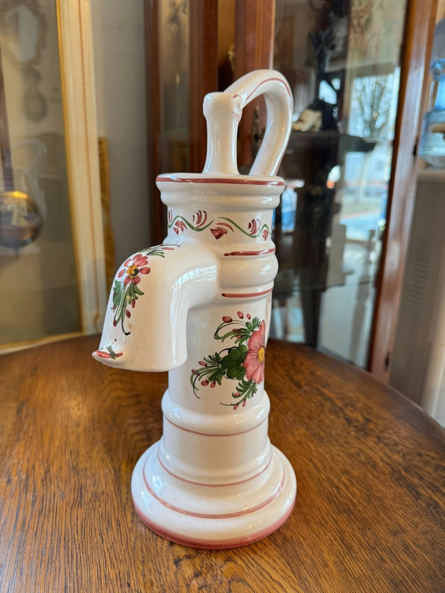 Figurină decorativă din ceramică ce imită forma unei pompe de apă manuale tradiționale, fiind un obiect cu un puternic caracter rustic și decorativ.